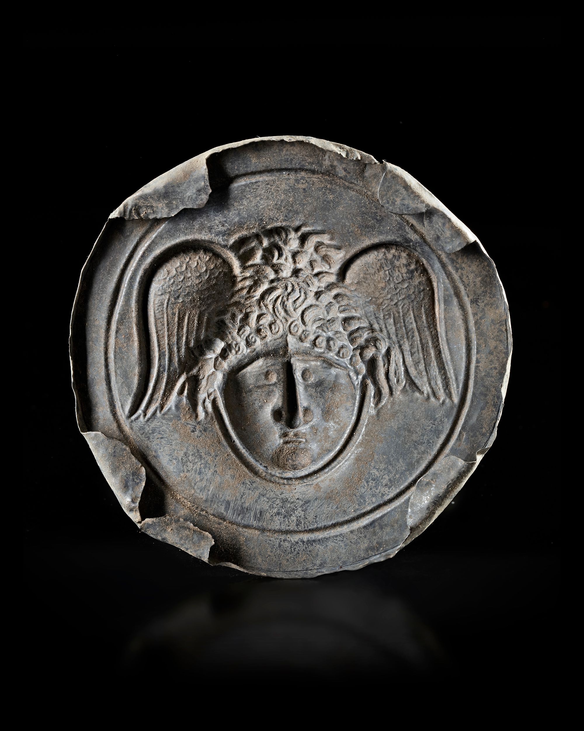 extending towards the forehead, furrowed brow with a pair of wings emerging from the curly hair framing the face, a pair of snakes knotted beneath the chin; wide edge with beaded rim and wavy pointille decoration; accompanied by a discoid bronze sheet to which the fastening pins were attached to.