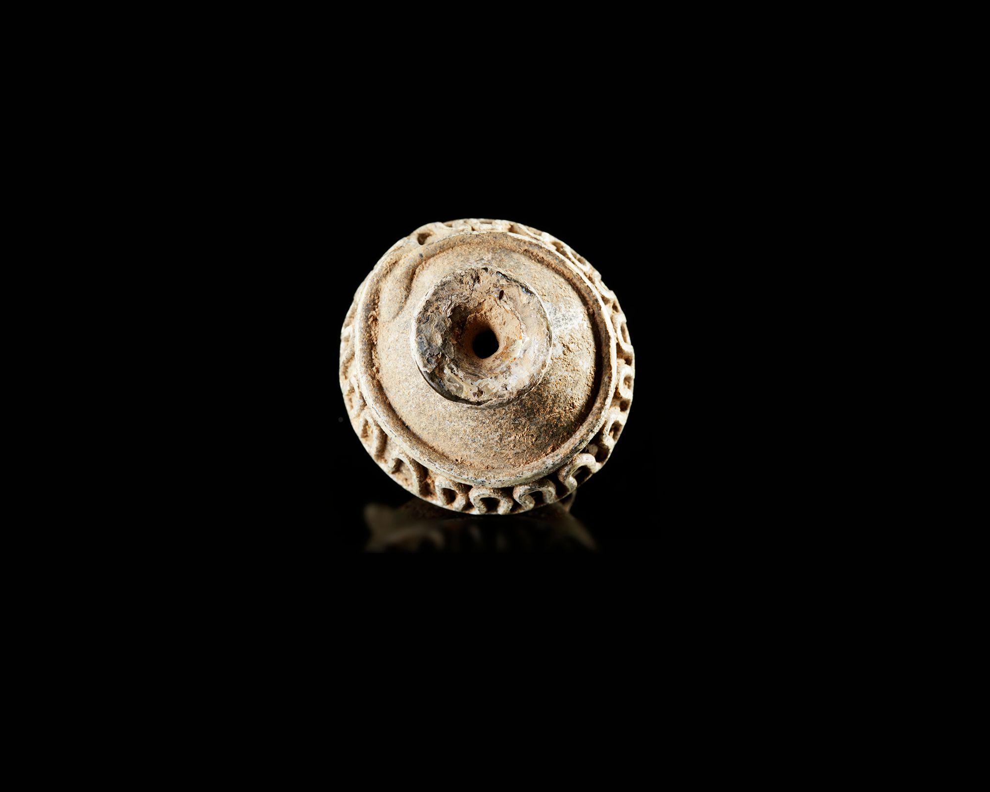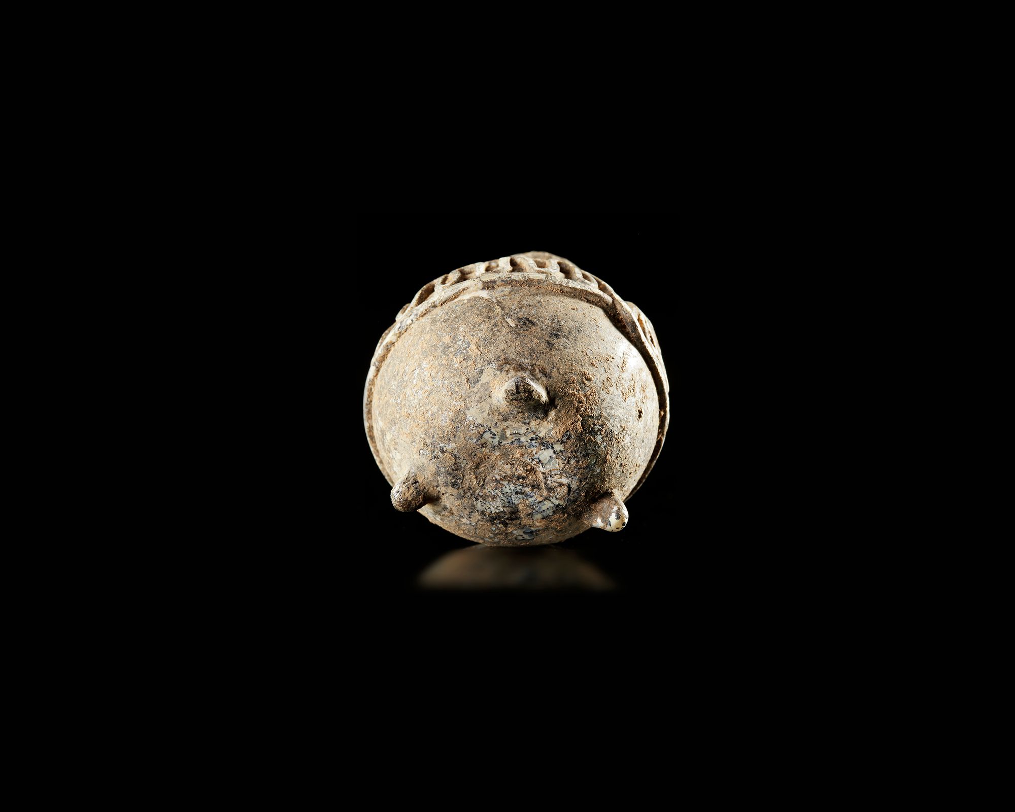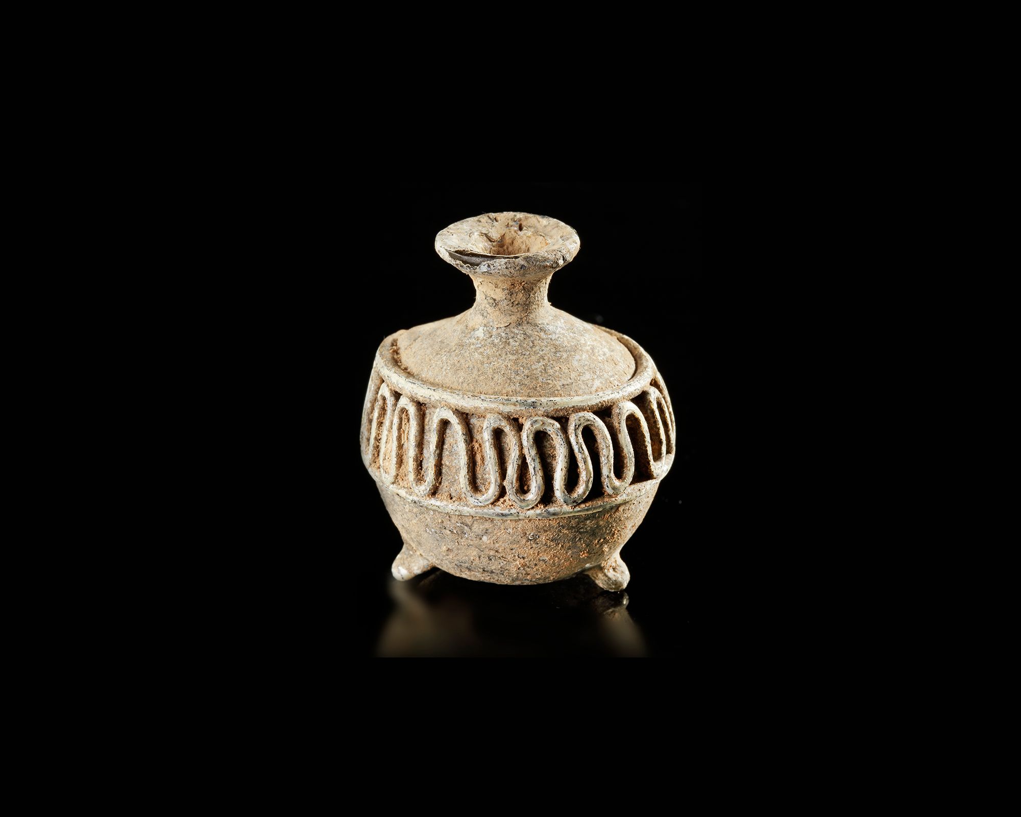 Small tripod flask with a globular body topped by a short, narrow neck that opens wide at the top. Greenish translucent glass decorated with applied fillets on the body forming a band trimmed with a wavy line. Strong iridescence, concretions.