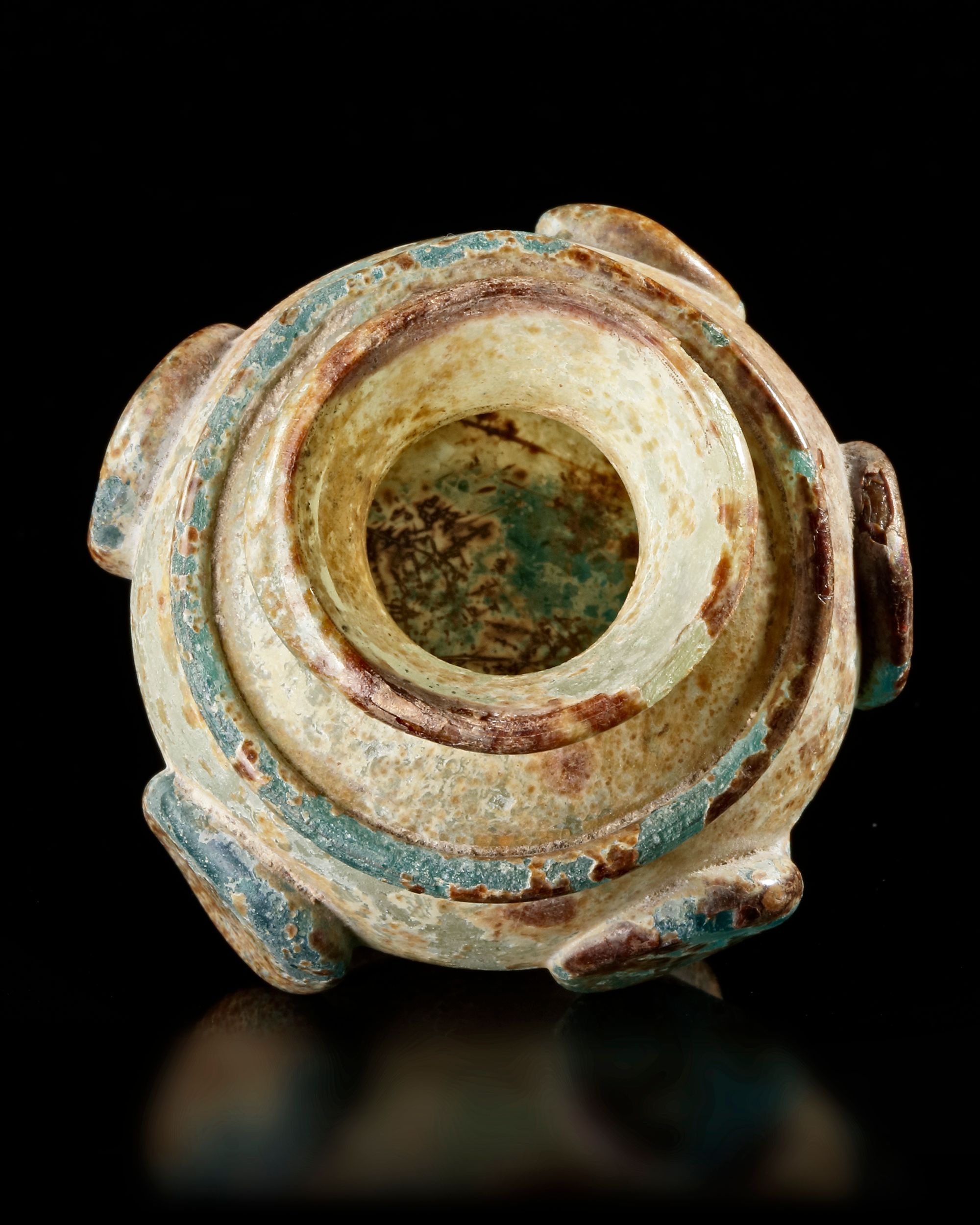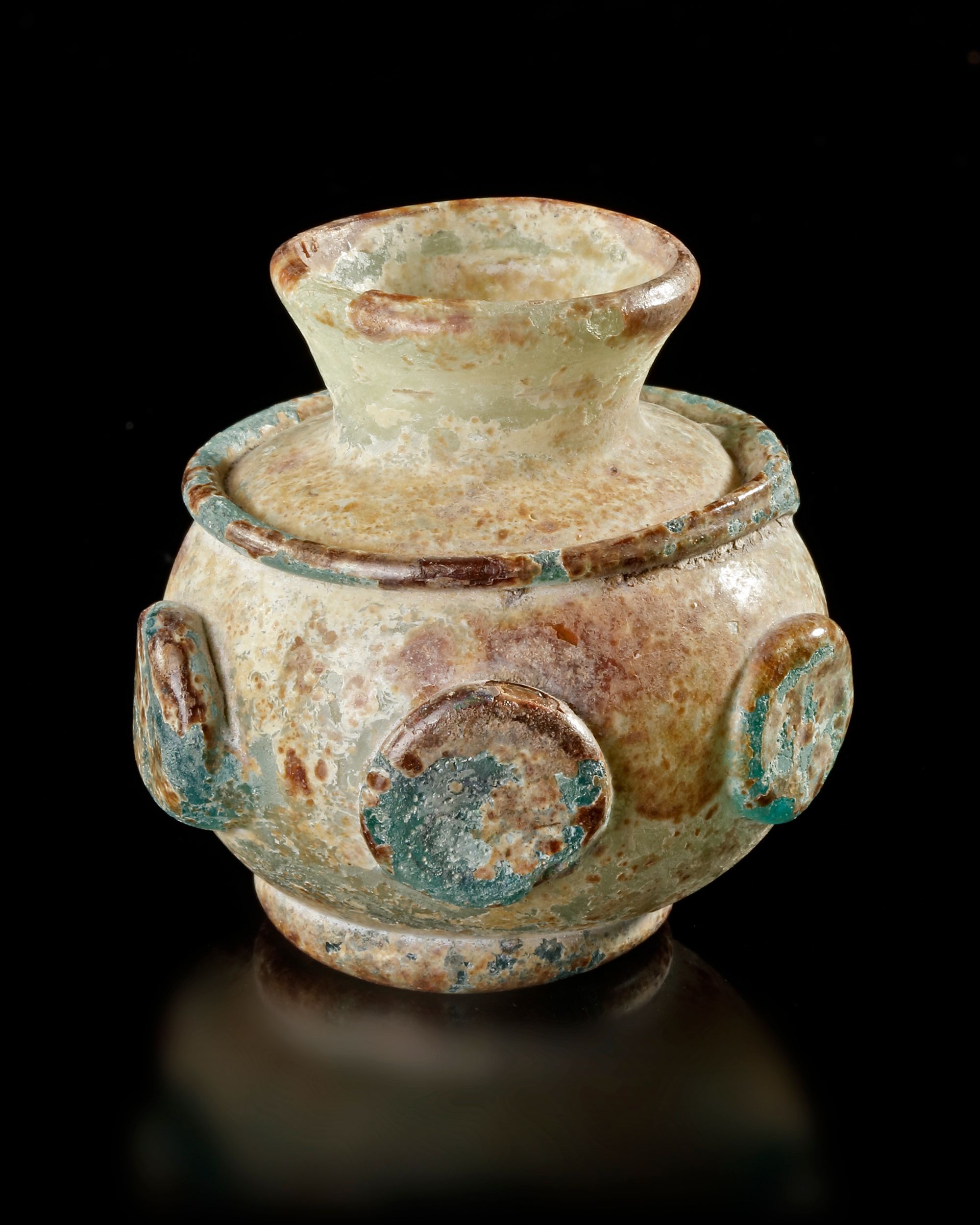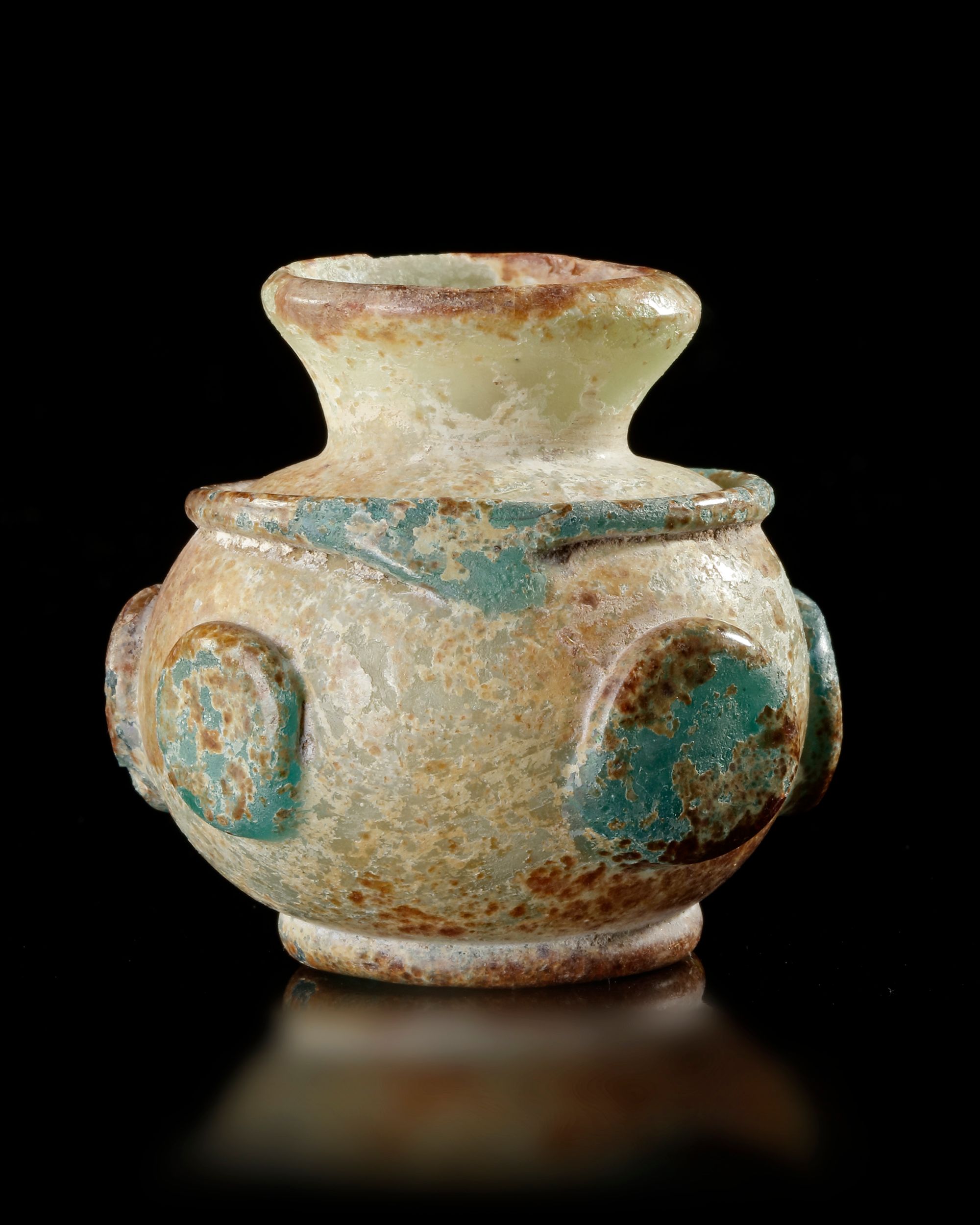 Small globular flask on a small annular foot with a narrow neck, in translucent turquoise glass, decorated with a fillet underlining the upper part of the body and five pastillé discs punctuating the body. Significant iridescence, small chips at the base and on the neck.