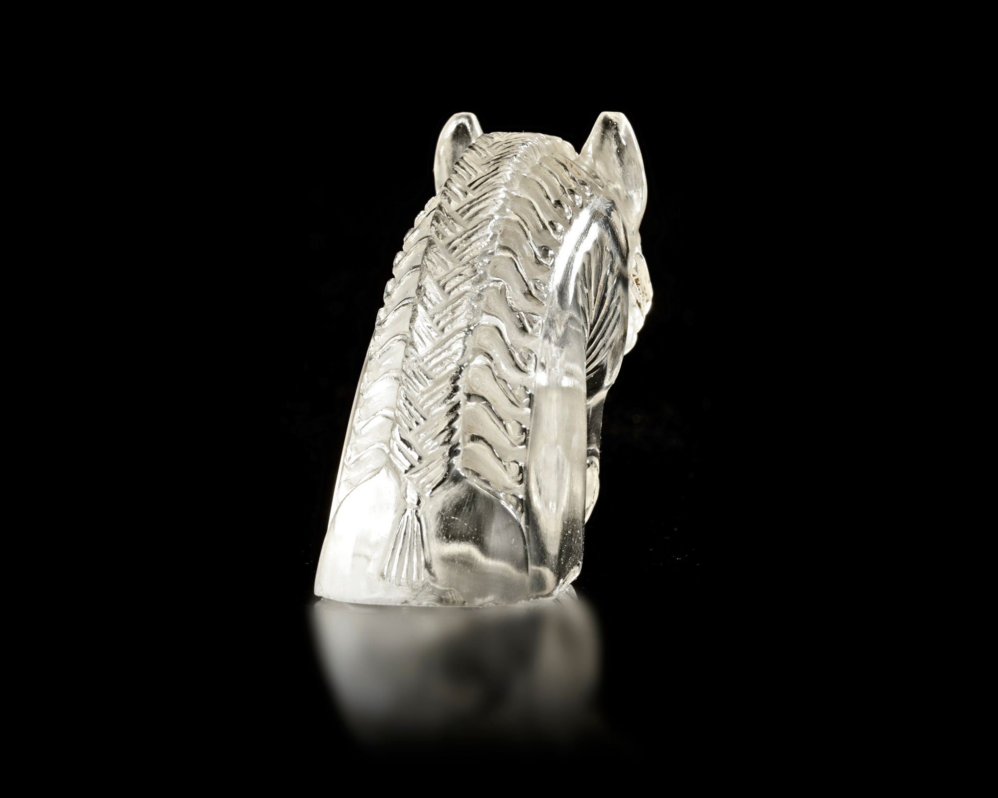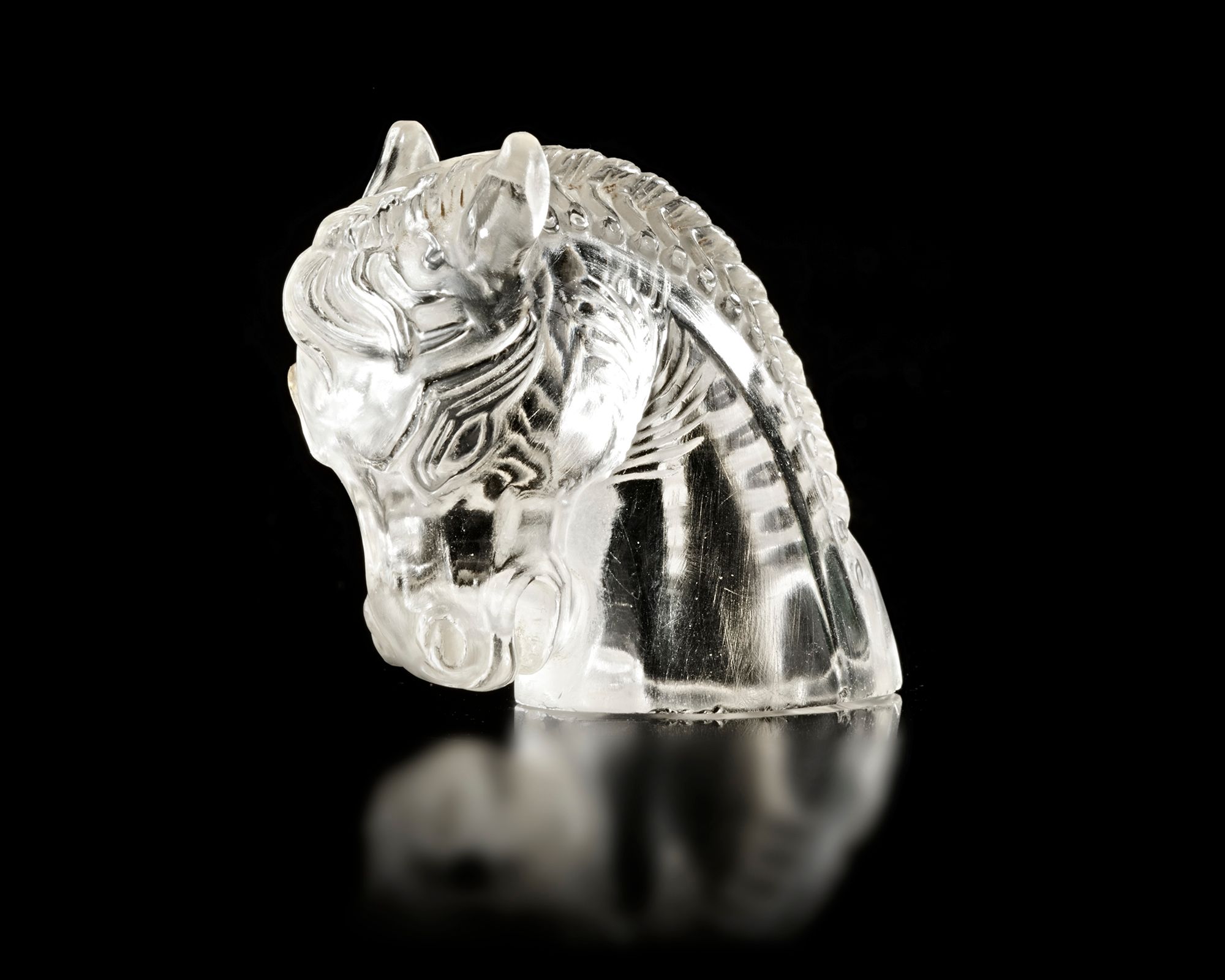 A finely carved Indian rock crystal sculpture depicting the head of a horse, rendered with remarkable clarity and precision. With flowing mane and defined facial features.