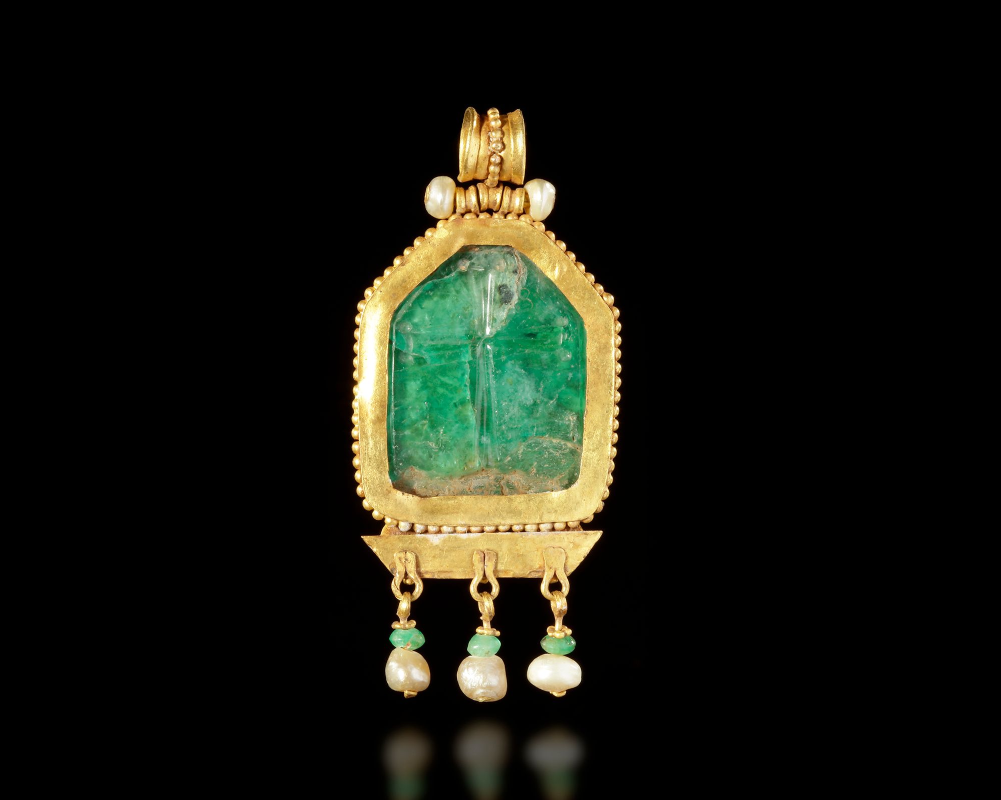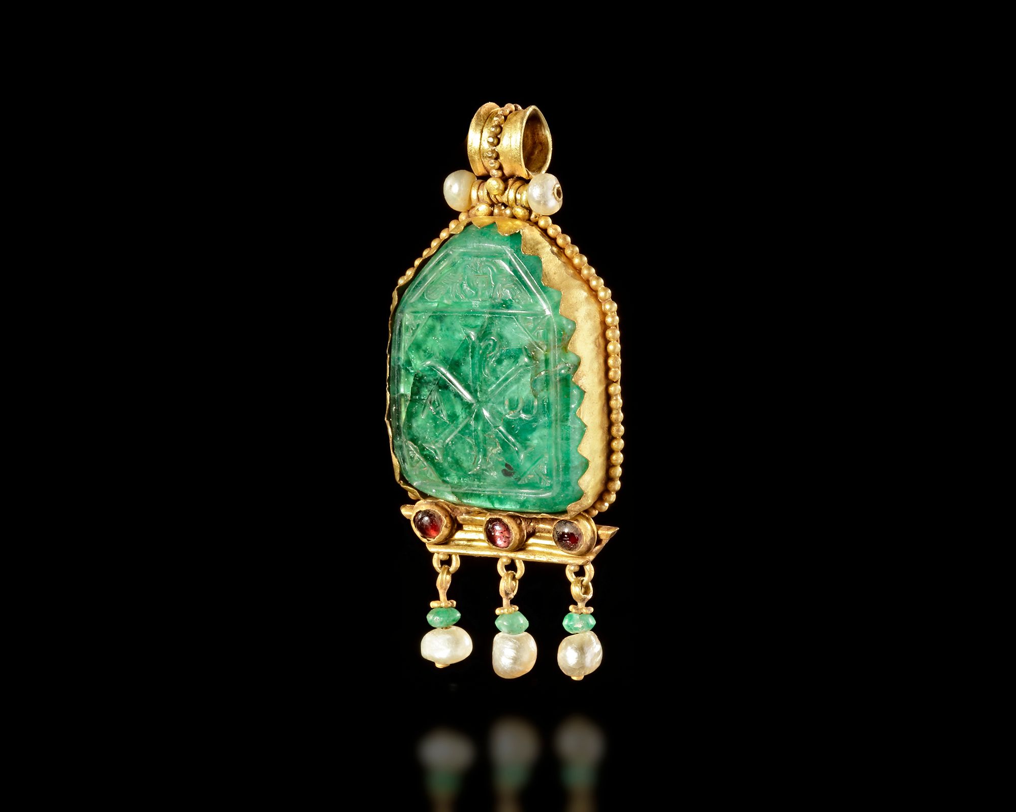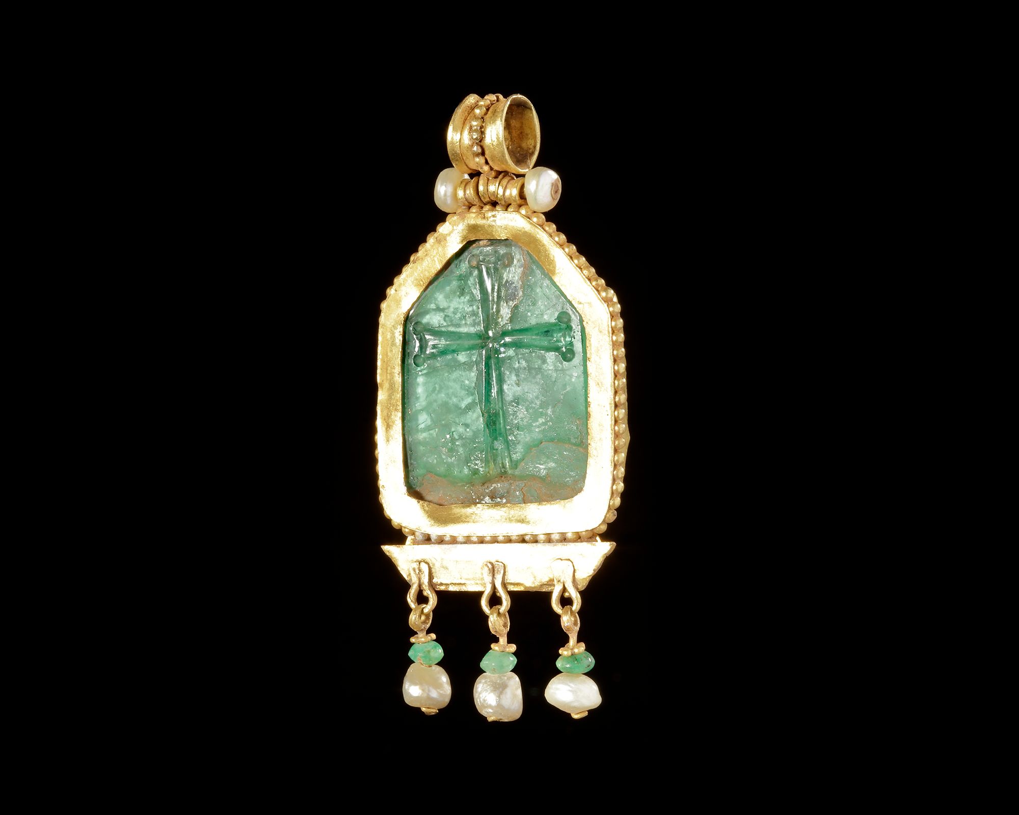 Byzantine gold pendant, centered by a large emerald intaglio carved in the architectural outline of a church and engraved with the sacred Christogram (Chi-Rho).