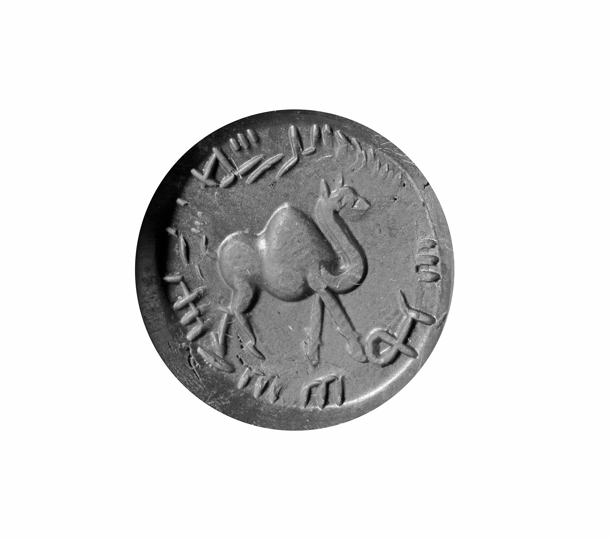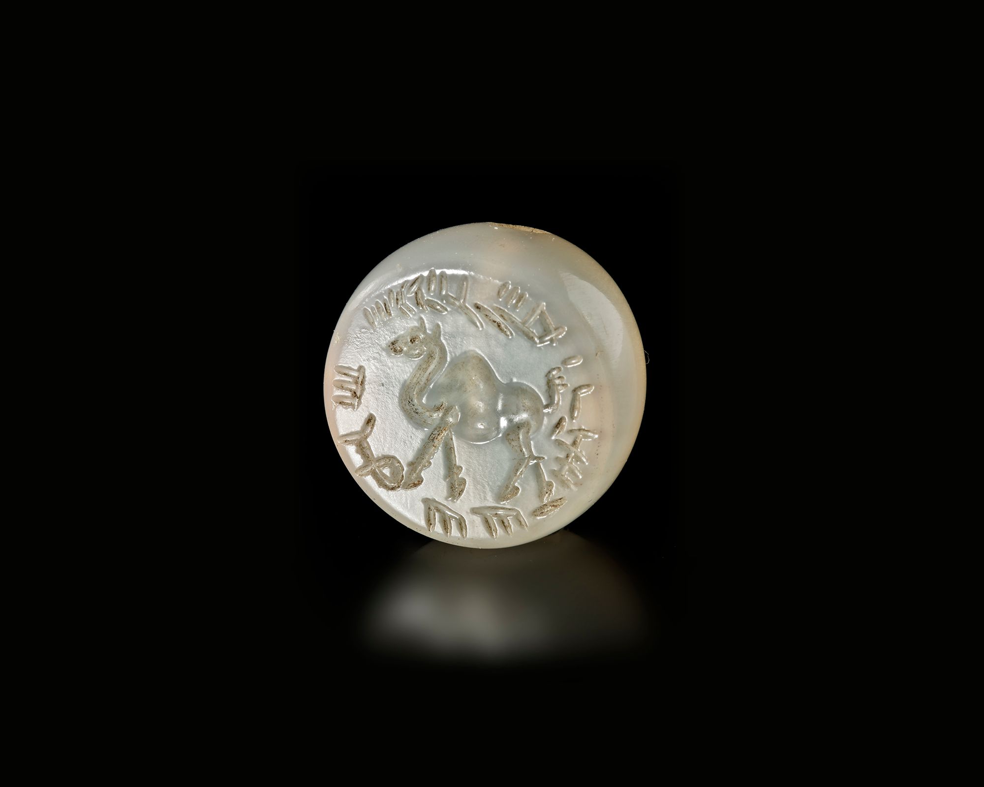 Sassanian gray chalcedony stamp seal depicting a walking camel, framed by linear symbols typical of Sassanian glyptic art.