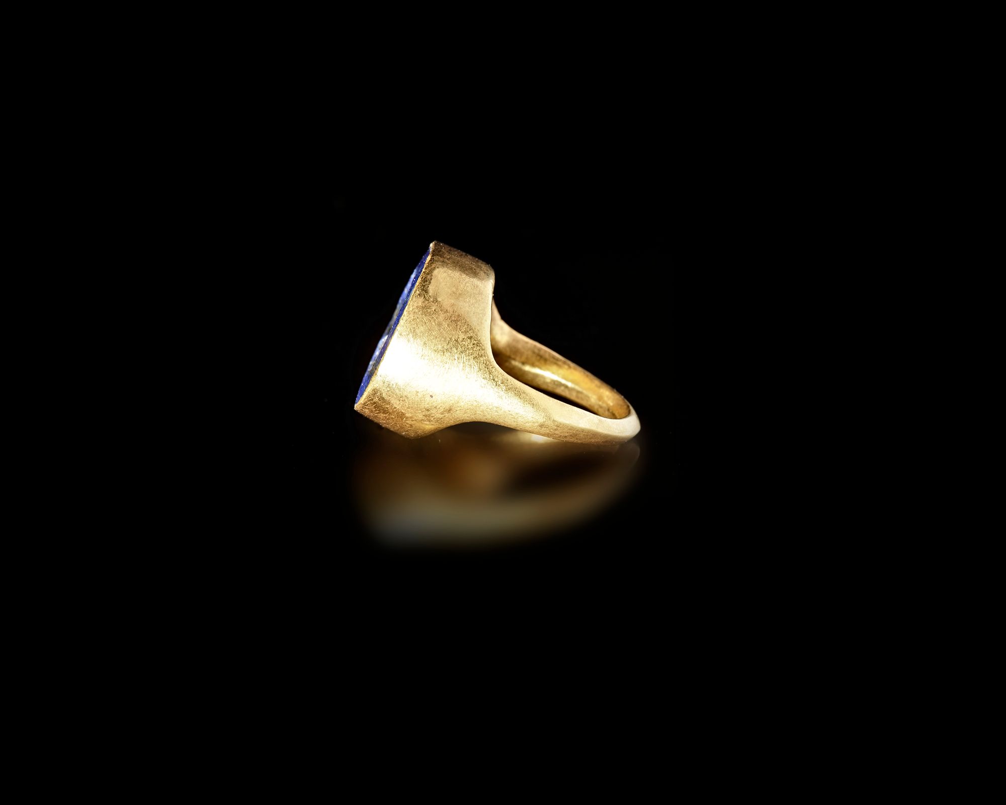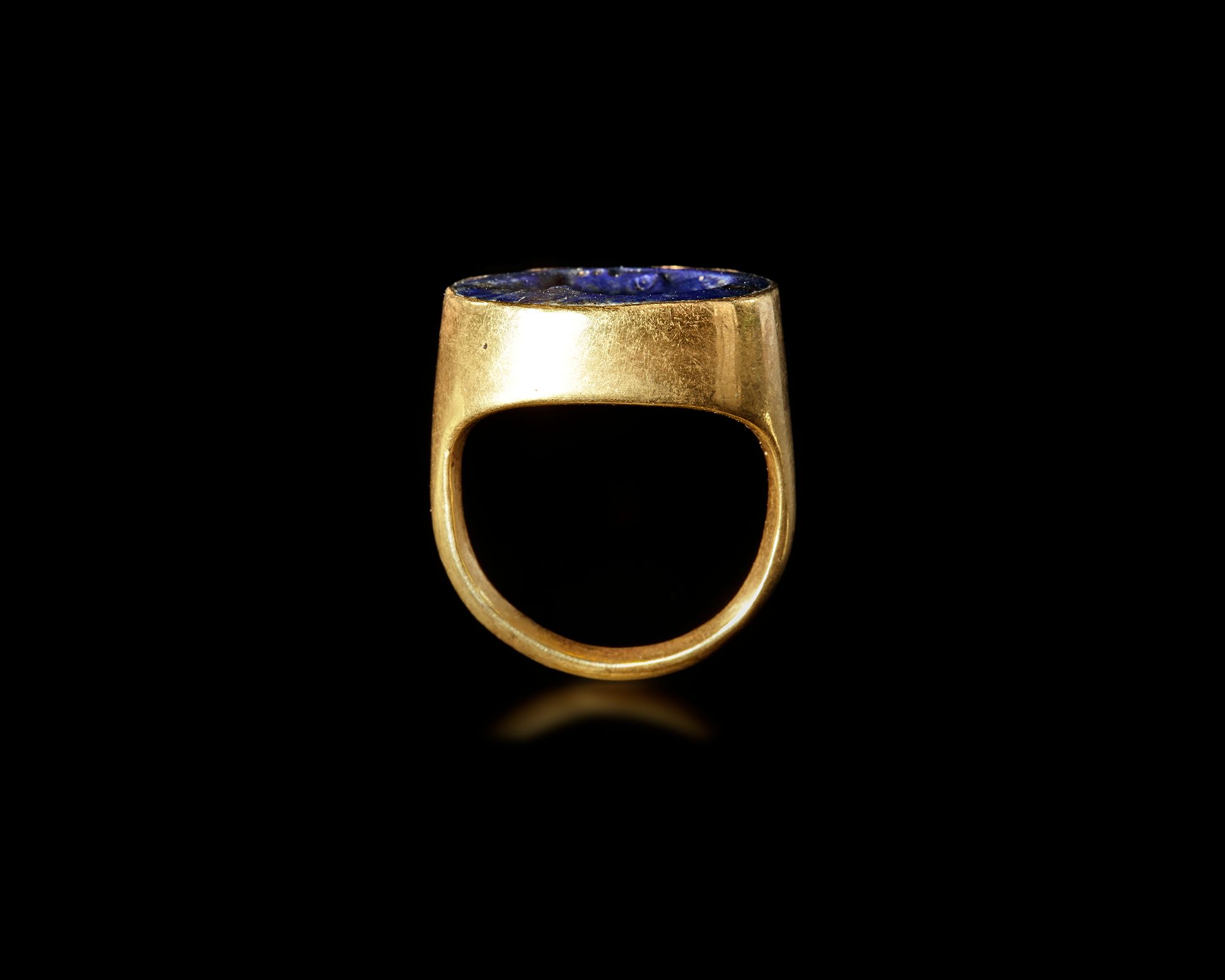 Ptolemaic gold ring set with a deep-blue lapis lazuli intaglio portraying a Hellenistic royal woman, traditionally associated with Arsinoë.