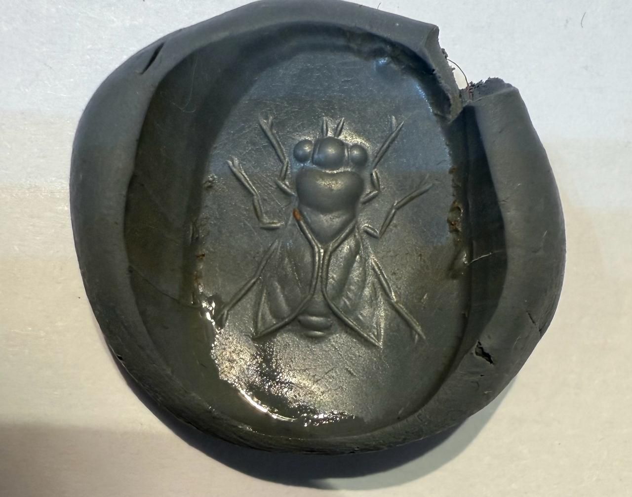 Greek orange carnelian scaraboid finely engraved with the image of a fly, a motif associated with realism and everyday life in Classical glyptic art.