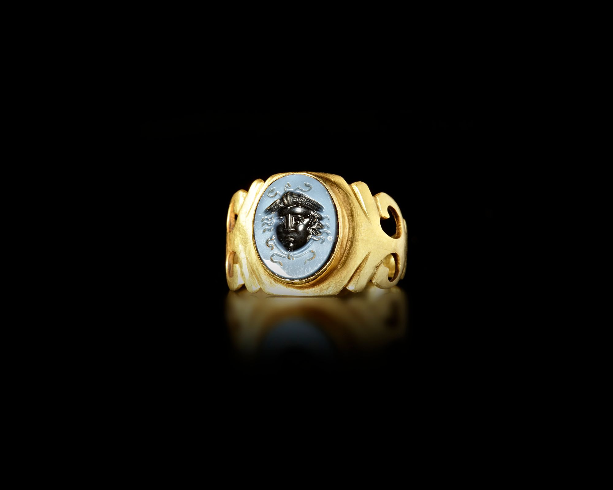 The contrast between the pale and dark layers of the nicolo stone highlights the detailed carving of the Gorgon’s face, a motif believed to offer protection to its wearer.