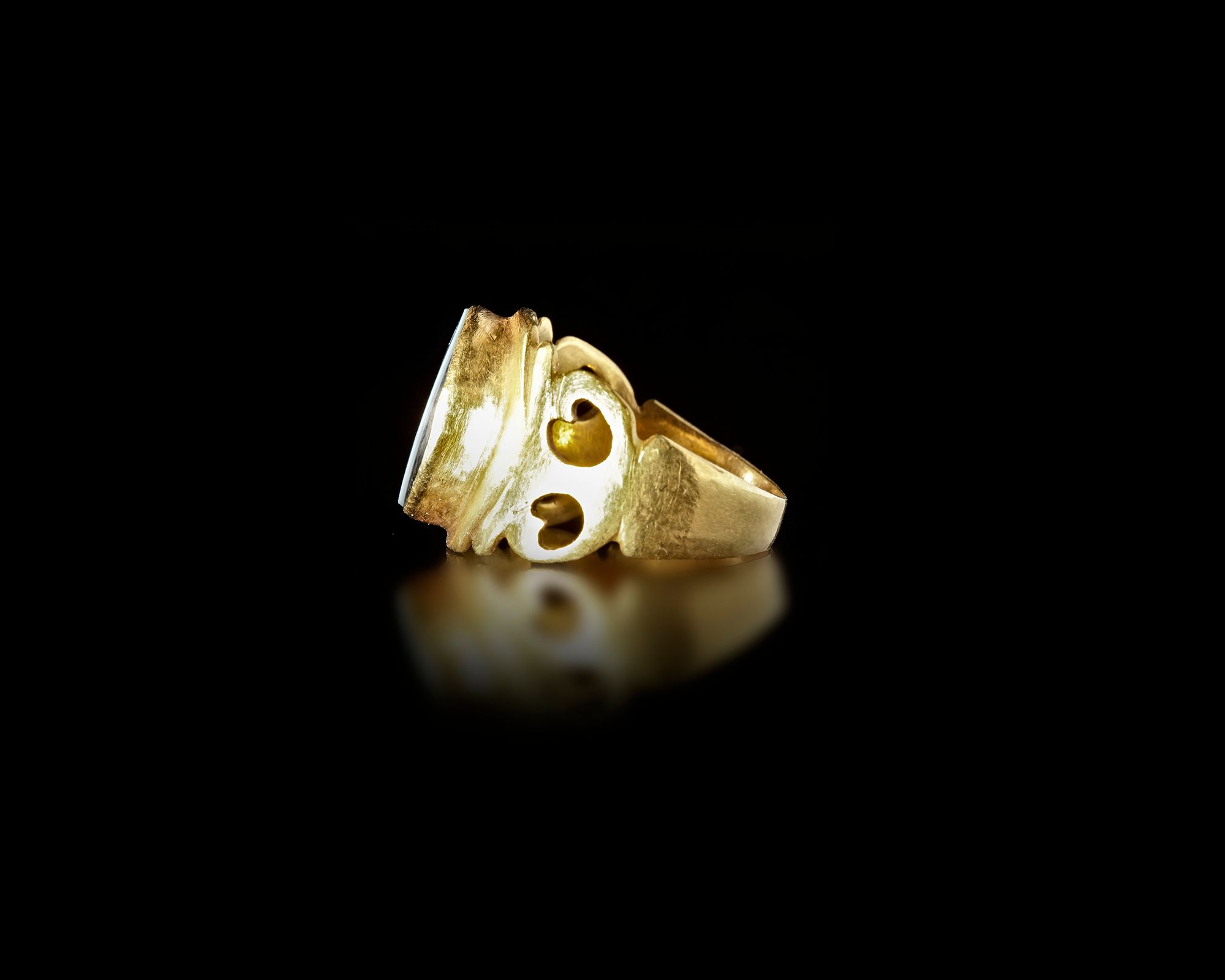 Roman gold ring featuring an elegant openwork shoulder design and set with a finely engraved nicolo intaglio depicting Medusa.