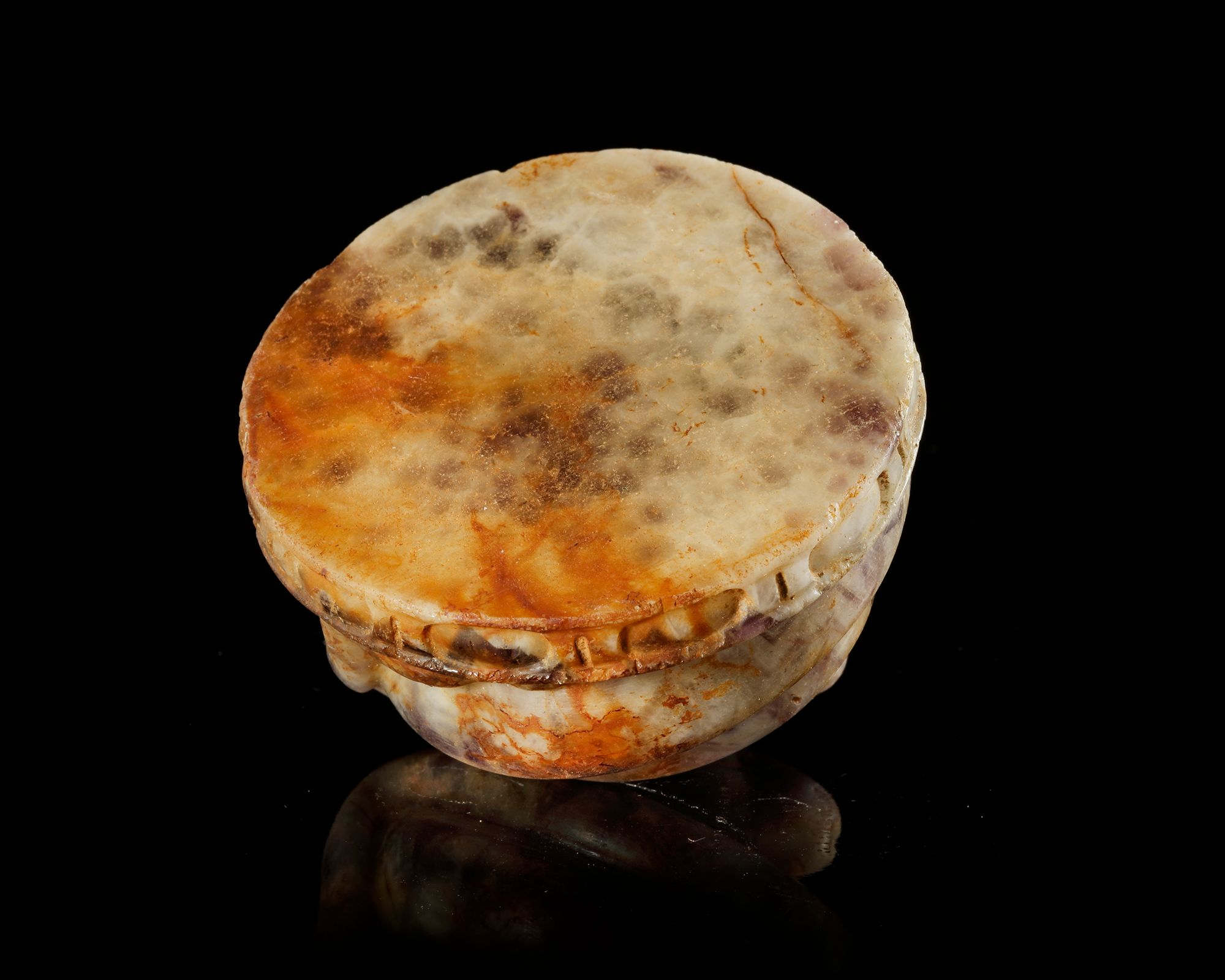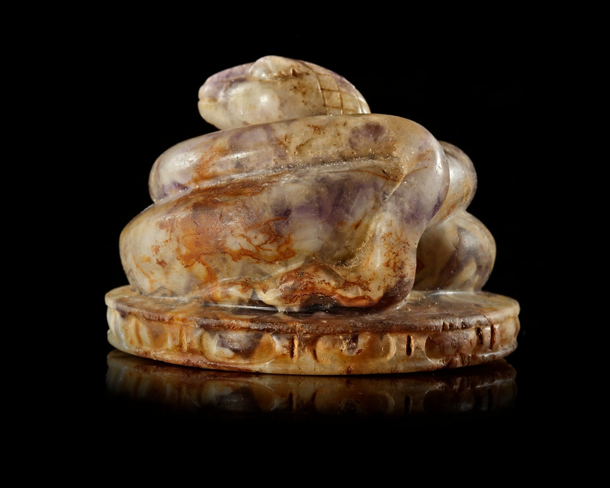 Roman sculpture carved from richly banded amethyst, depicting a coiled serpent with detailed scales and a poised, alert head.
