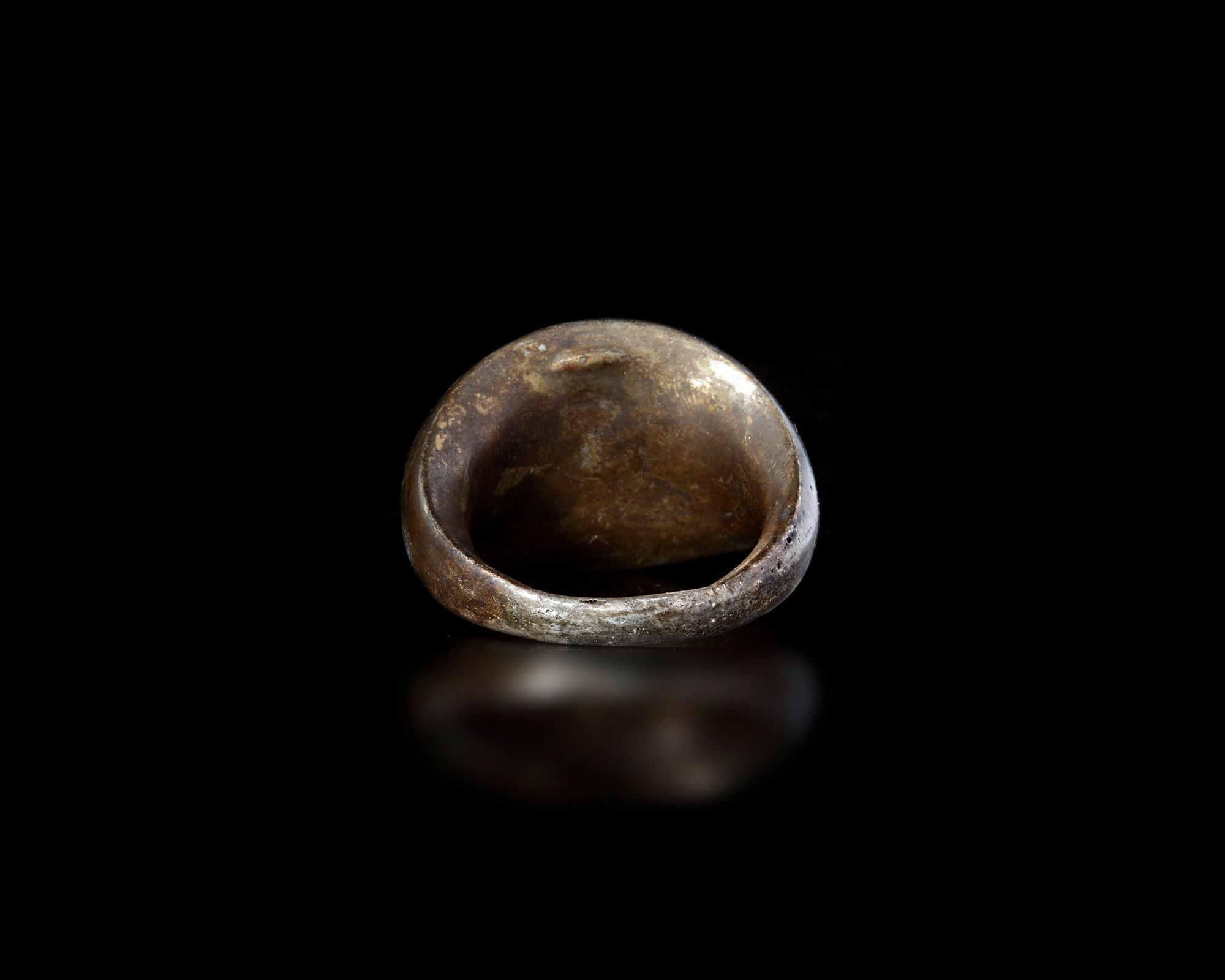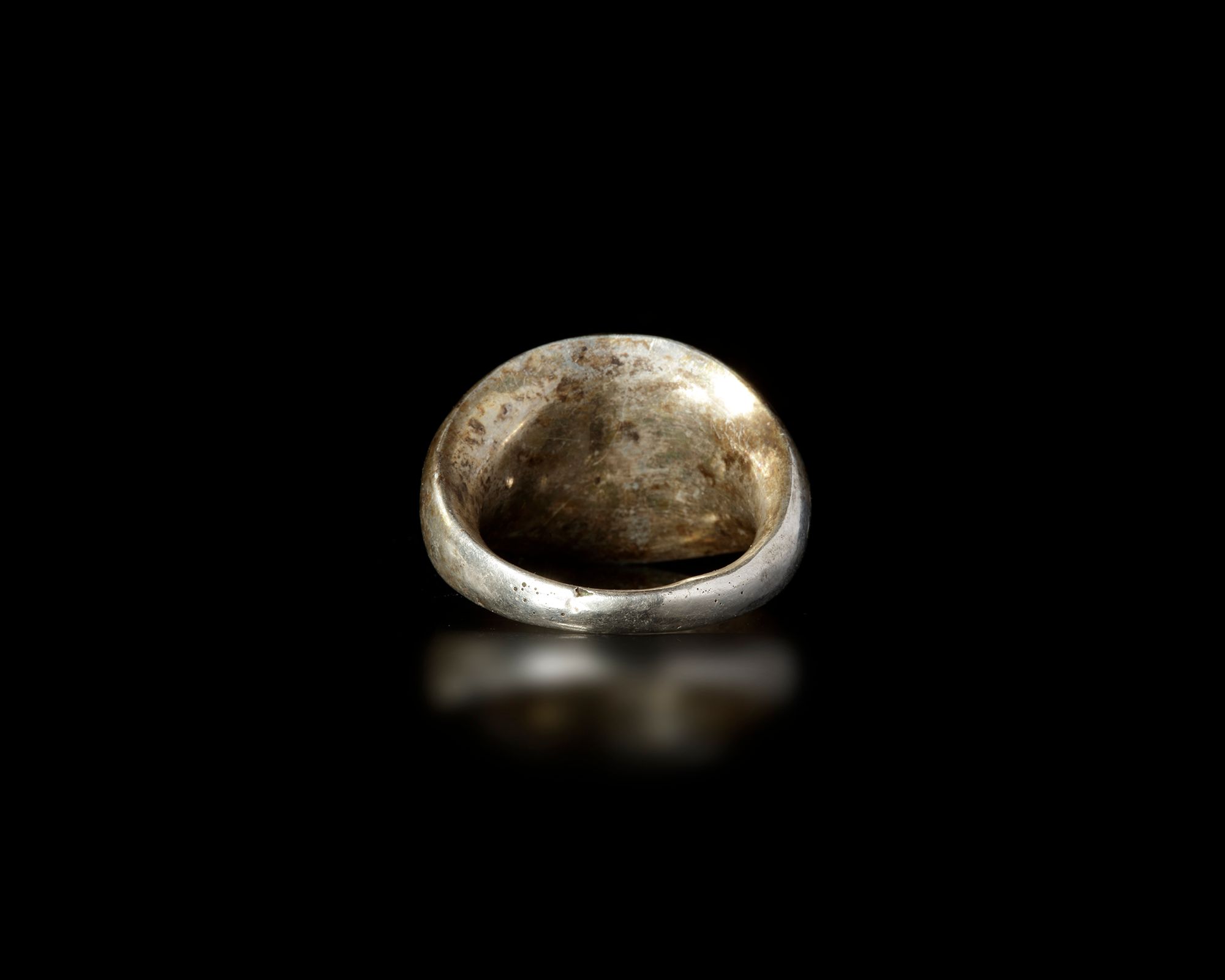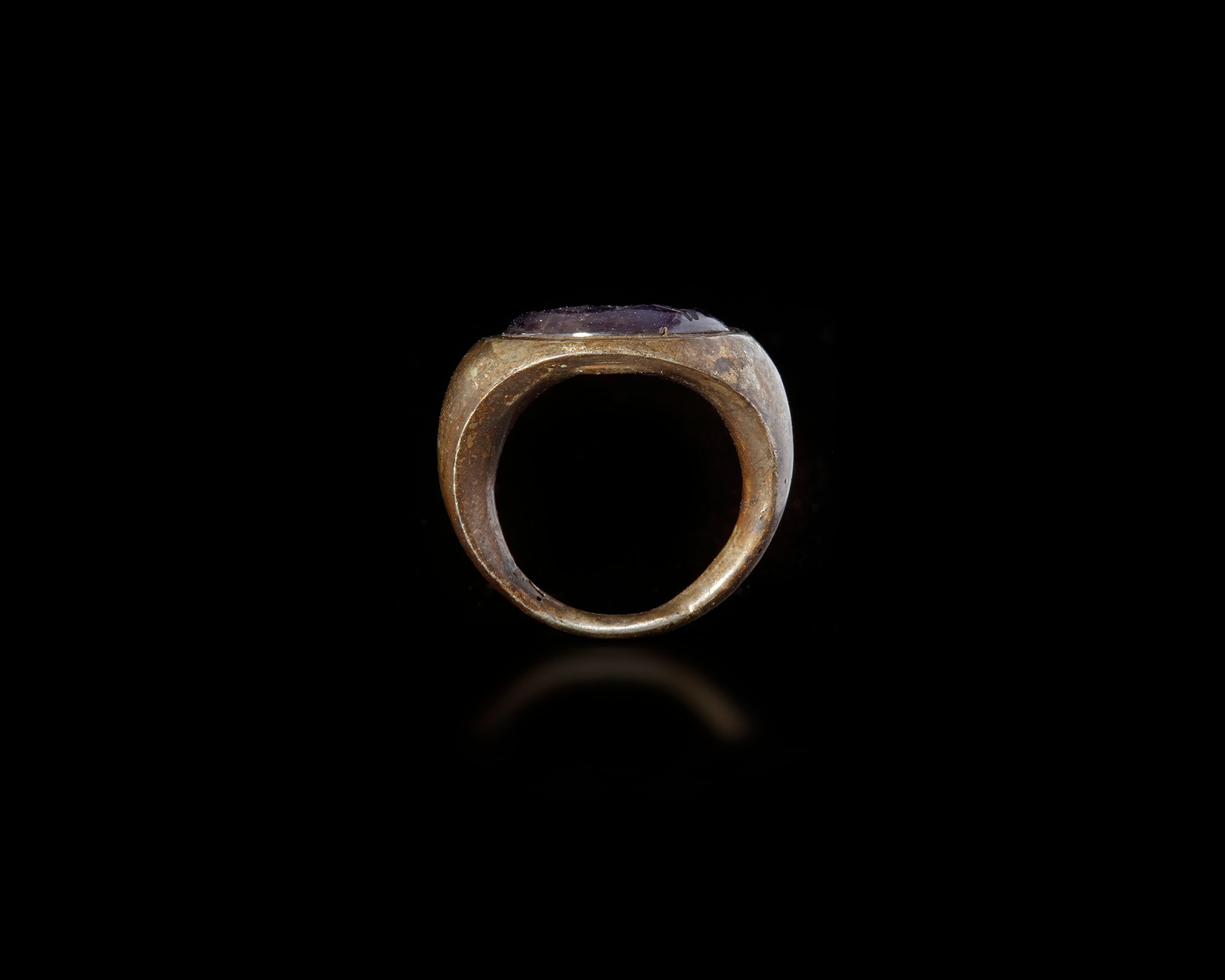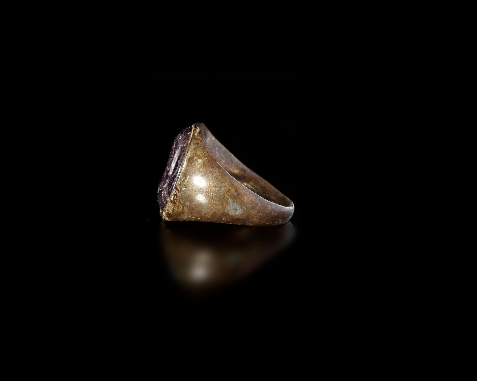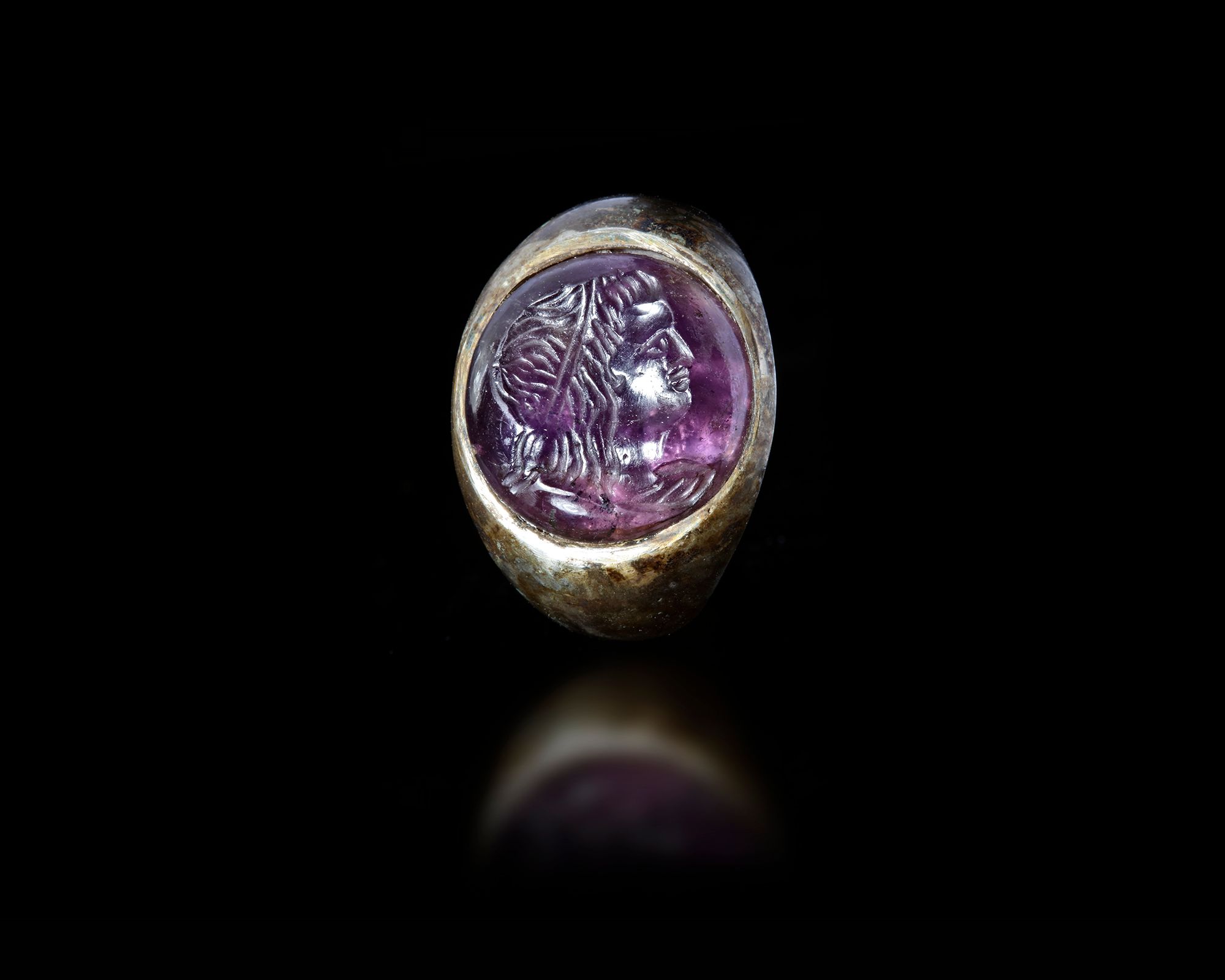 A solid silver ring set with a deep purple intaglio portraying a classical male figure in profile. The carved portrait shows detailed hair and strong facial features.