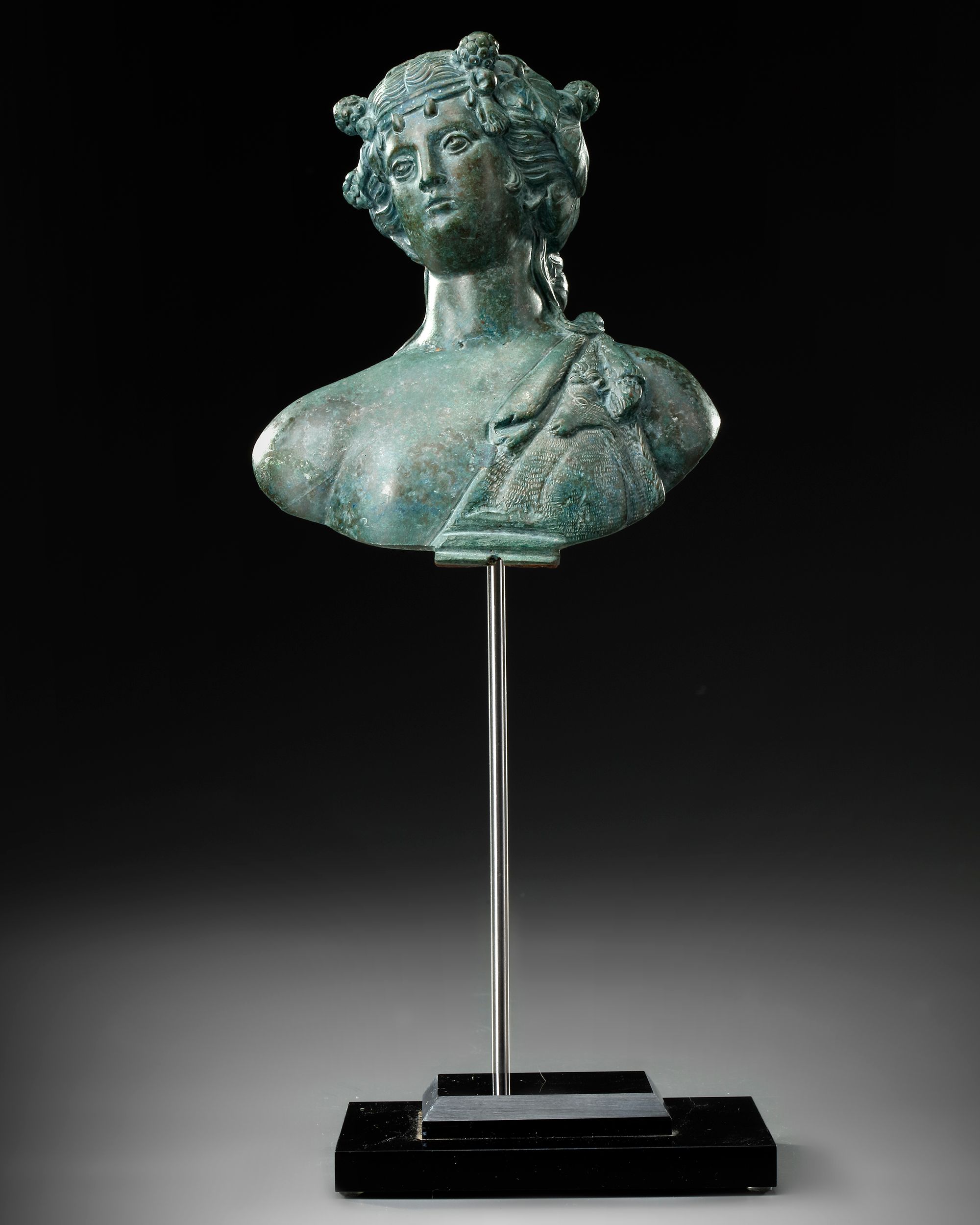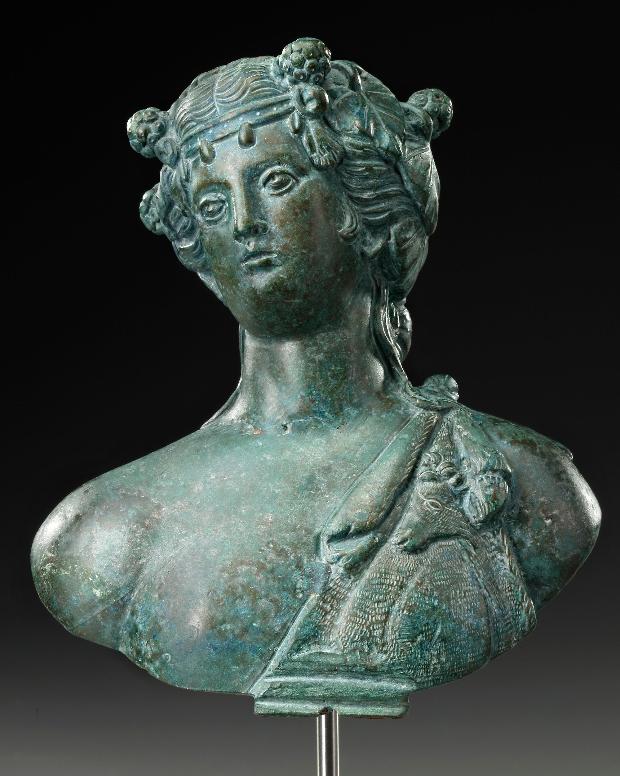 Fine cast and chased bronze bust of bacchus, the god of wine, adorned by a wreath of ivy leaves and flowers. He has thick wavy long hair gathered in a rear bun. He also wears a goat skin diagonally across his chest. Classically idealised facial features and beautifully detailed. A fine bronze with a beautiful blue-green patina.