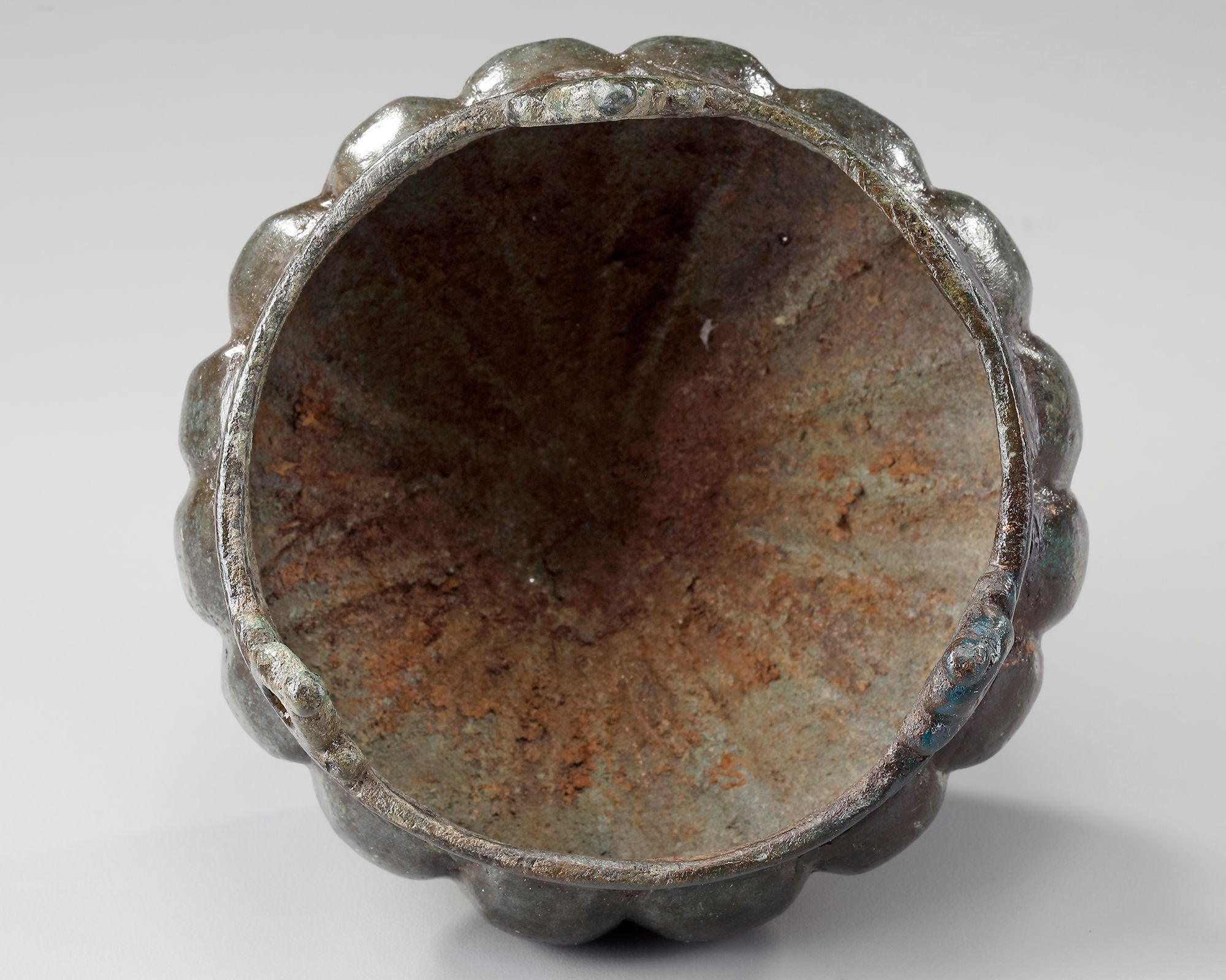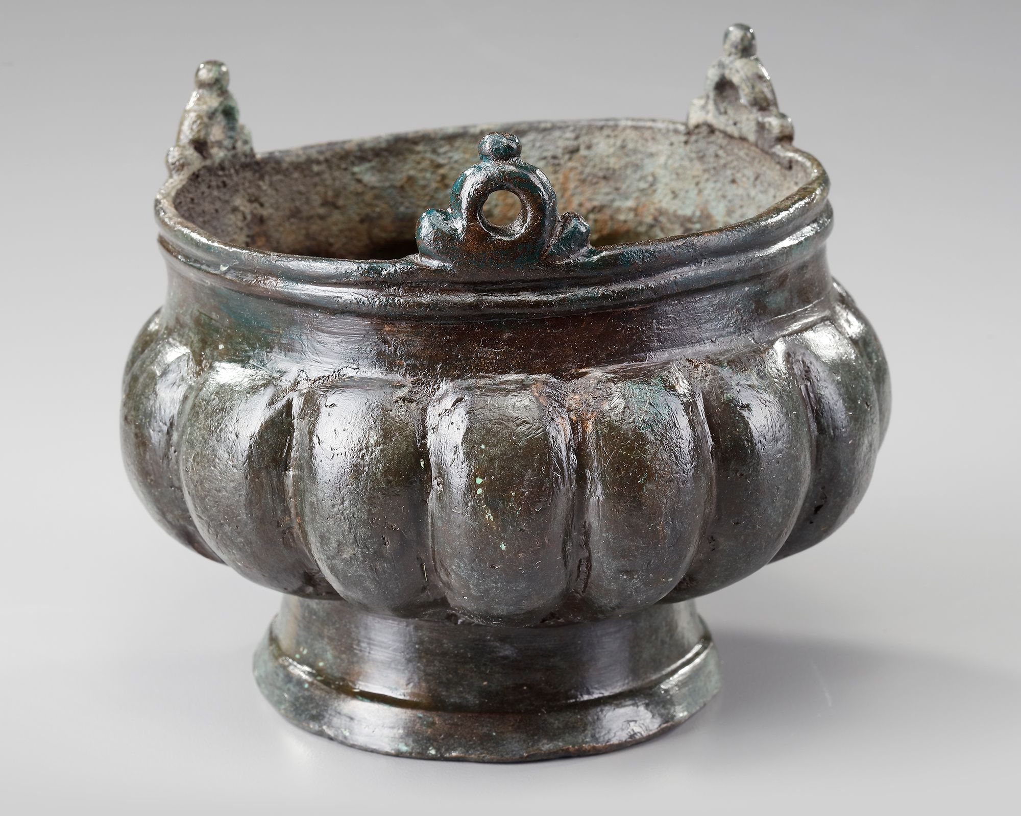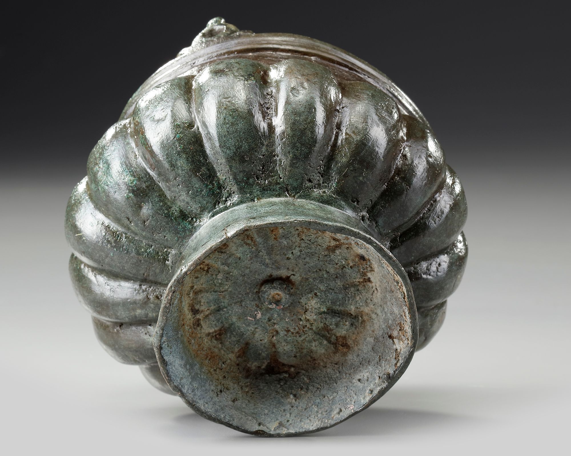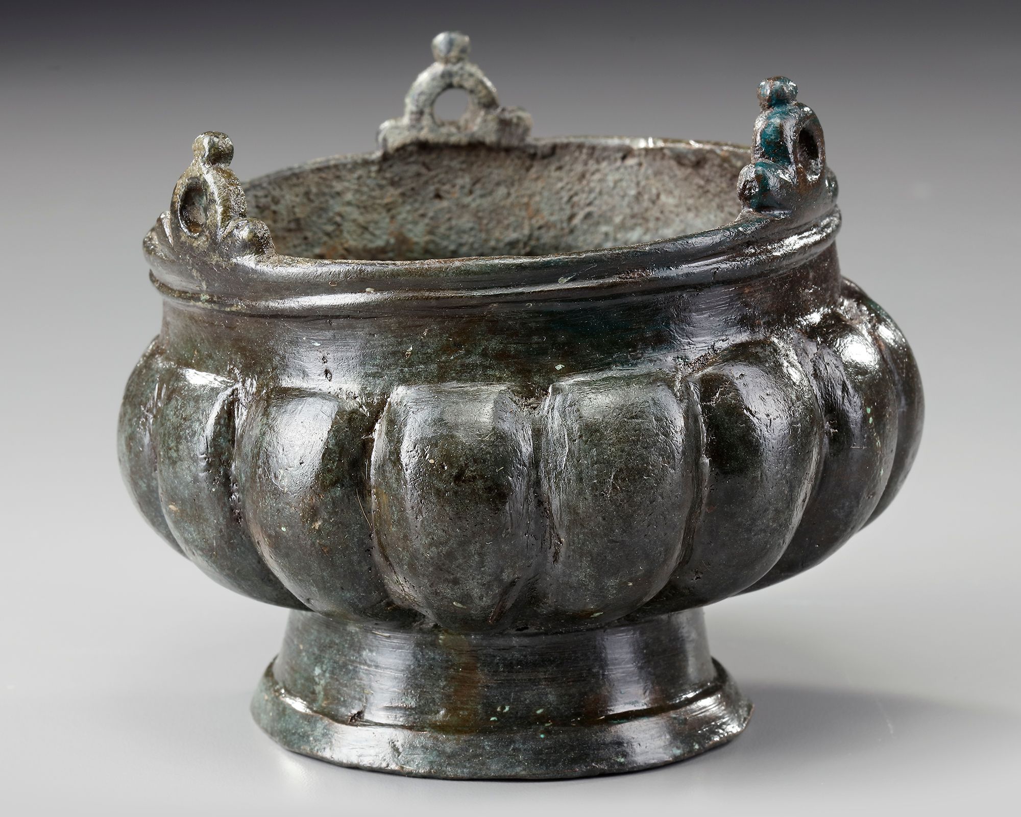 A bronze censer of the so called 'Palestinian type', consisting of a heavy cast segmented or 'poppy head' body with a raised foot and straight rim and three circular lugs for suspension for the chains. Usually given to the 6/8th c AD. The Greek description on the rim which is showing the name of the individual who donated the censer to the church to where it was donated. The lugs are decorated with three pellets which serve to strengthen the attachment of the circlets to the body. The object has a wonderful dark olive green patina.