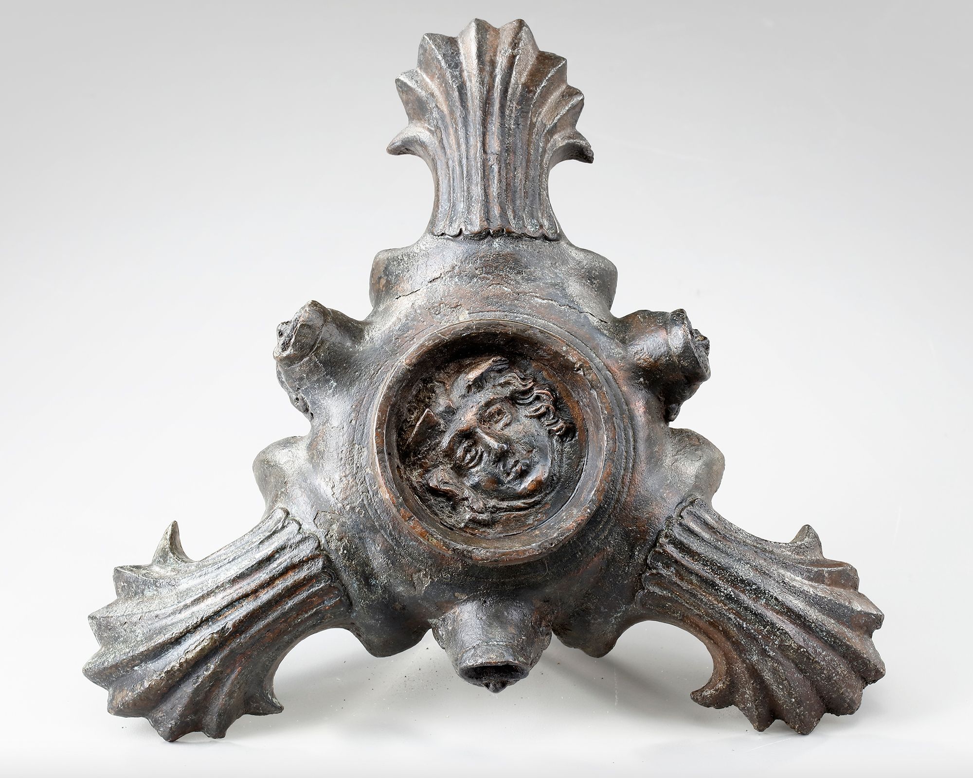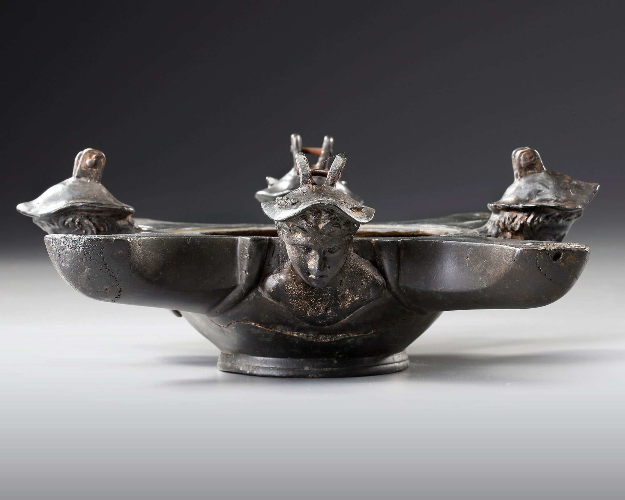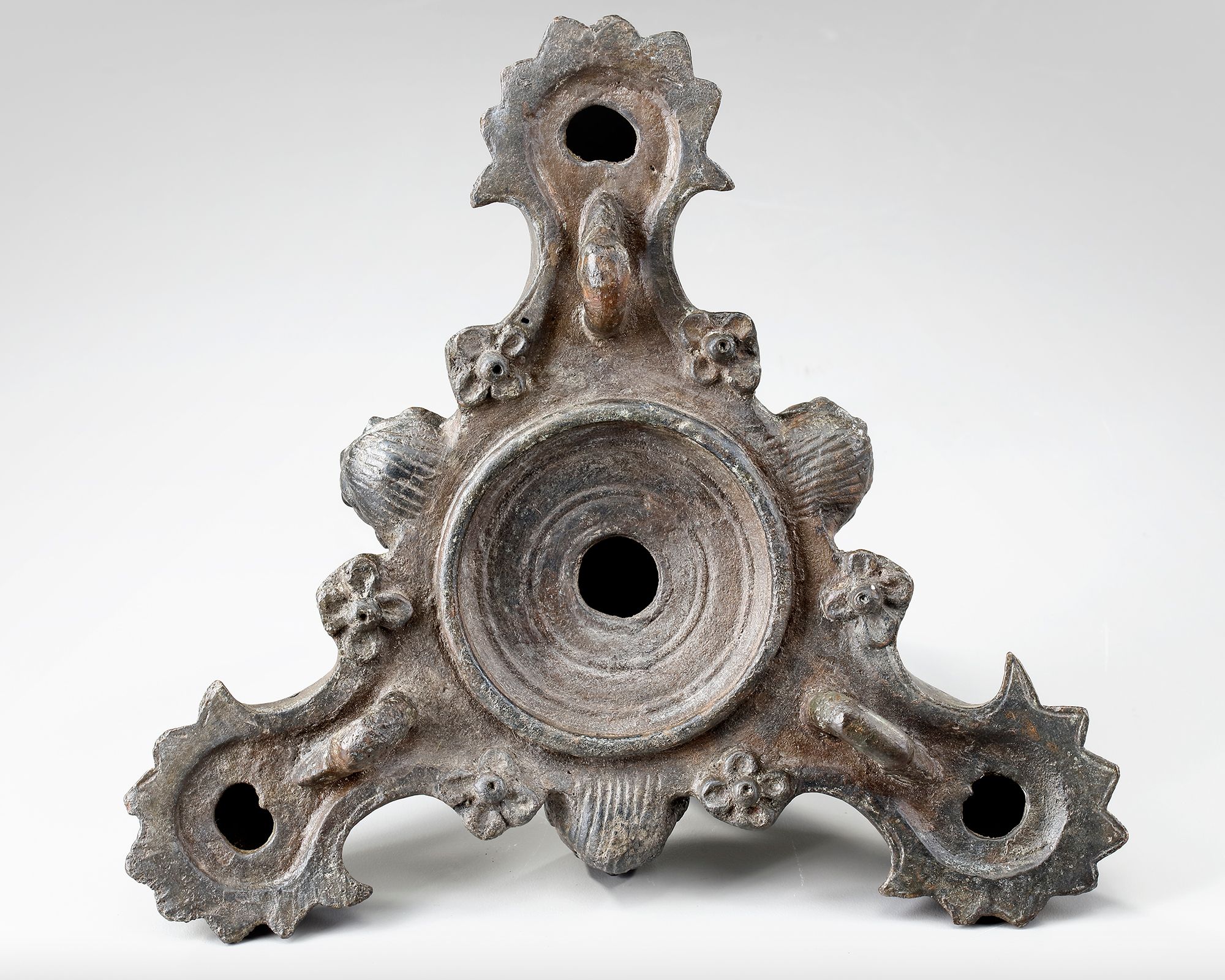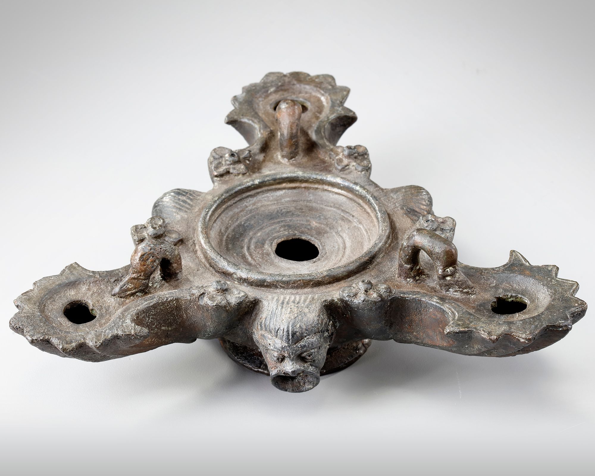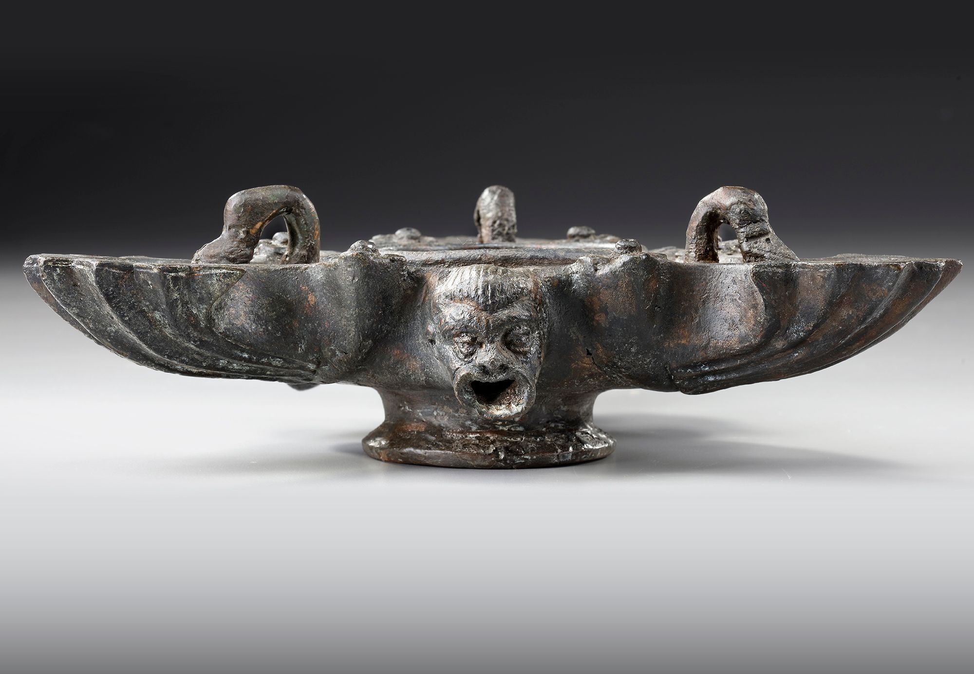 A large, beautiful bronze oil lamp cast by the lost wax process and designed so that it could hang from the original chains attached to three suspension hooks, one above each of the three nozzles - or sit on its concave base. In the central medallion on the base is a low relief representation of the face of Medusa, this can be seen when the lamp hangs from the ceiling. The scallop shell or spade-shaped nozzles are equidistantly placed around a central raised boss with theatre masks with rosettes above decorating the bowl of the lamp placed between the nozzles, a central filling hole is at the centre of the lamp.