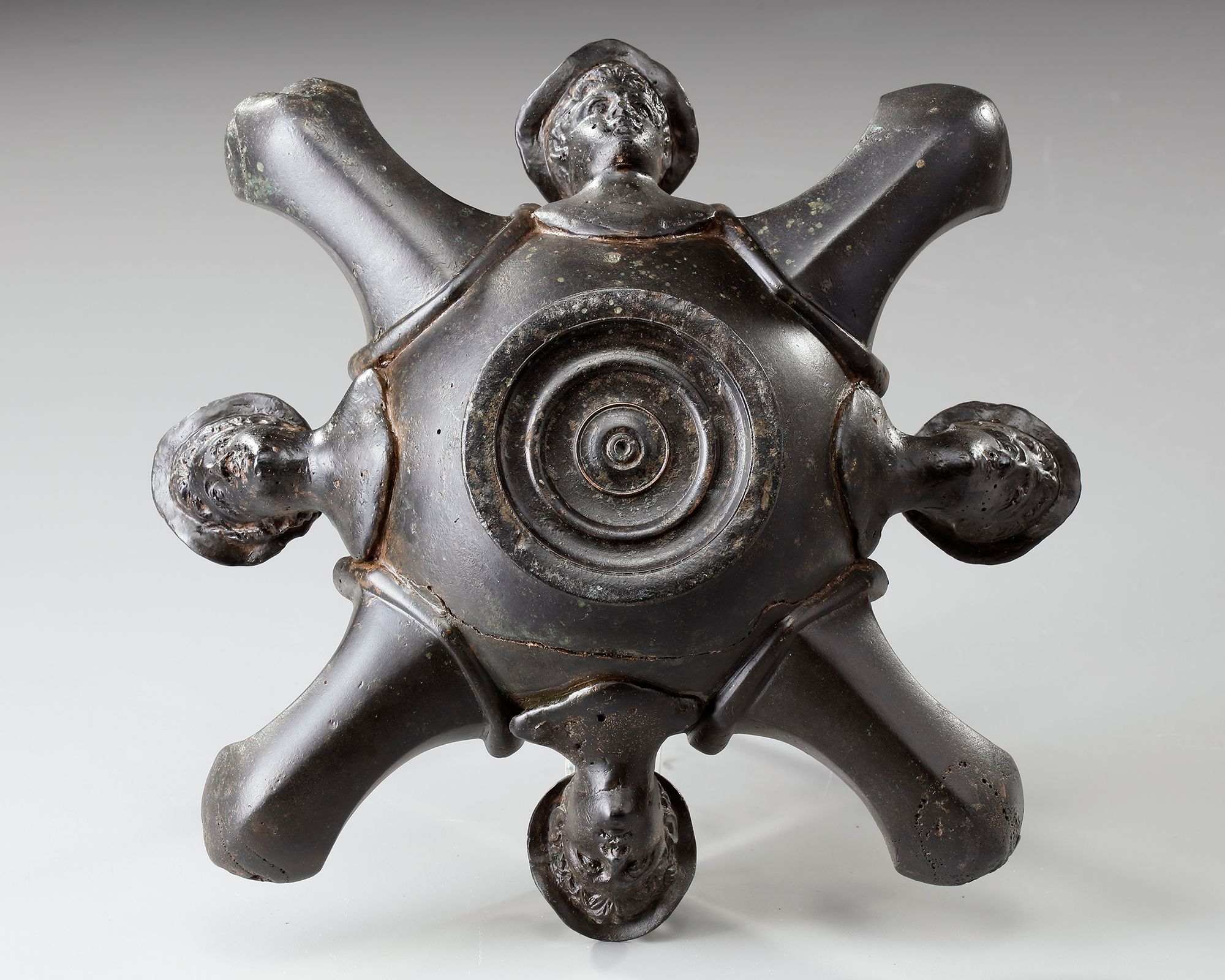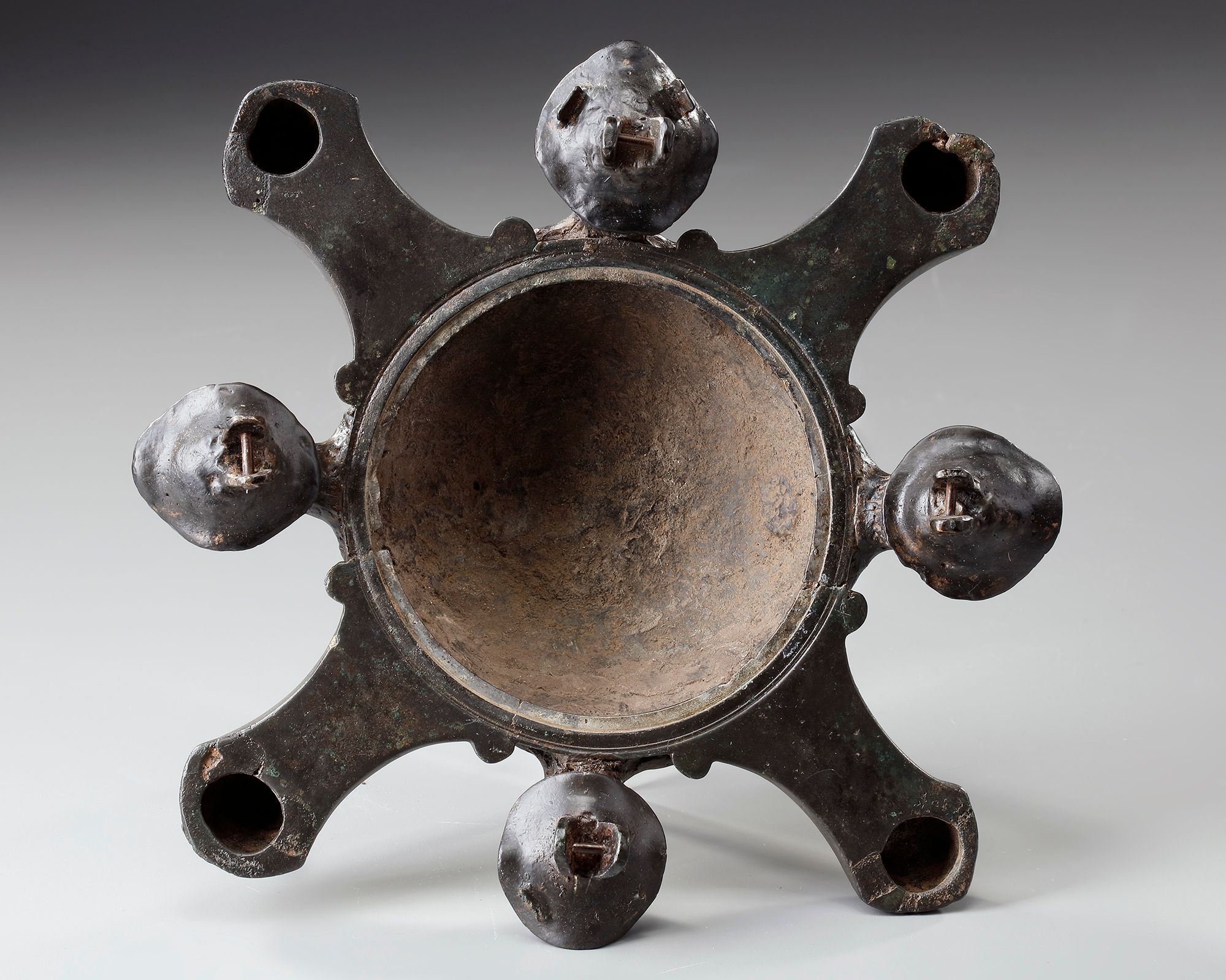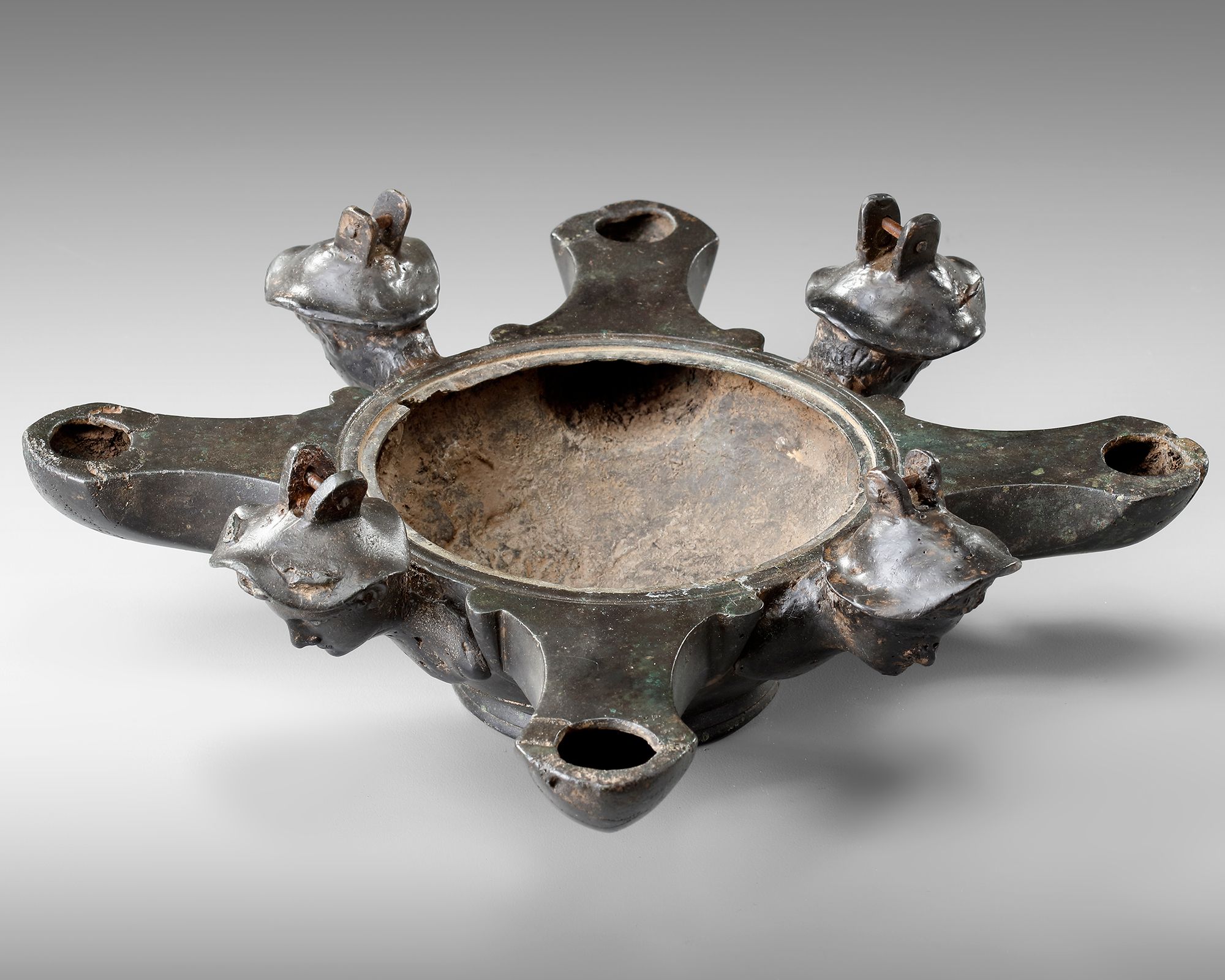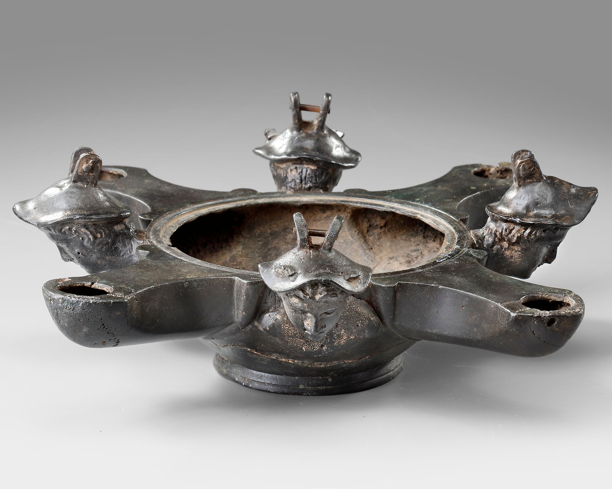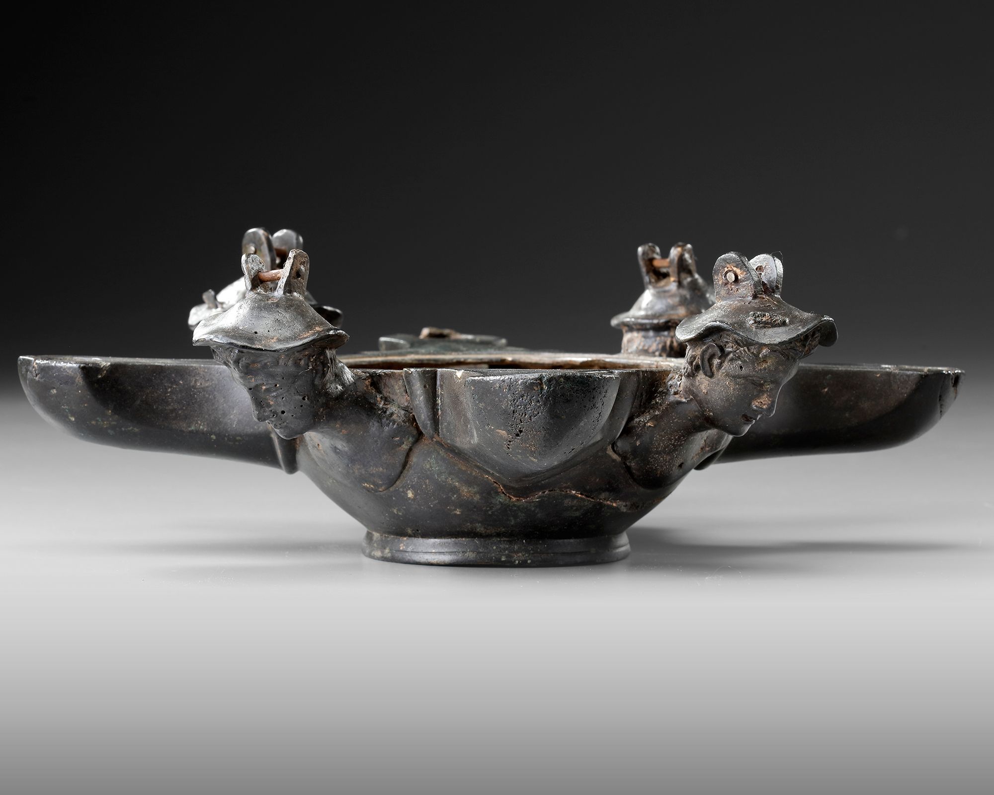 A bronze cast oil lamp. Decorating the bowl between the spouts are four busts of Mercury wearing a petasus and the wings are presented as lugs for the suspension or to rest on a surface.