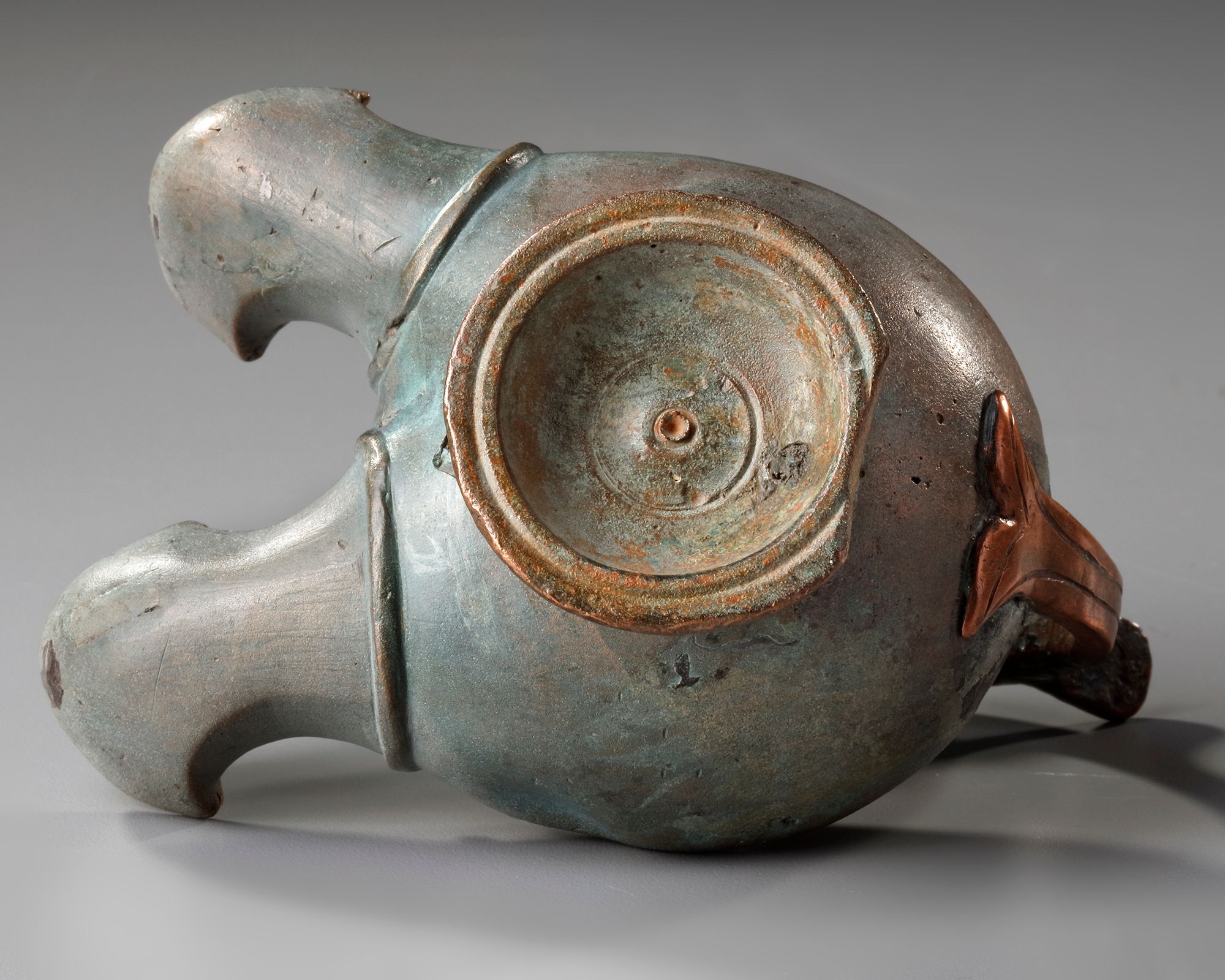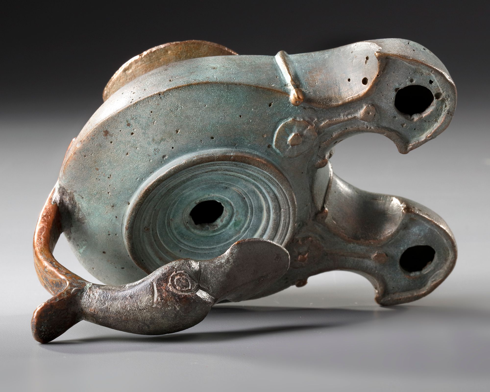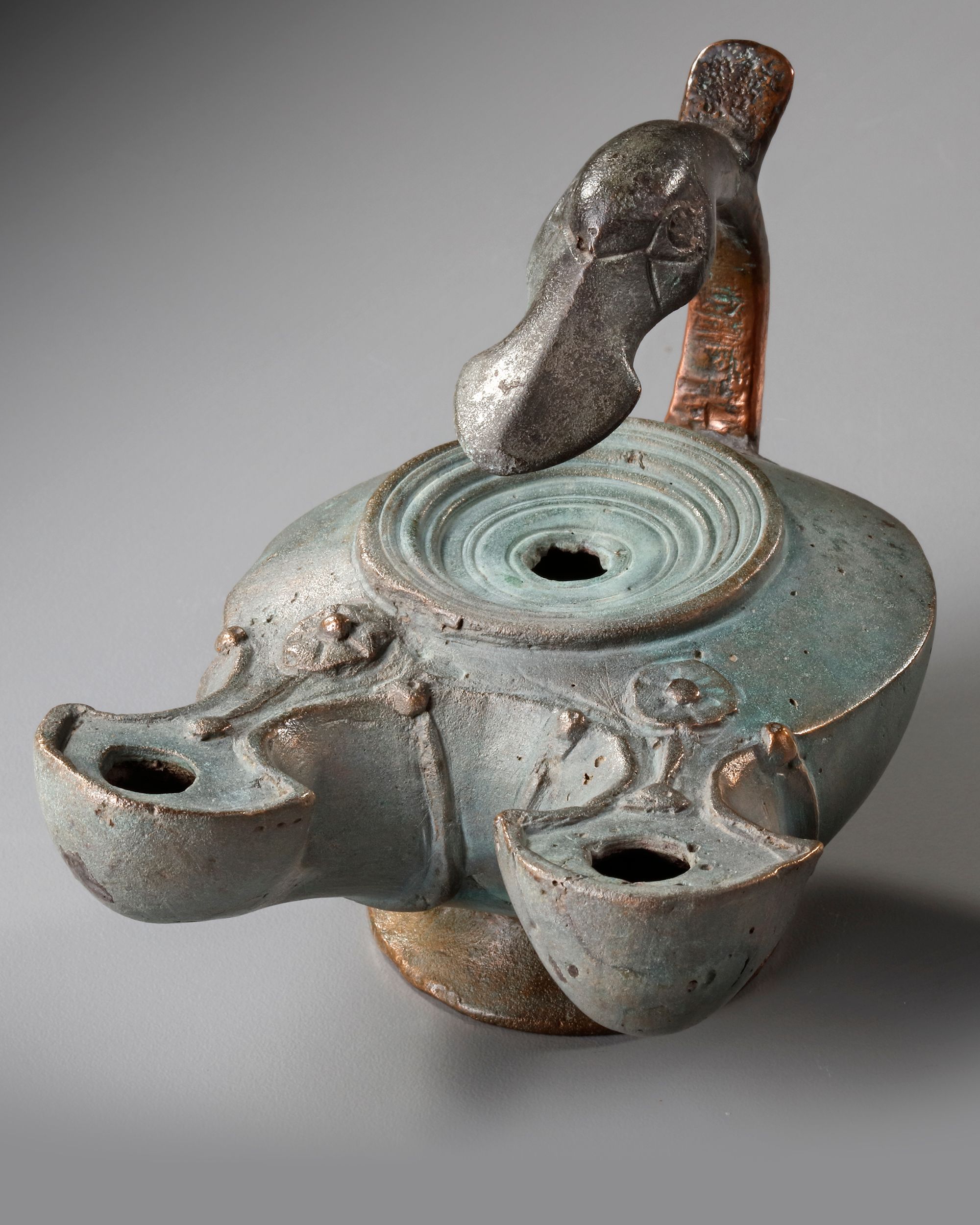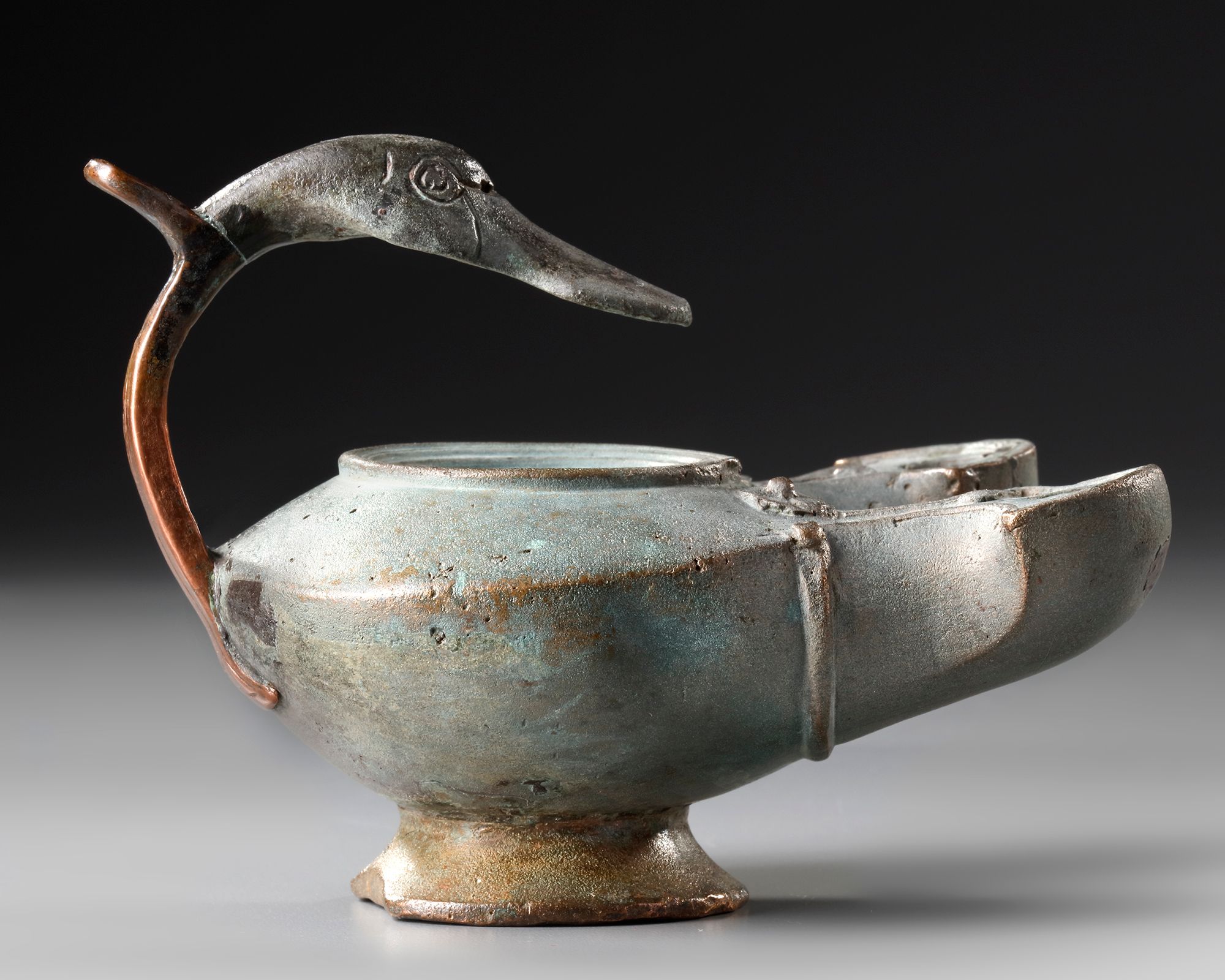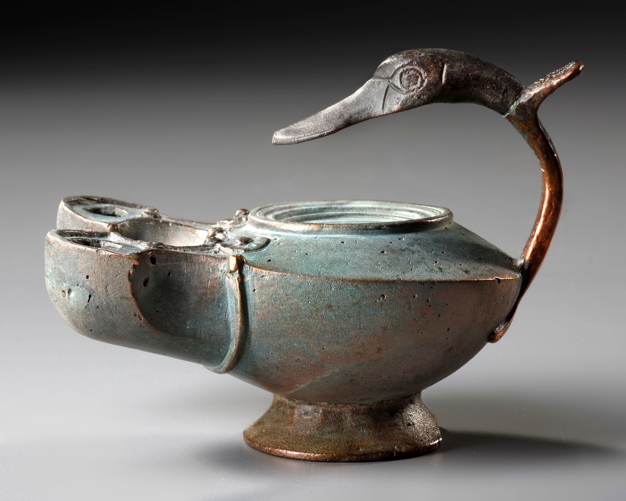 Cast in bronze via the lost wax technique, a double-spouted oil lamp featuring a handle in the form of a duck's head soldered to the body. Turned conical base and twin, slightly flared wick spouts. The rounded lamp body has a tiered raised tondo with large central fill hole.