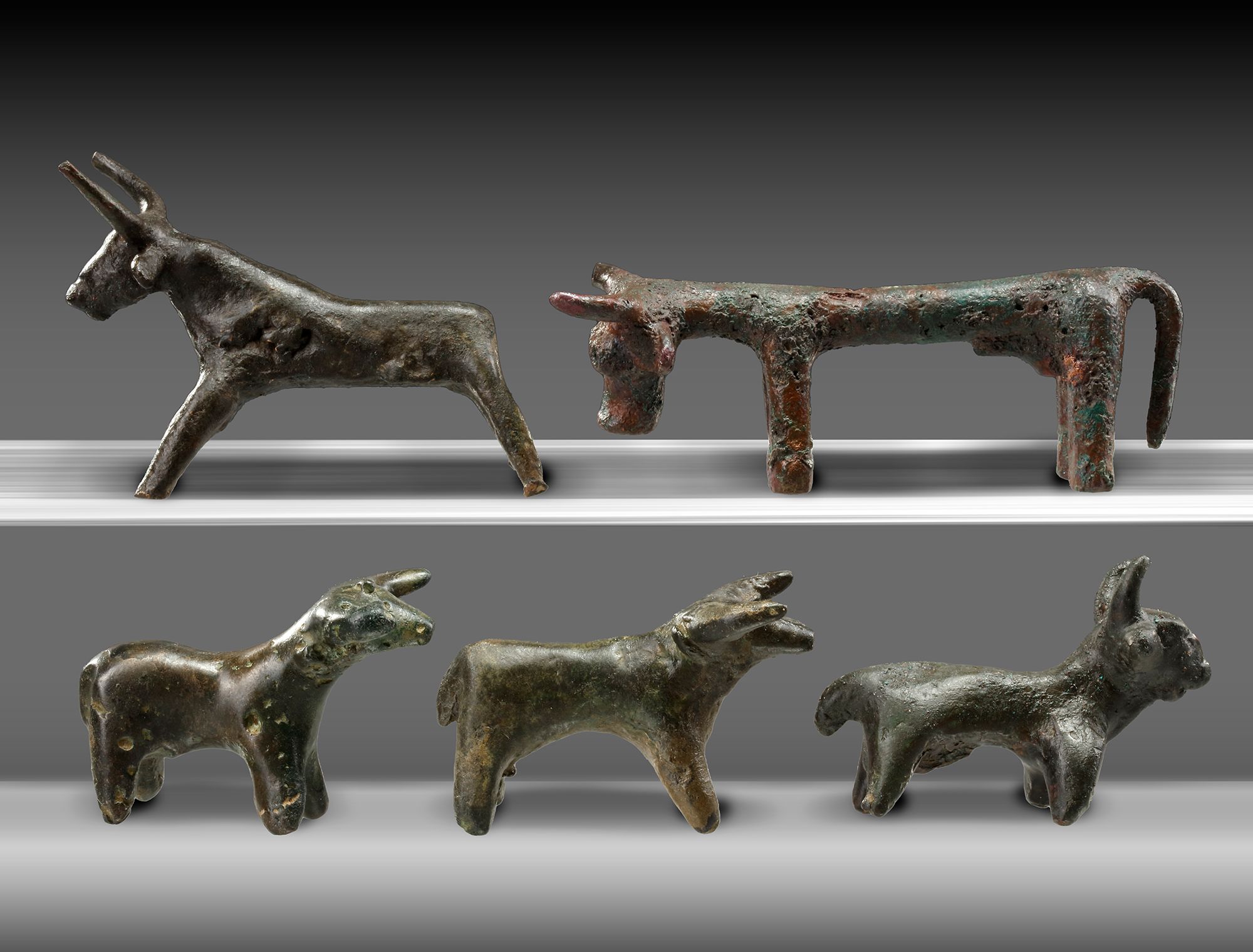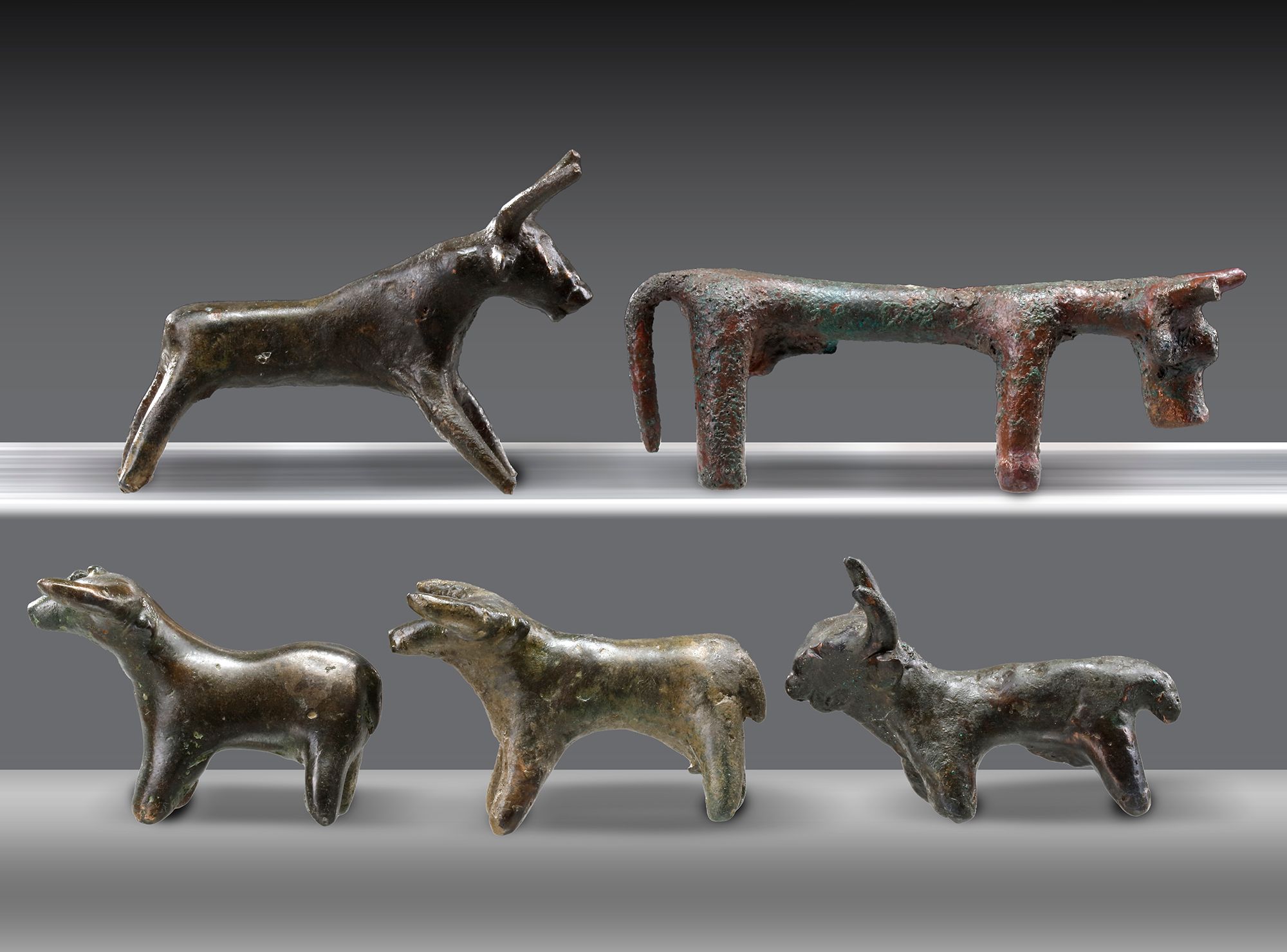 A group of five bronze bulls, standing foursquare, with large horns and projecting ears, and one with an open mouth and drilled eyes, with short and one with a long erect tail.