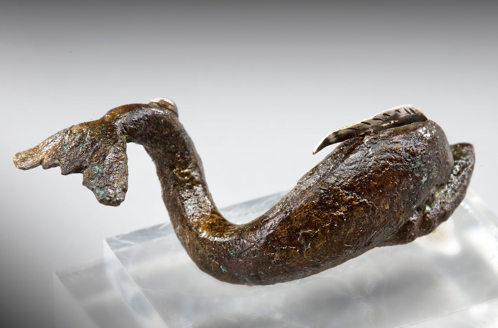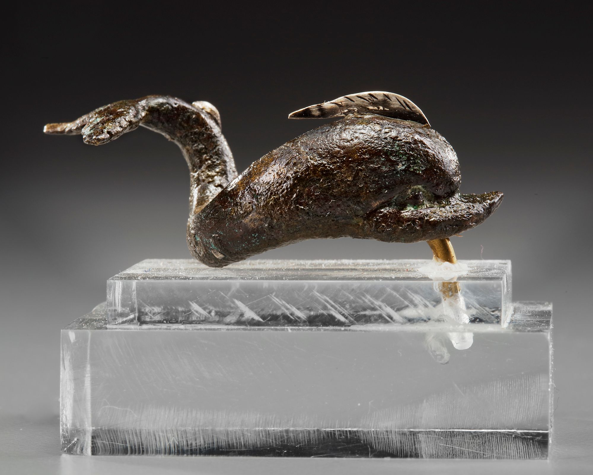 A cast bronze dolphin, probably a mount from a statuette ensemble. Could be Venus. With curved tail and shaped body with three silver inlaid fins. Dolphins are a fairly popular image in Roman art. They have a rich background in Greek and Roman mythology. Dolphins are featured in many Greek and Roman myths.