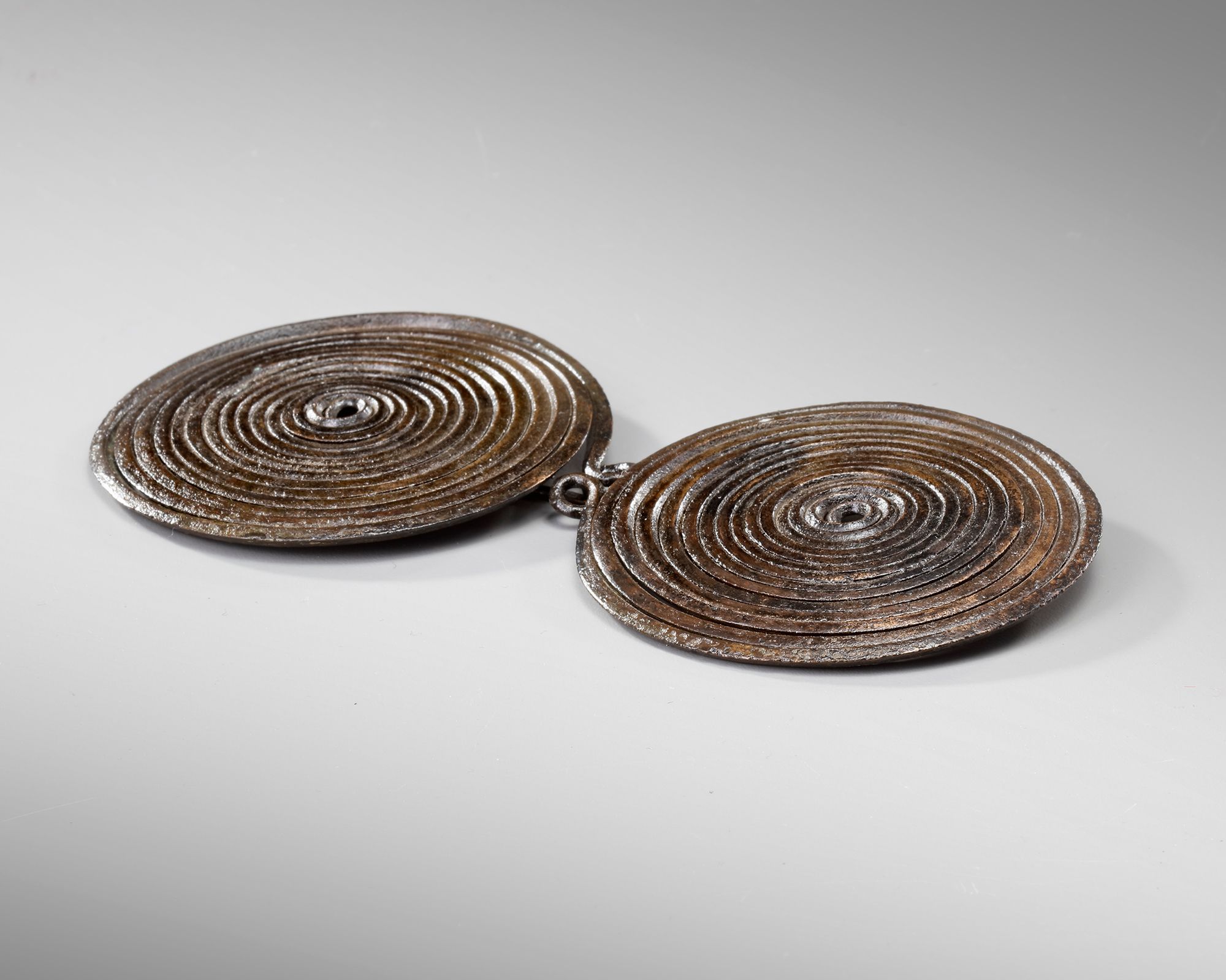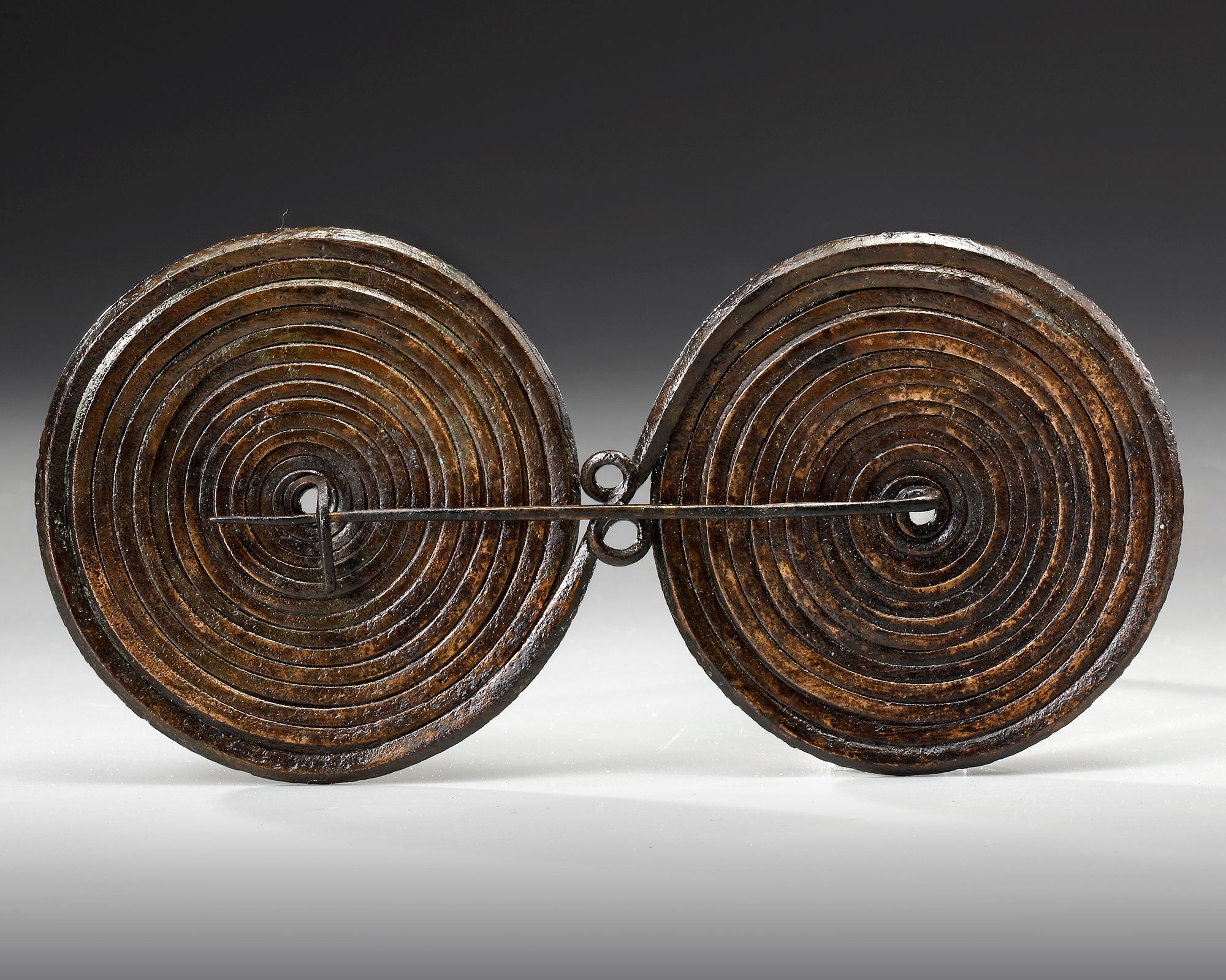 A substantial bronze spectacle brooch or fibula safety pin, formed as two large tightly-wound coils with figure-of-fourteen-shaped intermediate coils; a catchplate to the reverse with pin.