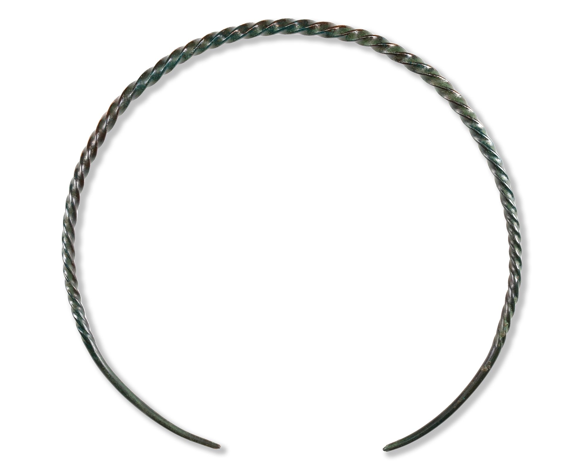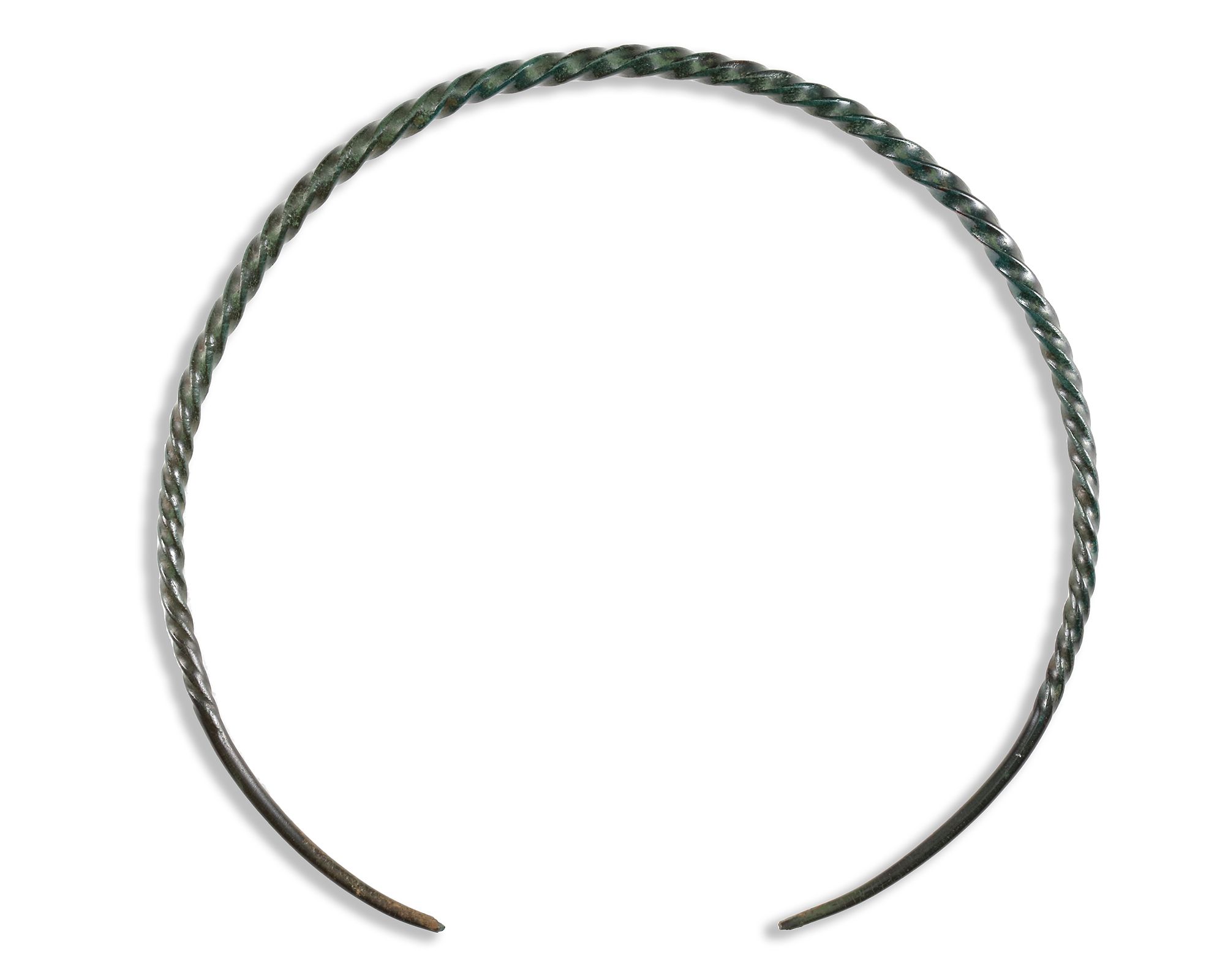 A Bronze Age pennanular torc formed from a single length of bronze wire, which has been extensively incised to create a twisted rope effect across much of its length. The ends taper slowly to the terminals.