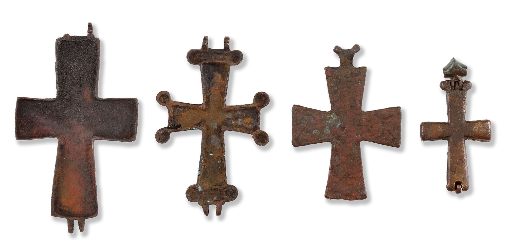 A group of four Byzantine pendant crosses. Three encolpion crosses (one complete) and one plain cross of a single element with the Virgin orans and the four evangelists in small roundels in each arm of the cross.