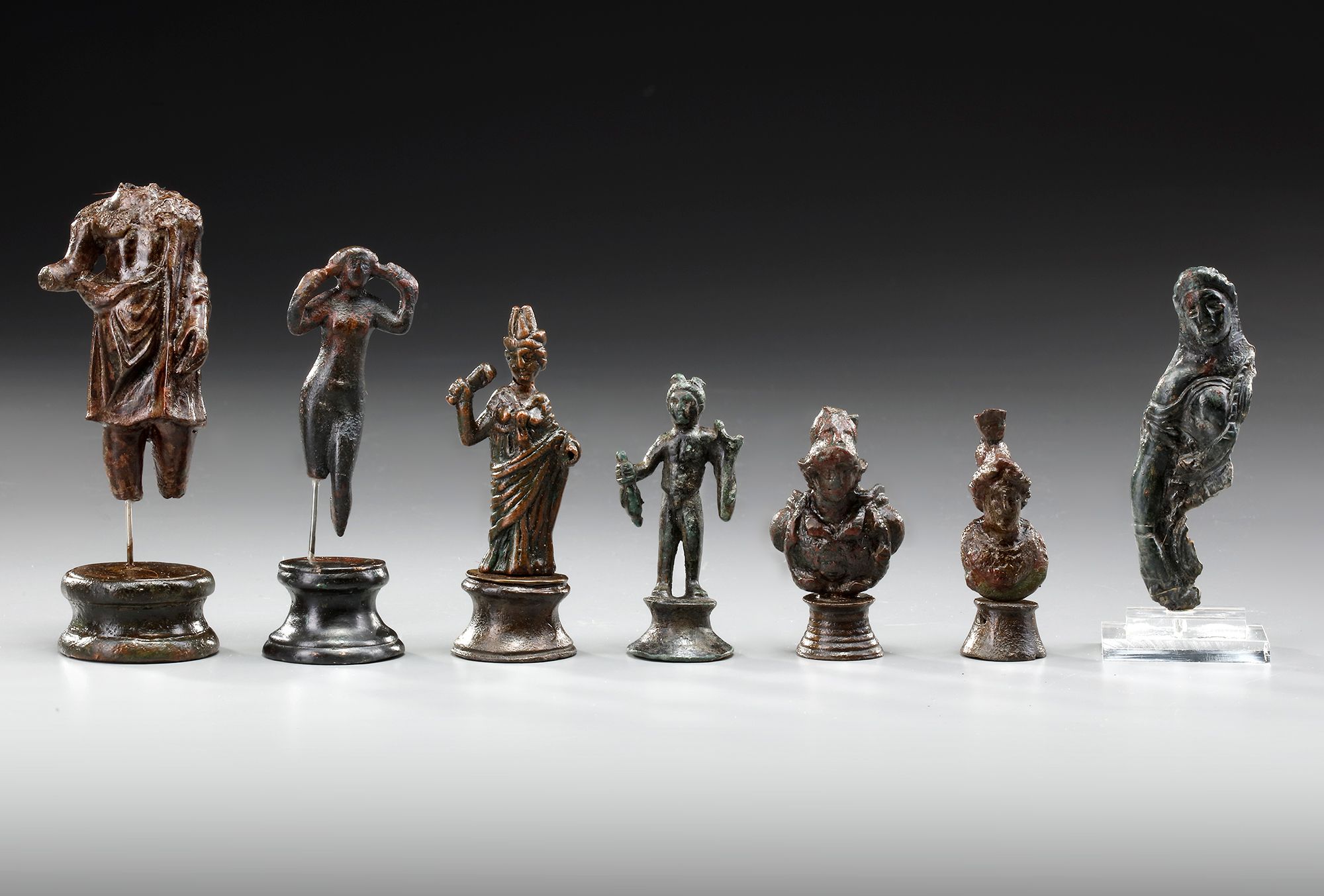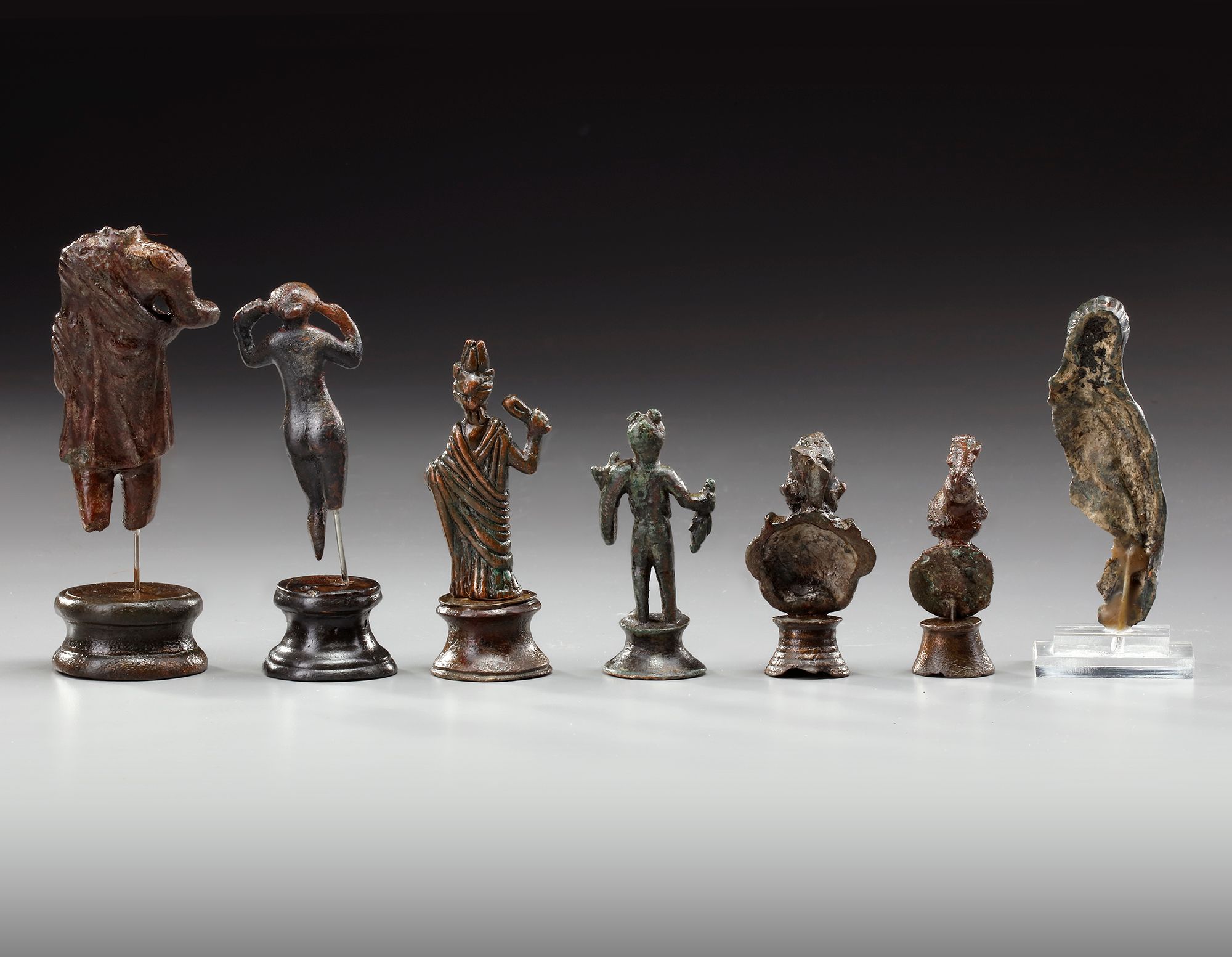 From left to right : One fragmentary statuette of Vulkan wearing a tunic.