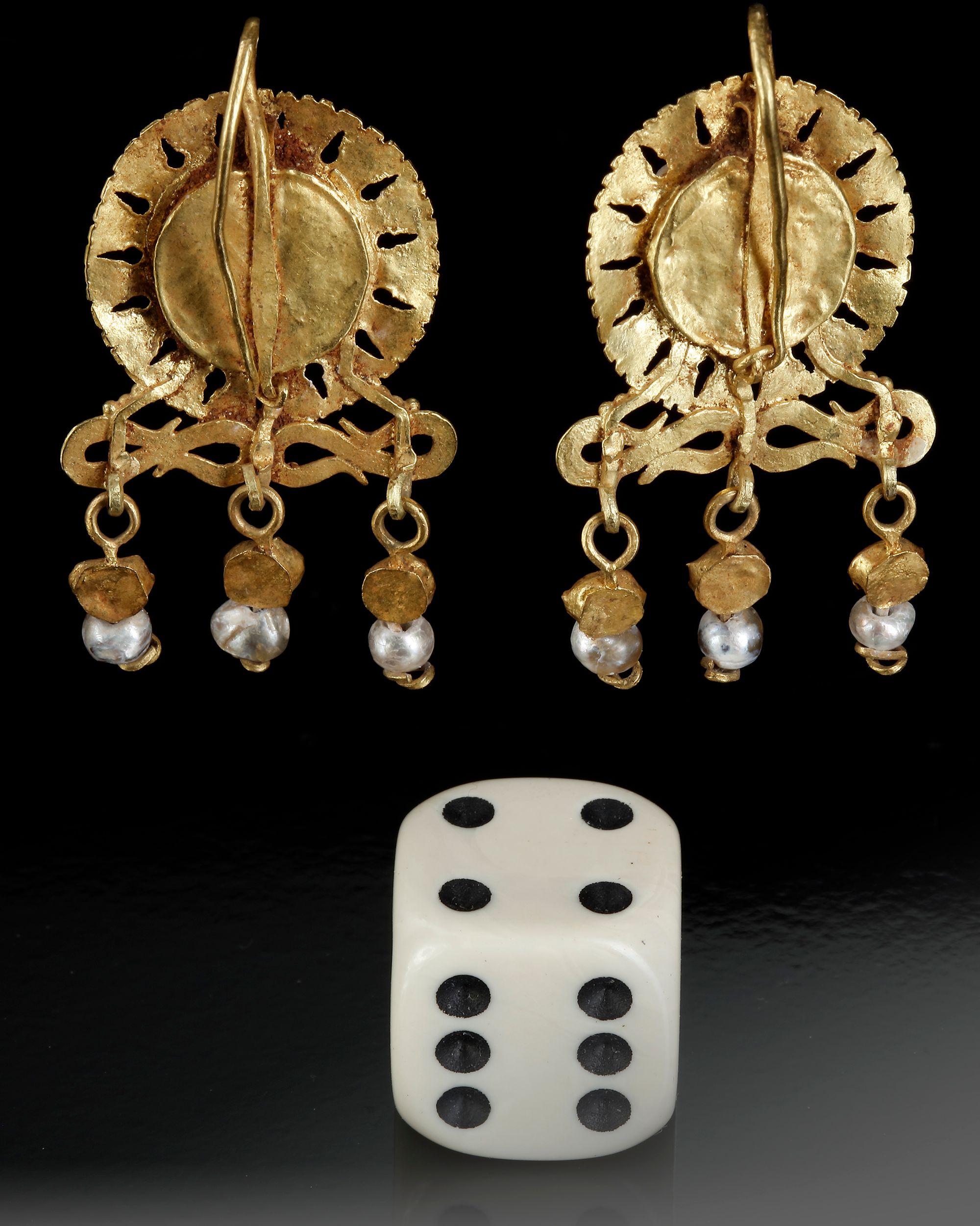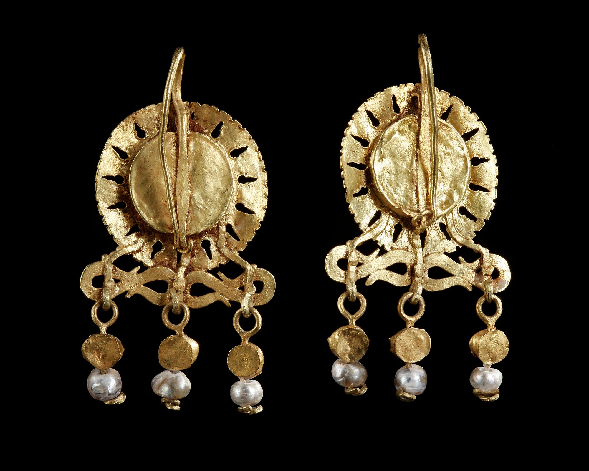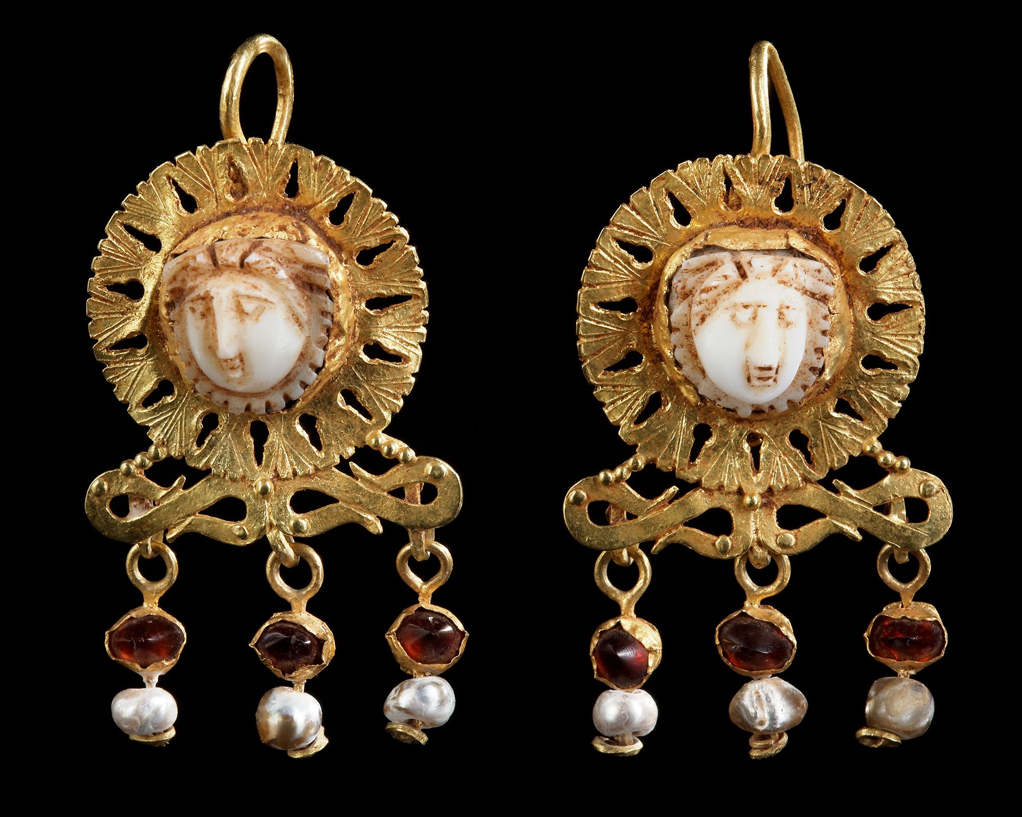 A pair of gold earrings, each composed with a carved cameo modelling a Medusa face within a pierced discoid setting, joined by three garnet and pearl beads to pierced scrollwork bar below; three articulated dangles with circular settings, set with garnet above pearl and twisted terminal, loop to the reverse.