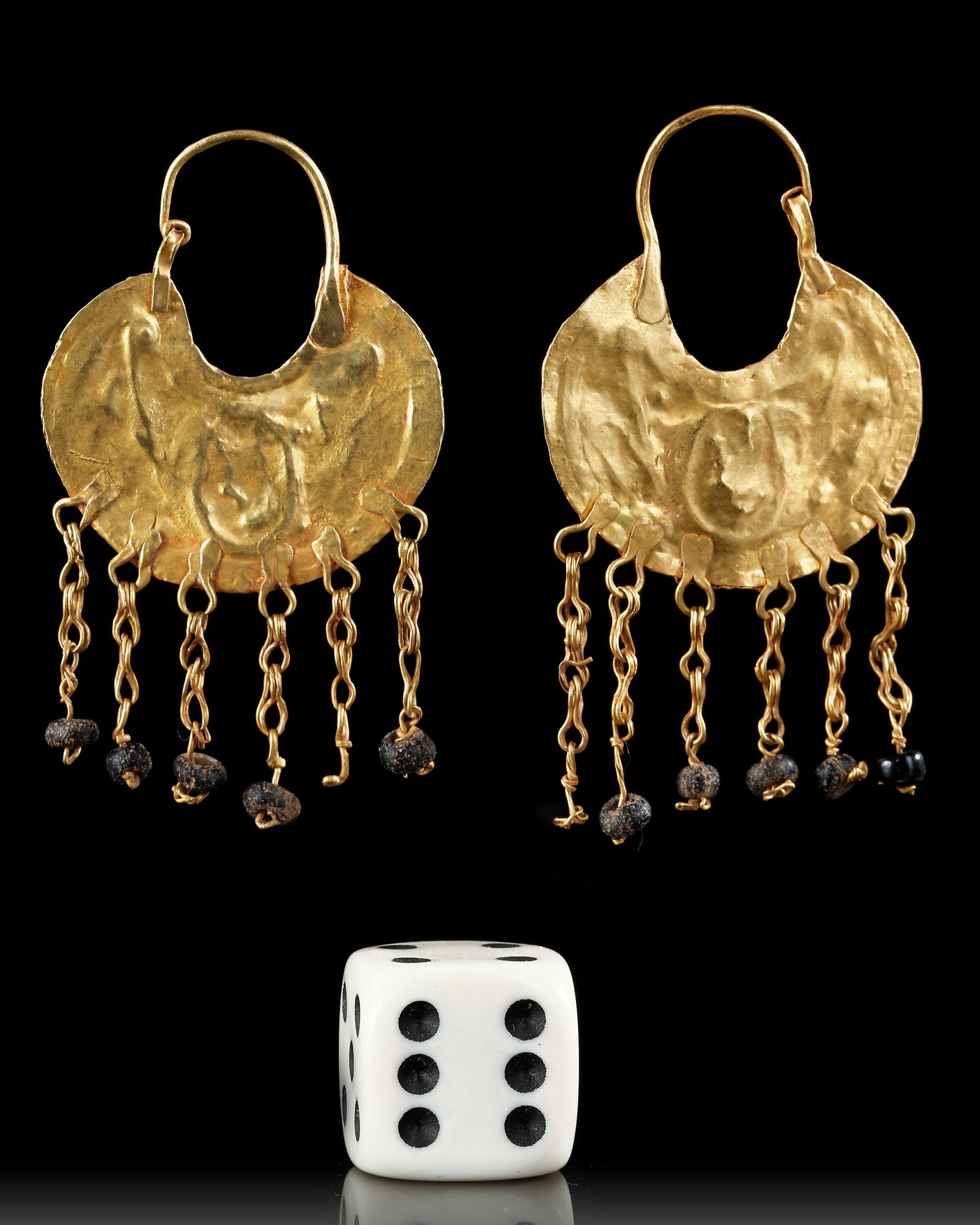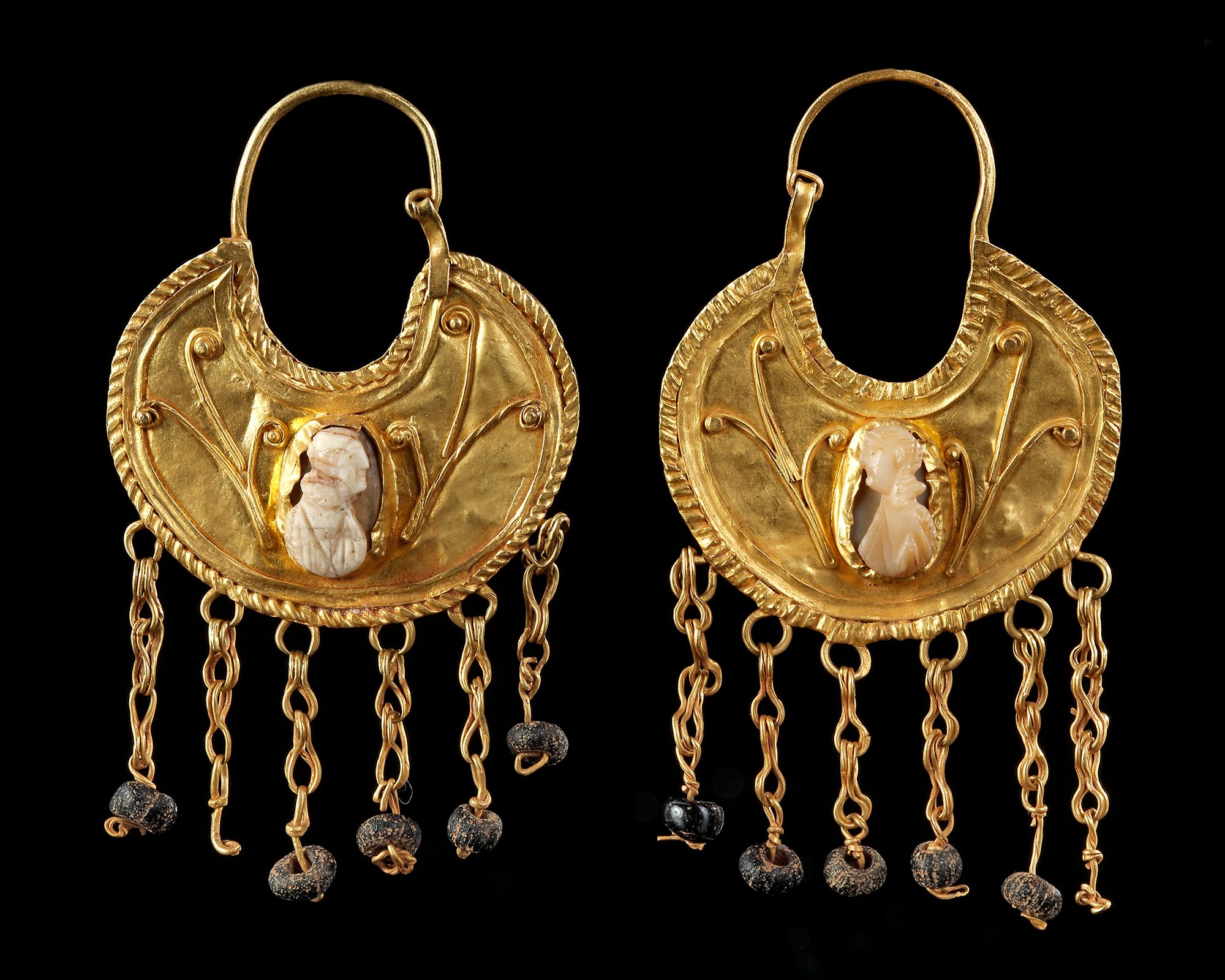 A pair of gold earrings, each composed with a carved bone cameo modelling a head and shoulder portrait on an upturned crescent discoid setting with three stems with scrolling ends to each side, six chain dangles with bead finial.