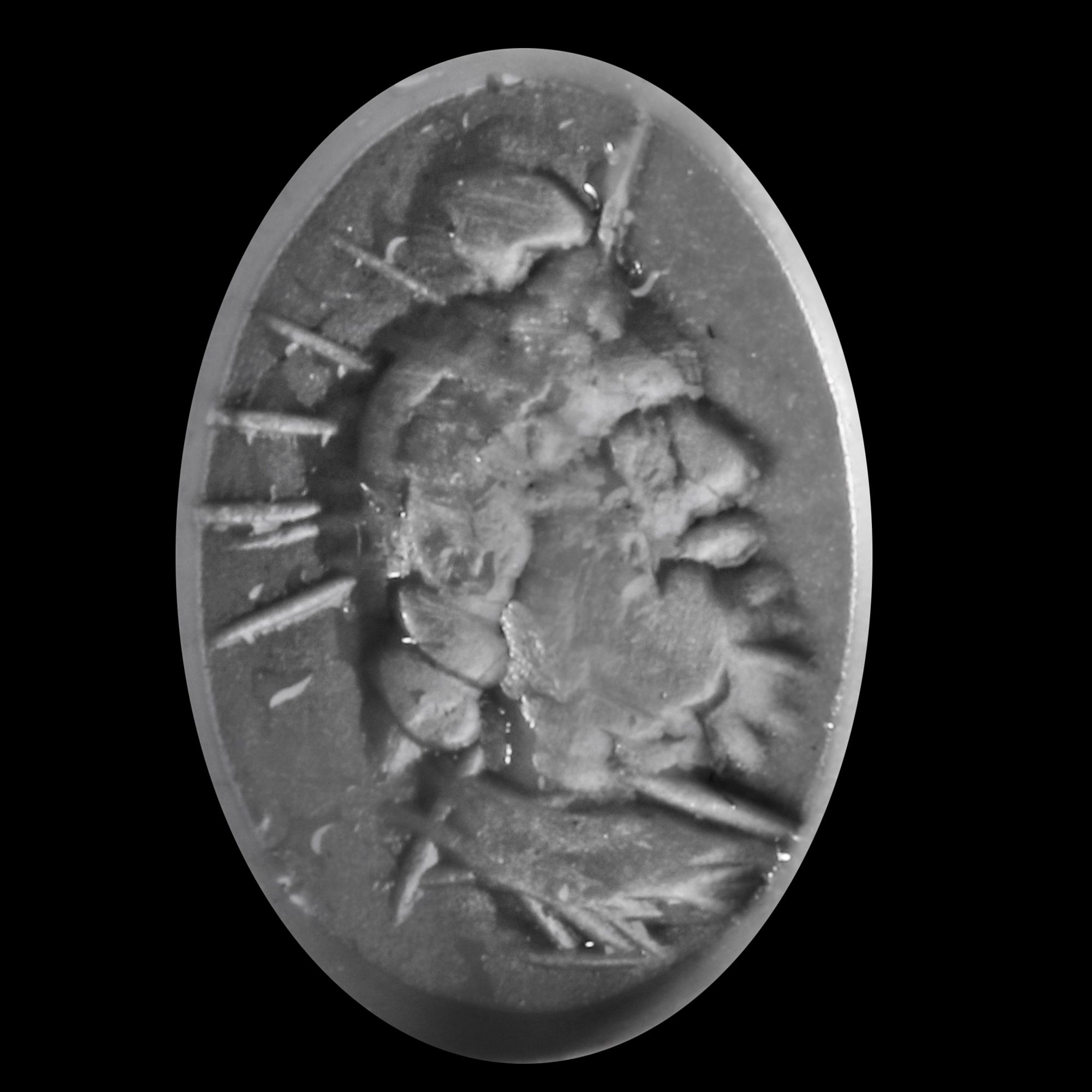 A Roman intaglio showing a bust of Serapis Pantheos to the left. He is shown radiate in this guise which show him with the attribute of Sol.
