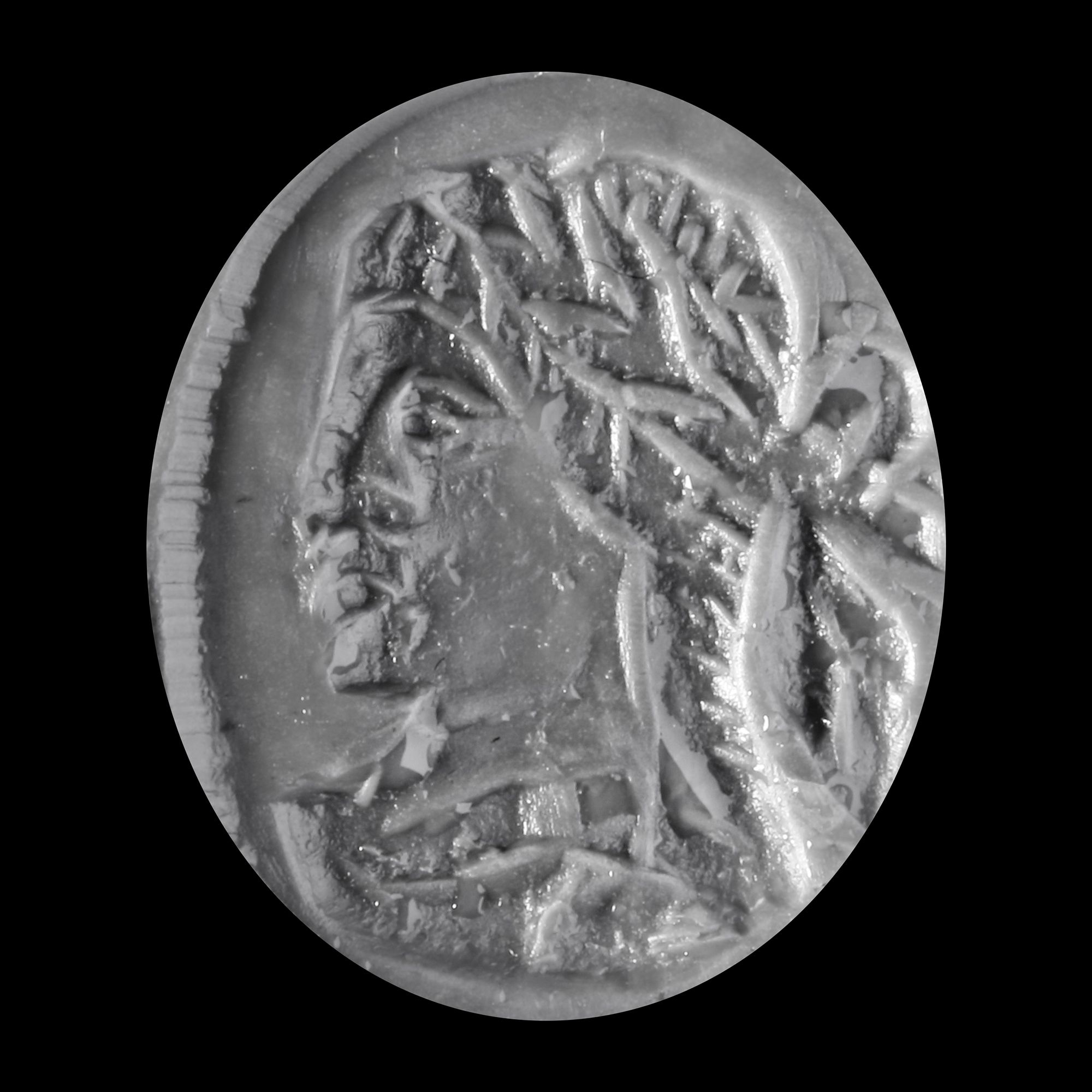 A cameo made from banded agate showing a bust of Apollo facing right. The bust is draped and wearing a laurel wreath with a large tie and bow at the back of the head. The use of a thin stone with two bands and using very low relief is thought to be a late Roman technique used during the 3/4th centuries when glyptic art in general was on the wane in the Empire.