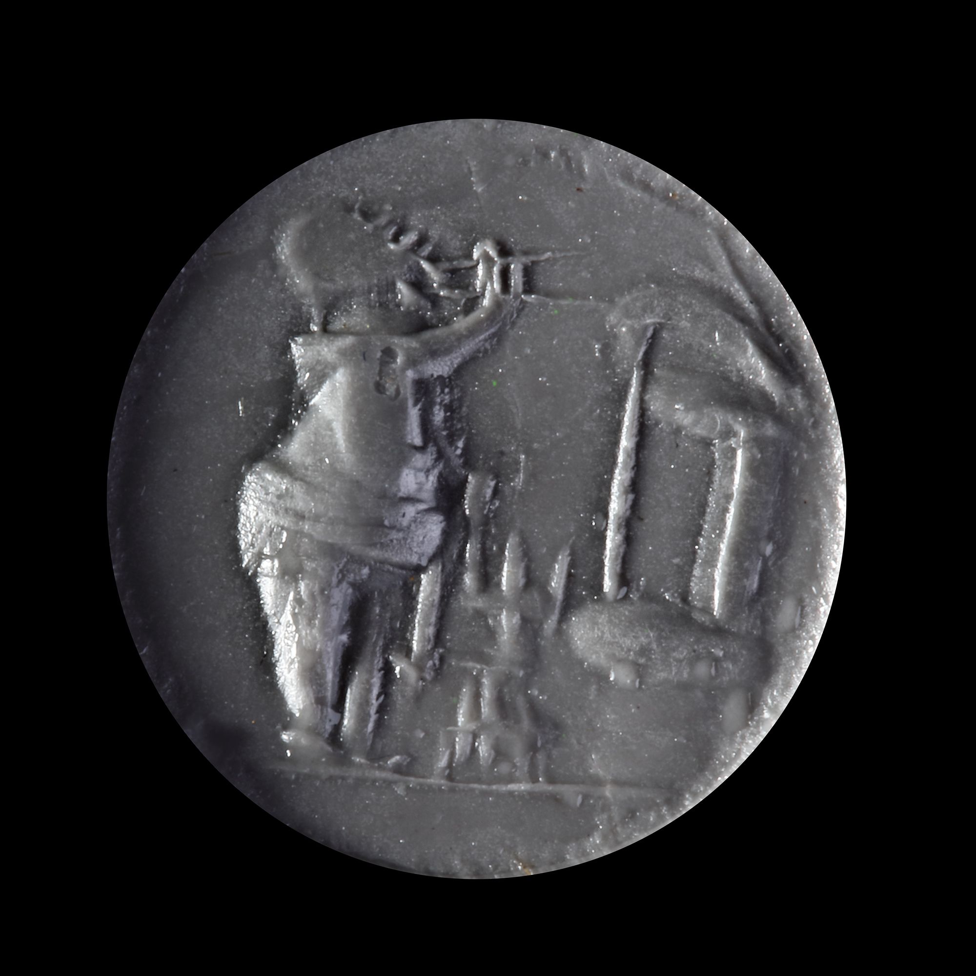 A carnelian intaglio showing a satyr playing flutes in front of a rustic shrine, in front of him is placed a small altar and some branches are seen above the shrine. Below is an exergal line upon which the scene rests. Diameter: 11 mm.