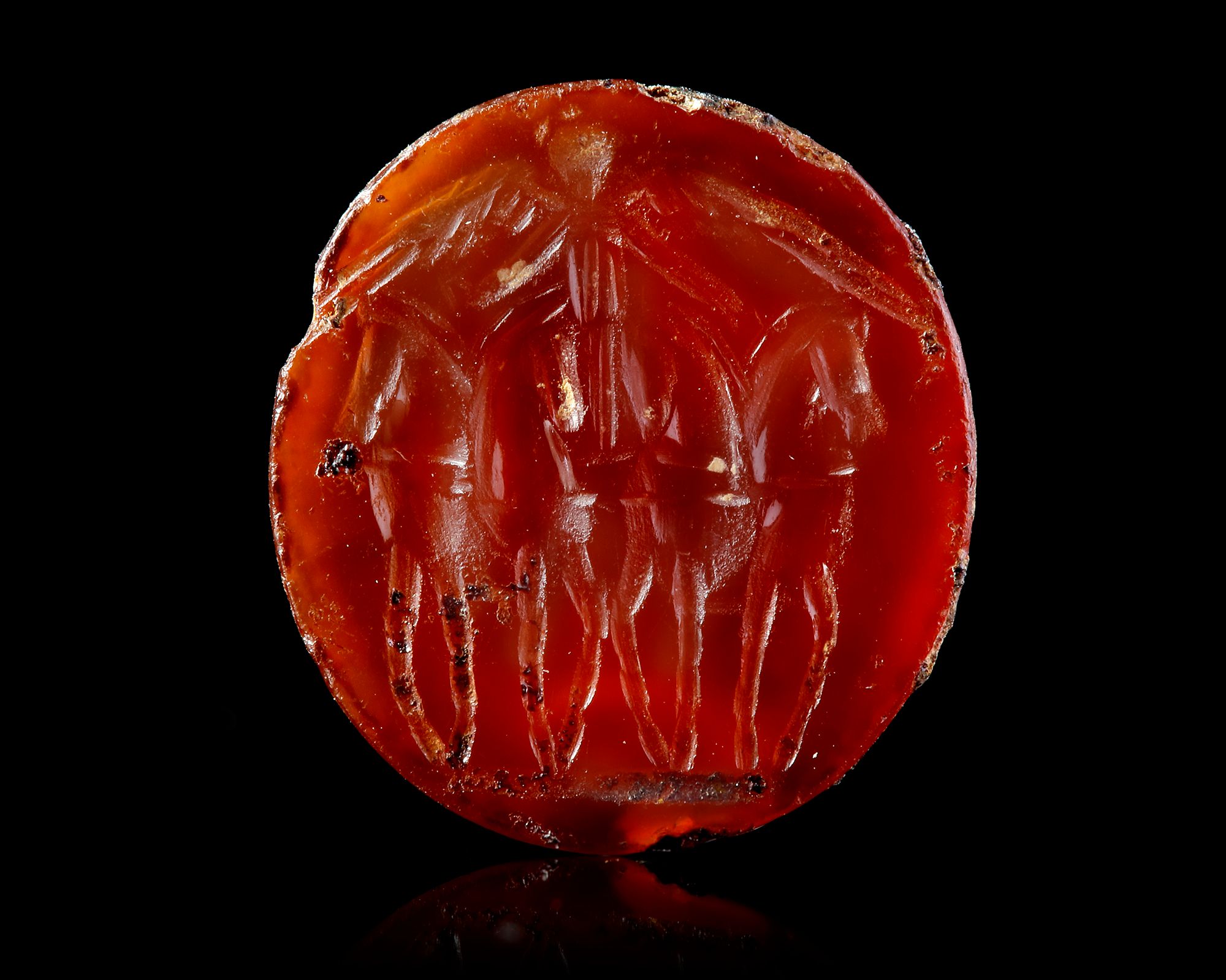 An attractive carnelian intaglio showing a quadriga from the front driven by a standing victory or Nike standing with her wings outspread and holding in each hand the reins. A laurel wreath is indicated above her head. A beautifully balanced design showing the two pairs of horses walking towards the viewer with their heads facing away from each other.