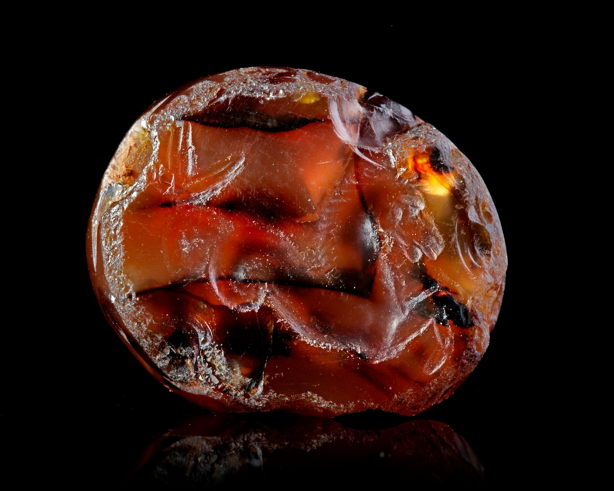 A carnelian scaraboid showing a Hippocamp to the right. A common subject from Hellenistic times onwards, such a device would be used as a personal seal, possibly meaning that the owner had some connection to the sea.