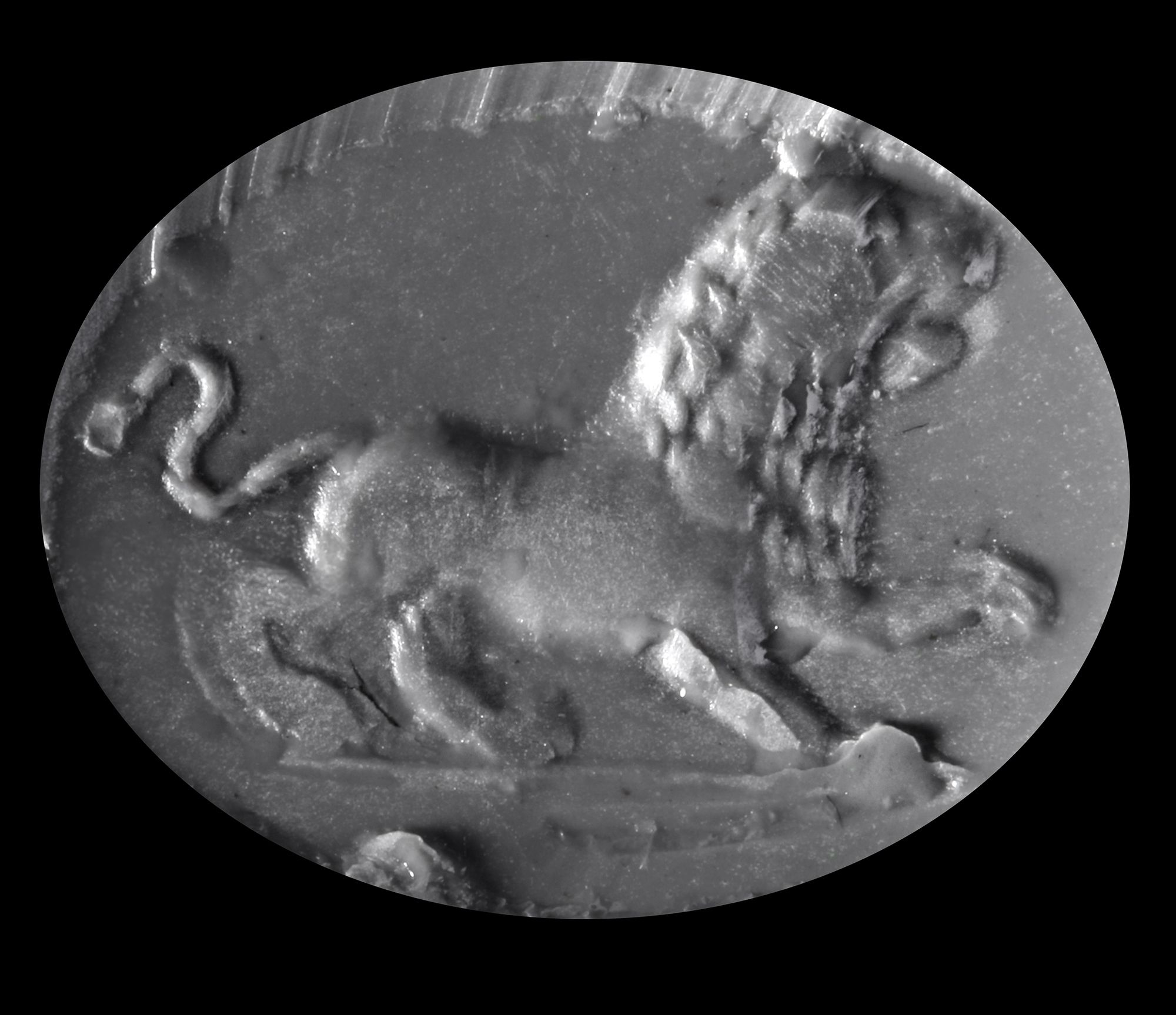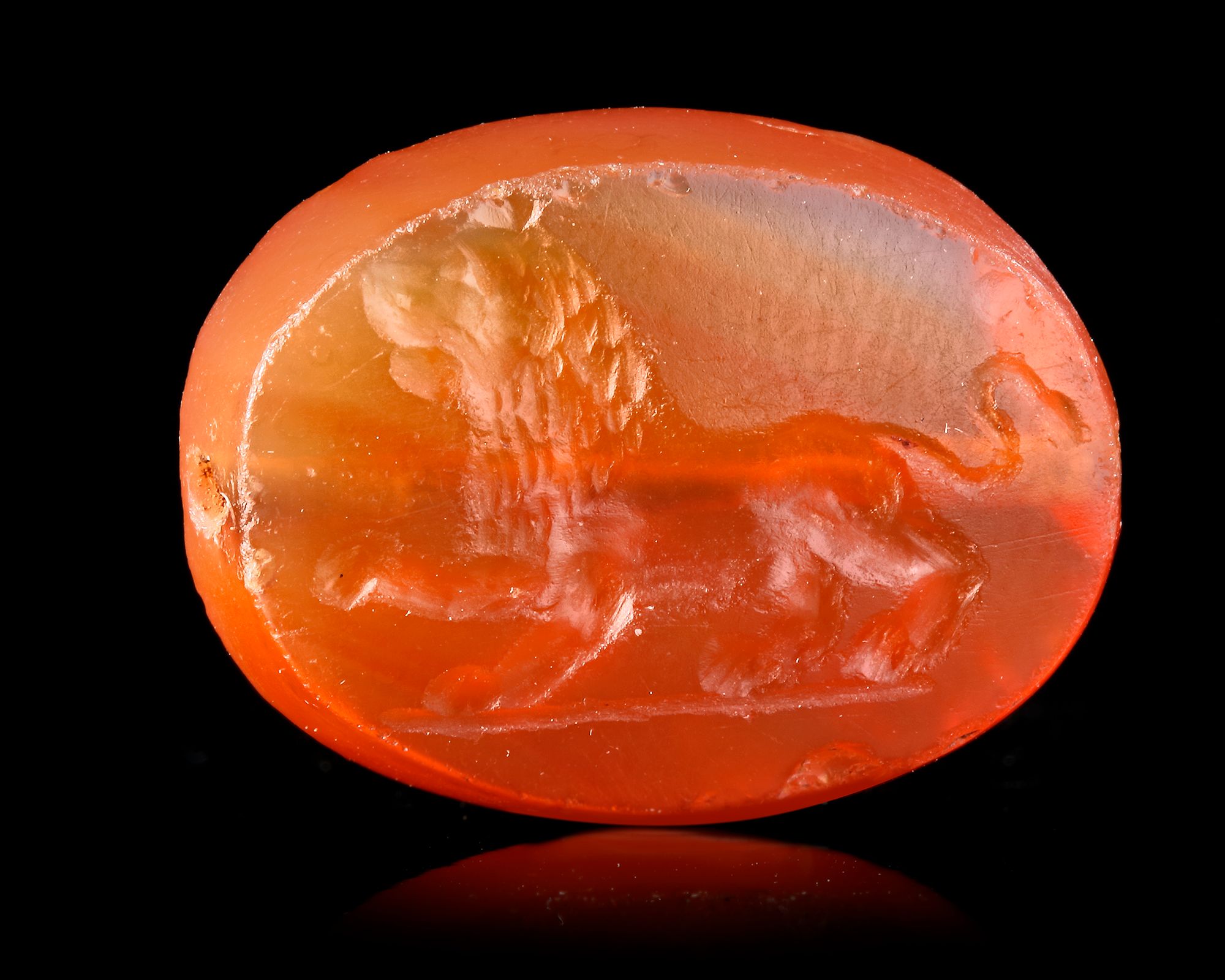 A carnelian scaraboid with a lion at bay with a front paw raised. The scaraboid has been drilled almost certainly to make a ring bezel which could then swivel to use the seal.