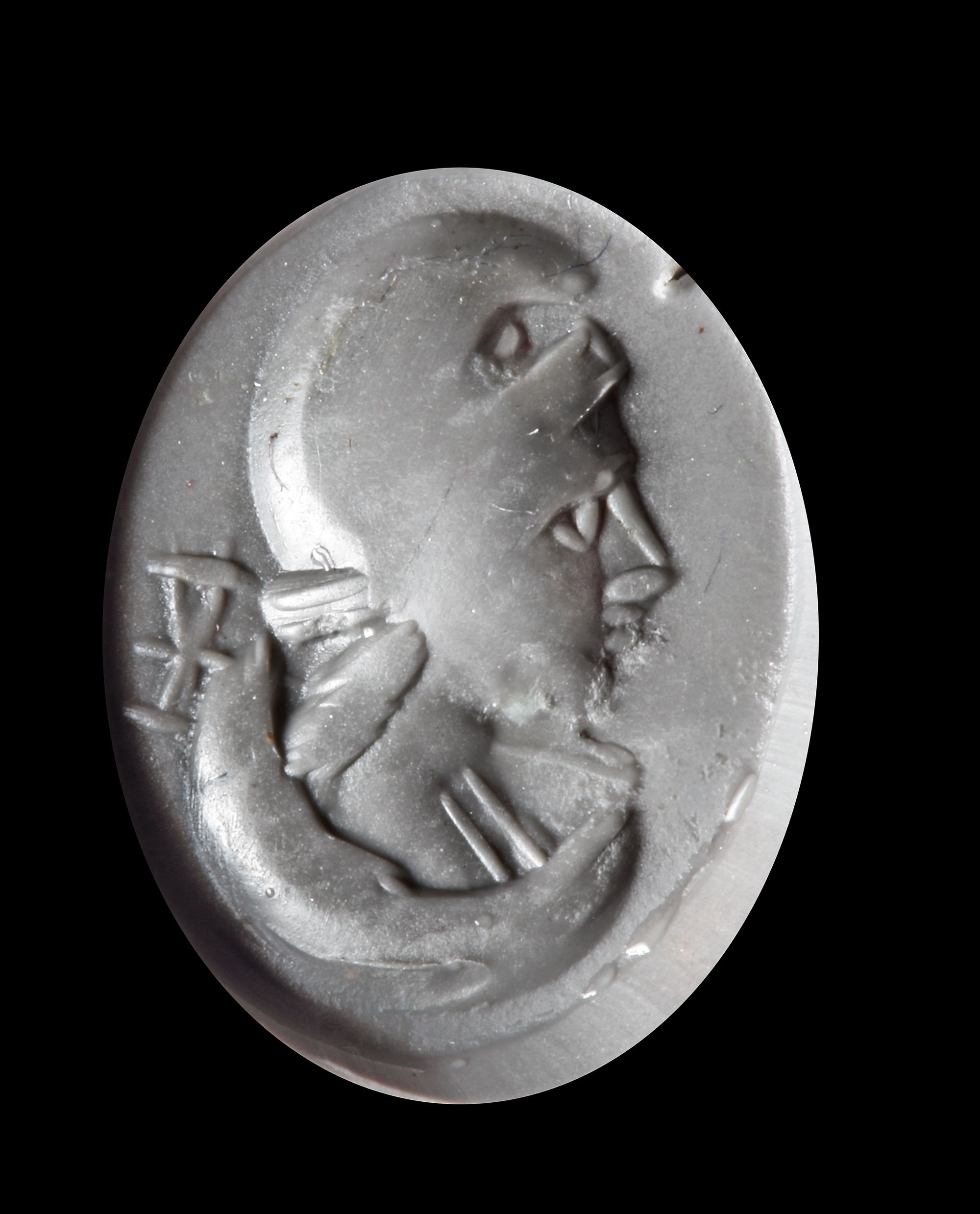 A Roman intaglio in dark red jasper showing a bust of Men facing left wearing a Phrygian cap and a bipennis or labrys over his shoulder. Below the draped bust is a lunate crescent, another attribute of the god. Men was very popular in Asia Minor where his cult had many adherents in the 2/3rd centuries AD.