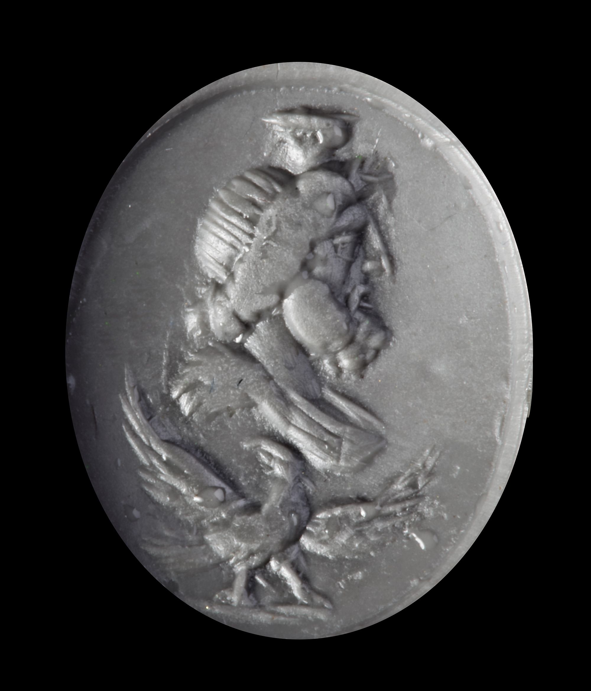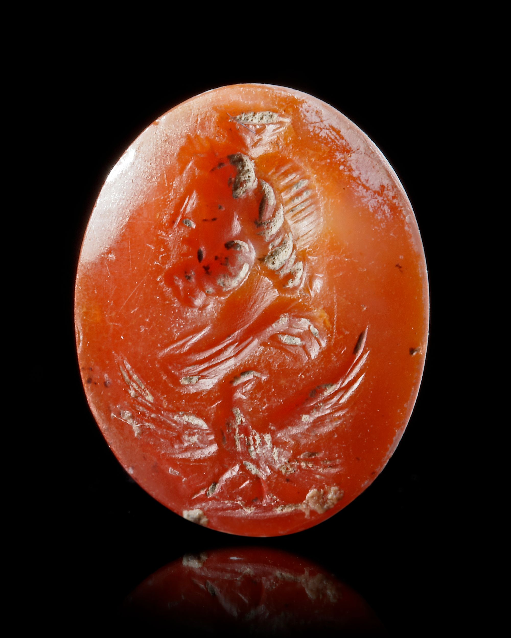 An opaque carnelian intaglio showing a bust of Serapis to the left surmounting an eagle with spread wings. A popular type supposedly with soldiers, the combination of Serapis and the eagle, symbol of Rome's power and Jupiter. This type was popular with soldiers and the chances are that the owner of this seal, once mounted in a ring, would have been in the military.