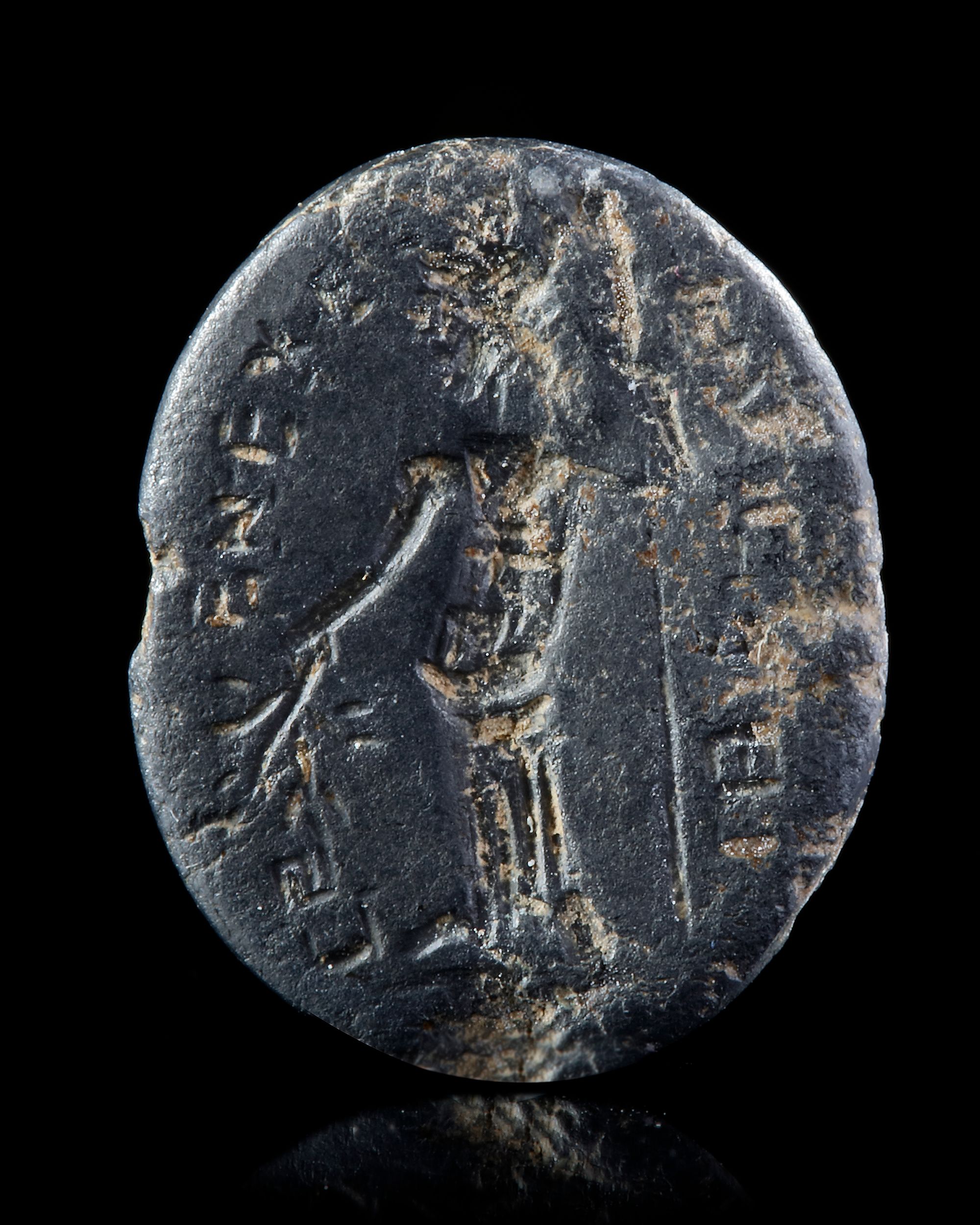Haematite intaglio showing the standing figure of a man facing left, draped and holding a sceptre and a branch downwards. The attribution of this figure might well be Apollo as he holds a laurel branch, one of his commoner attributes.