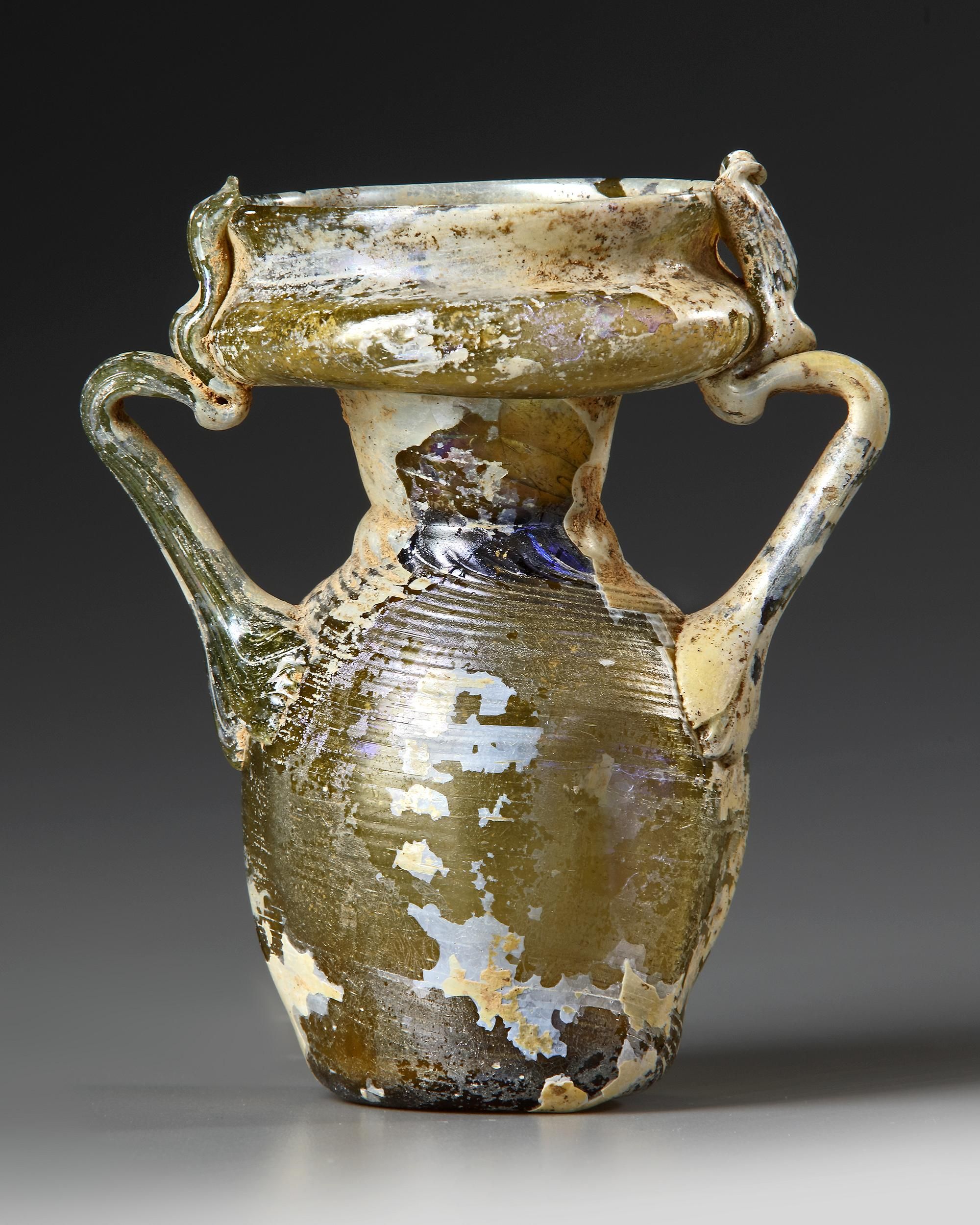 Translucent olive yellowish jar with a pair of undulating handles applied between the folded rim and broad shoulders. The round vertical lip with tapering hollow body with some silver iridescent.