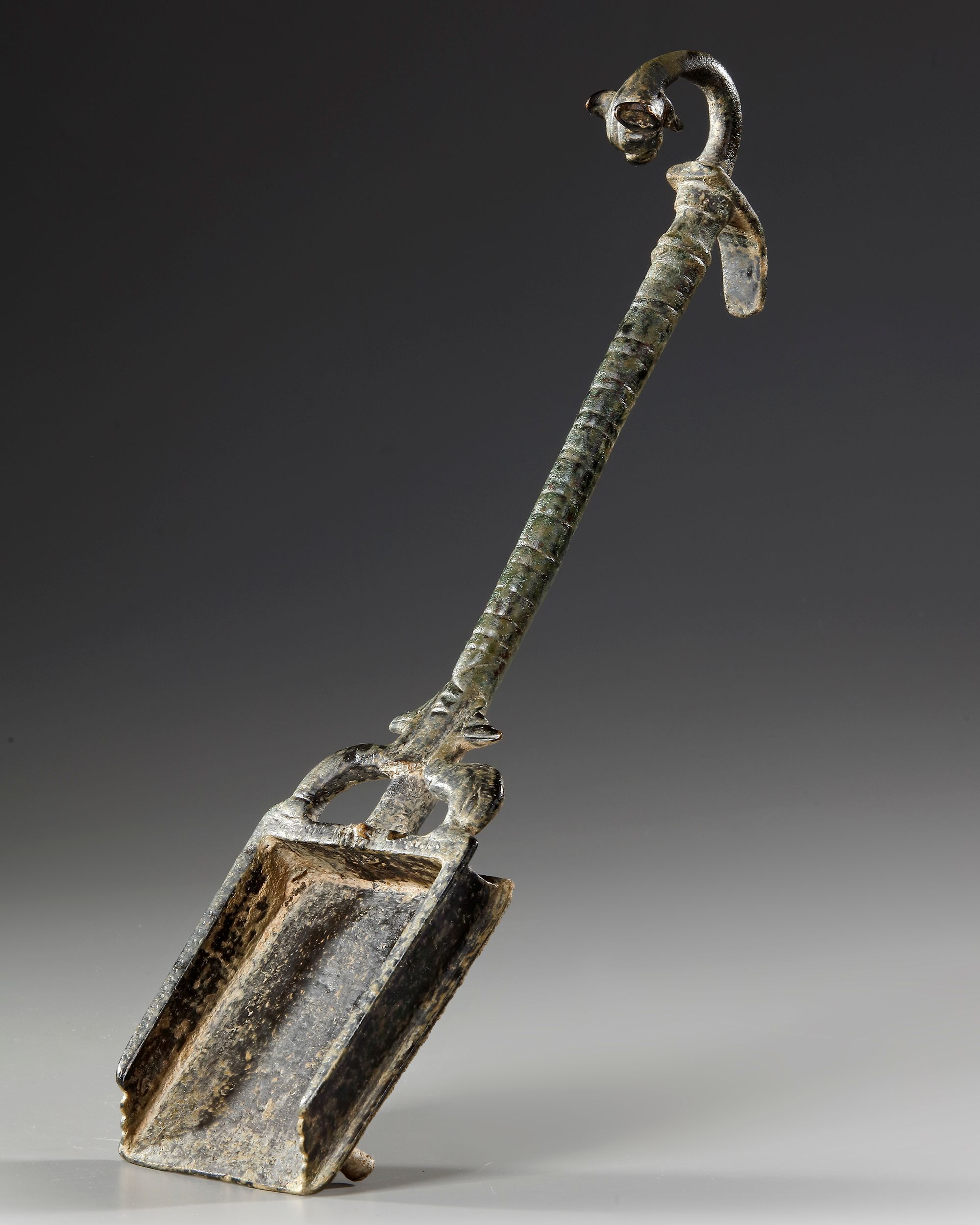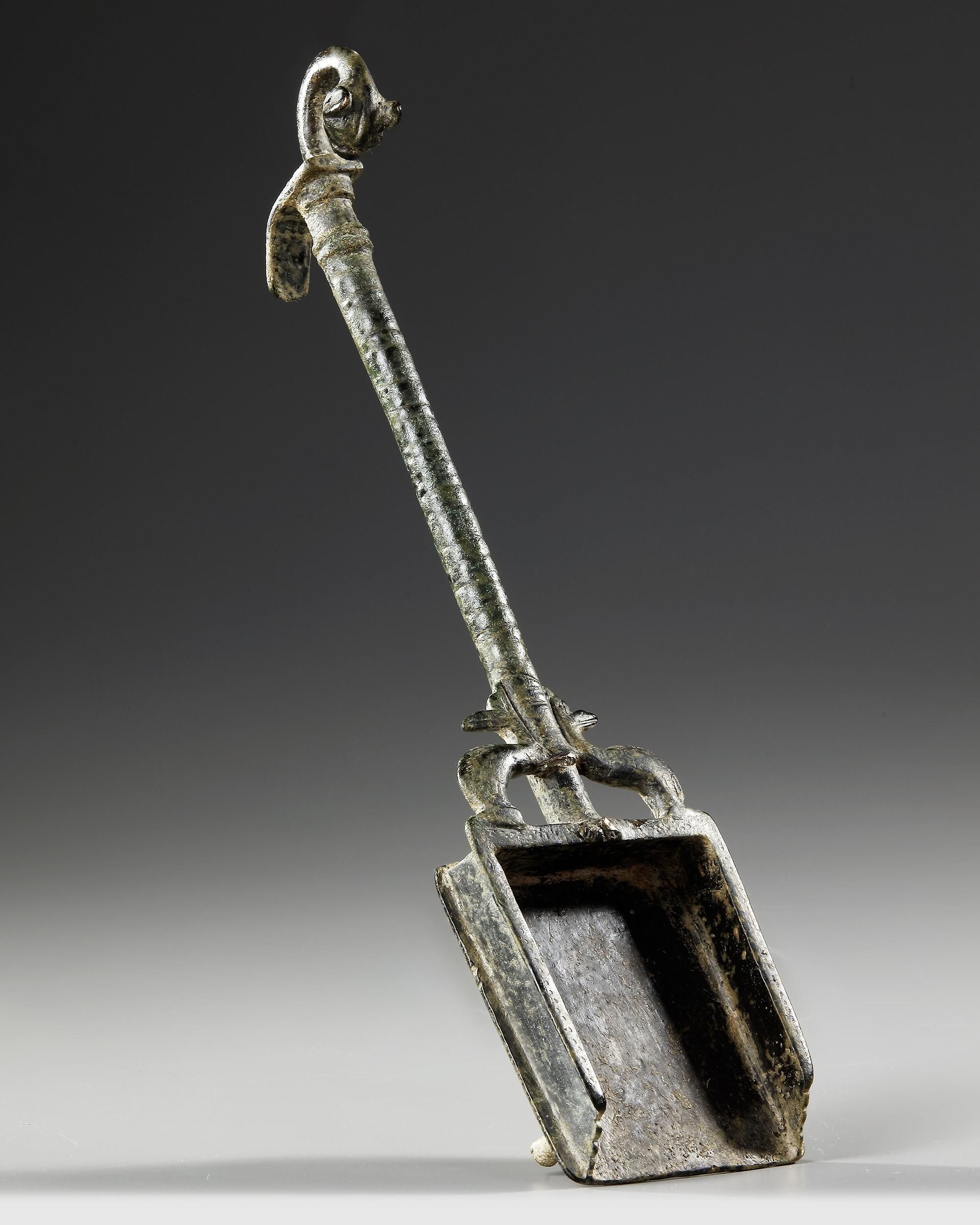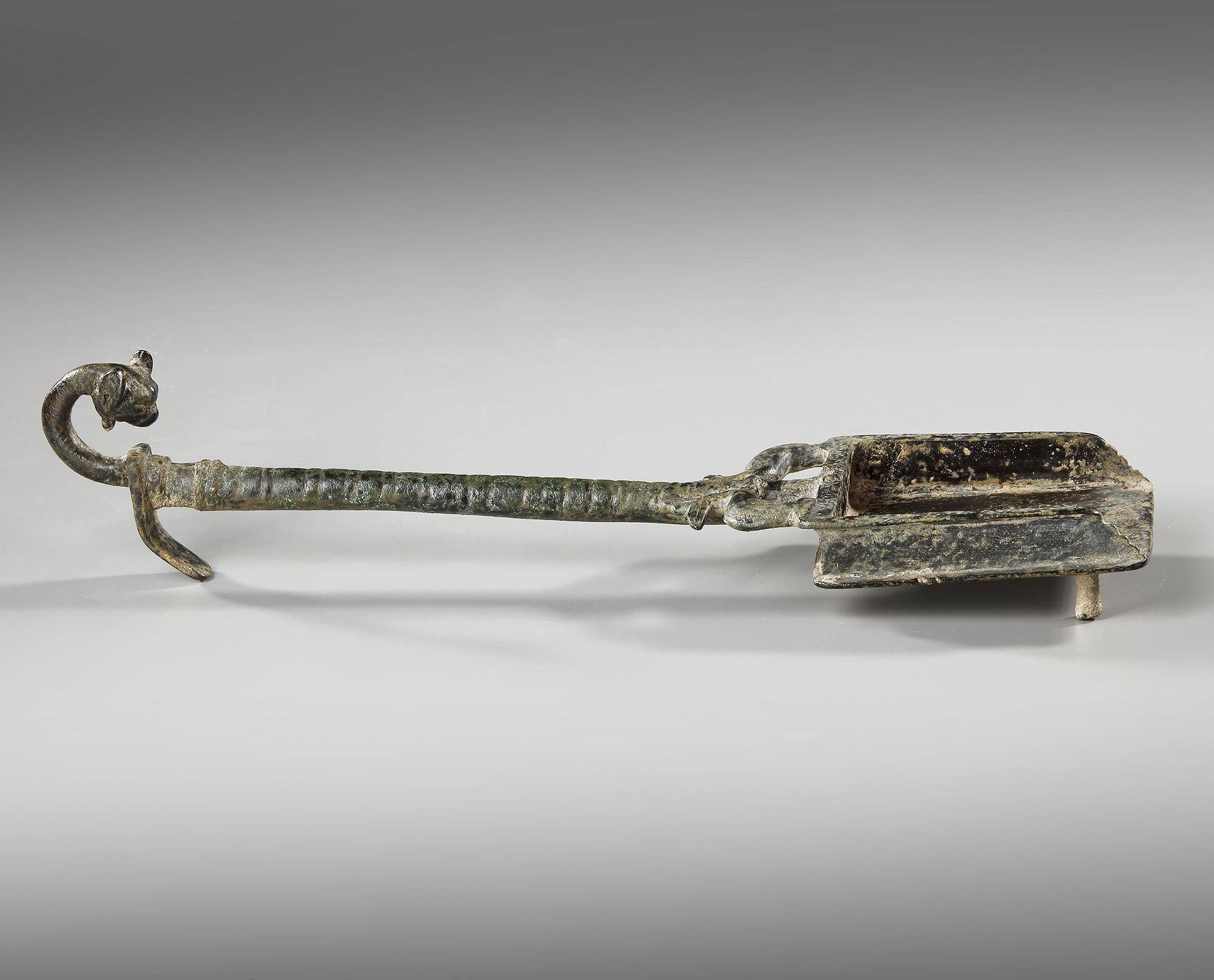 A bronze incense shovel with square end and dolphins either side of the handle which extends to a curving end with a panther head, foot below.
