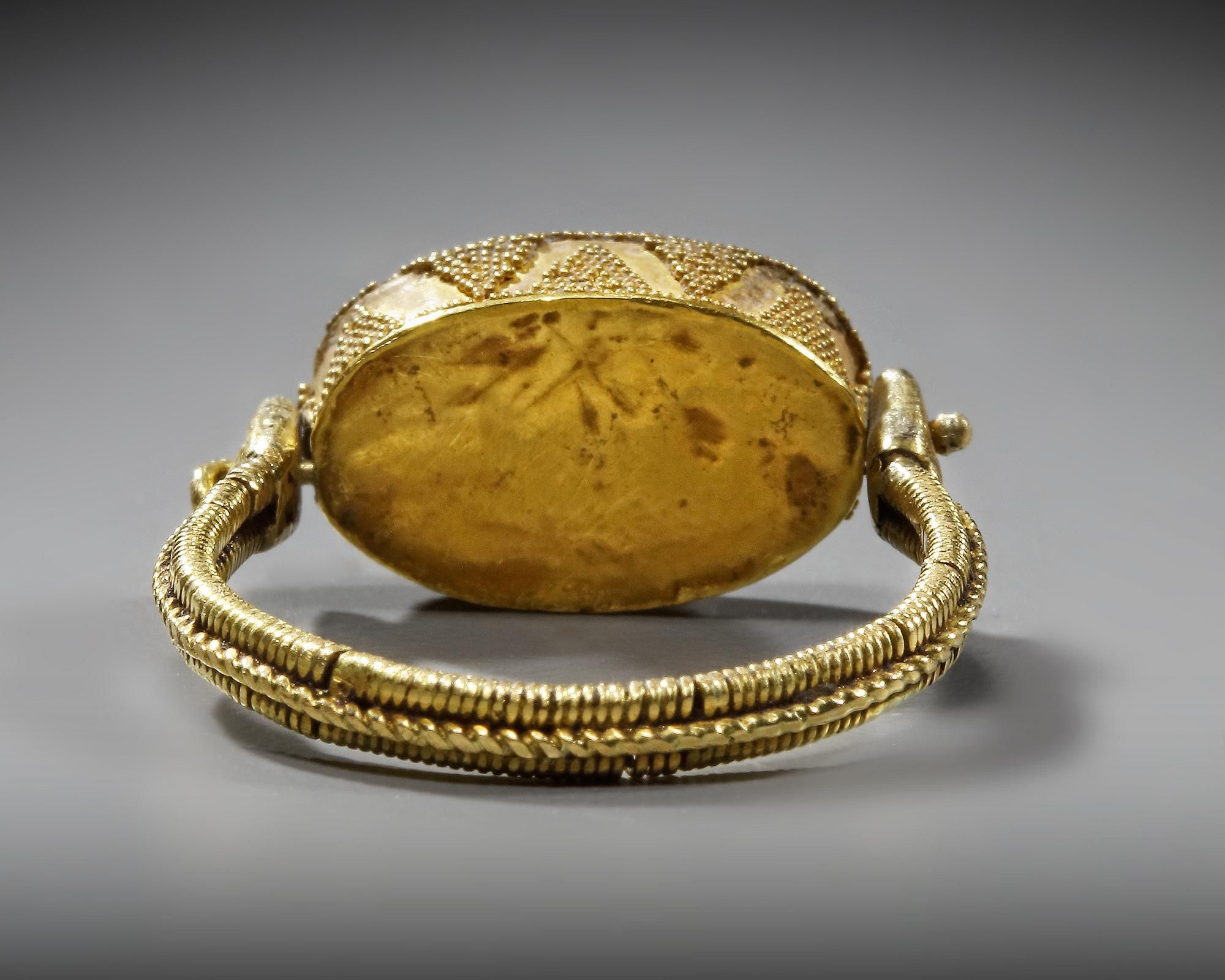 The shank of the ring is formed of three soldered beaded wires which are joined to the bezel by a wire which passes through it in order the the seal can swivel. The intaglio shows a horse feeding or drinking. The seal is mounted in a filigreed oval cell.