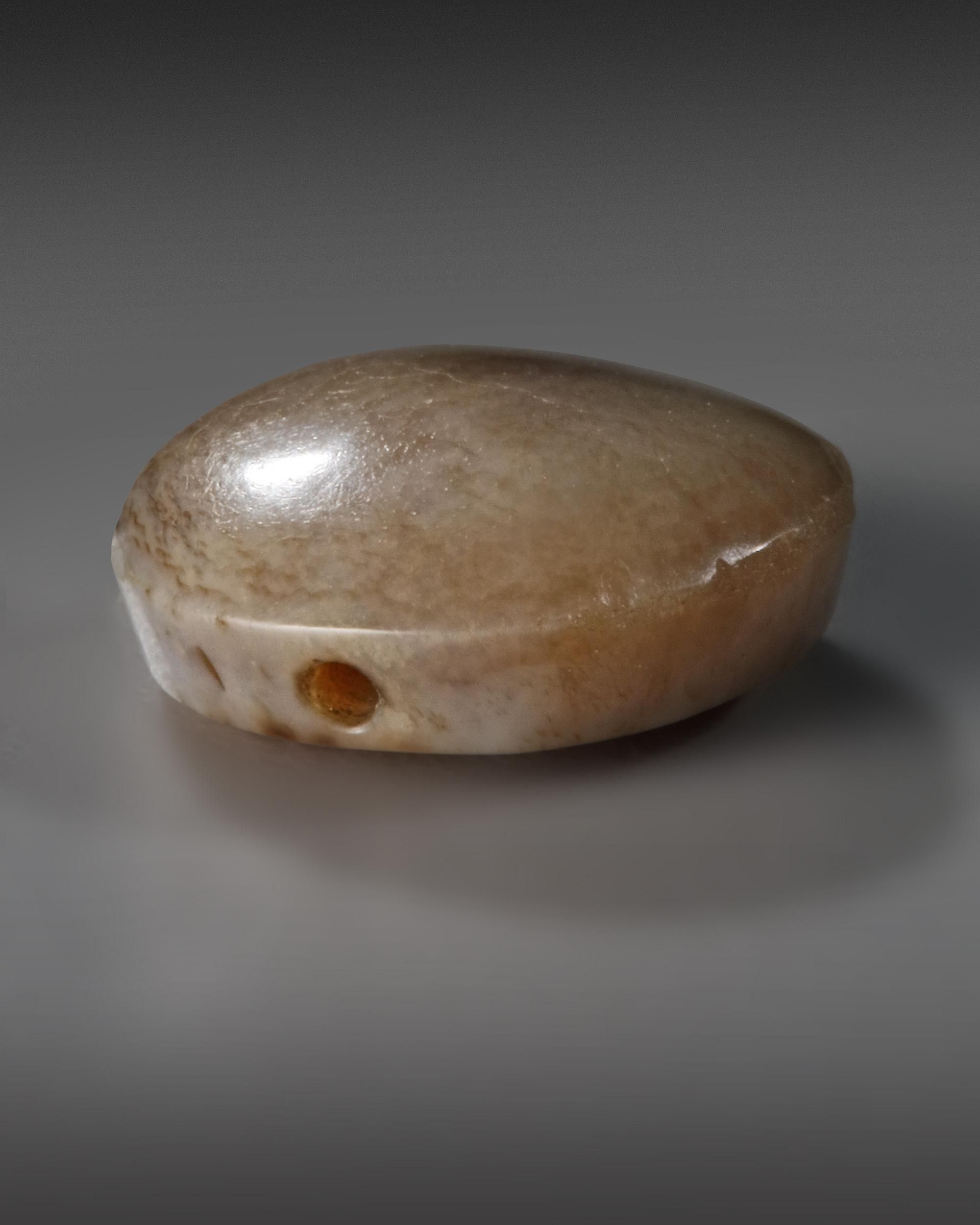 A seated Persian woman with a flower. Engraved on the underside with a woman seated on a chair, wearing a long pleated chiton and a crown(?), her hair in a long braid at her back, holding a flower out before her.