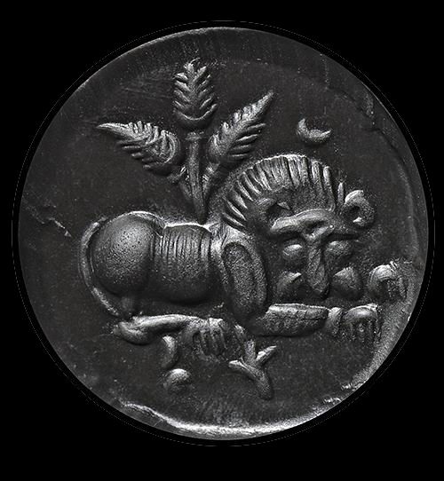 A nice example of a carved agate dome shape stamp seal having a drilled suspension through the centre. The carved stamp depicts a beautifully detailed crouching lion, and a tall plant or tree in the centre background.