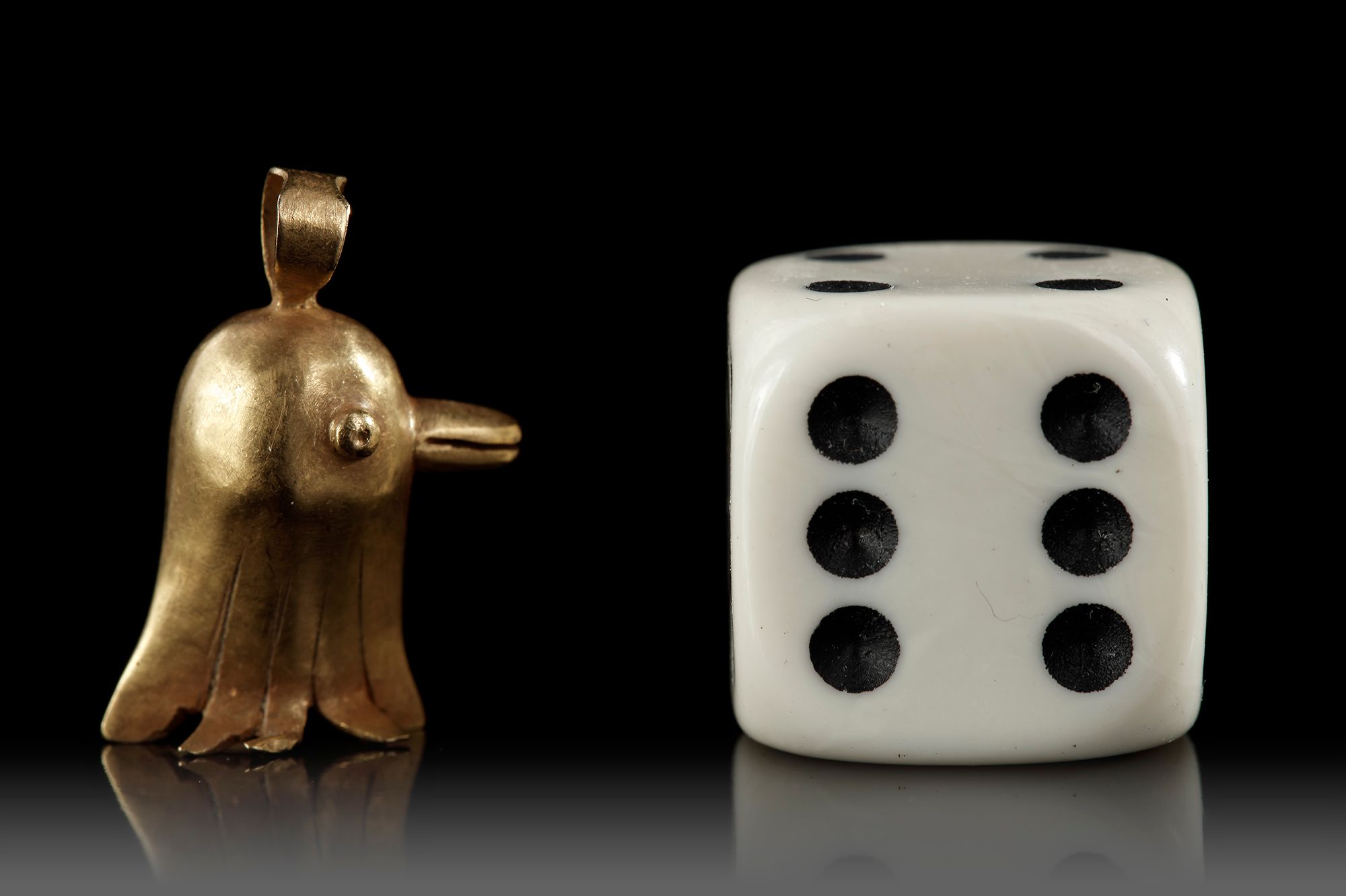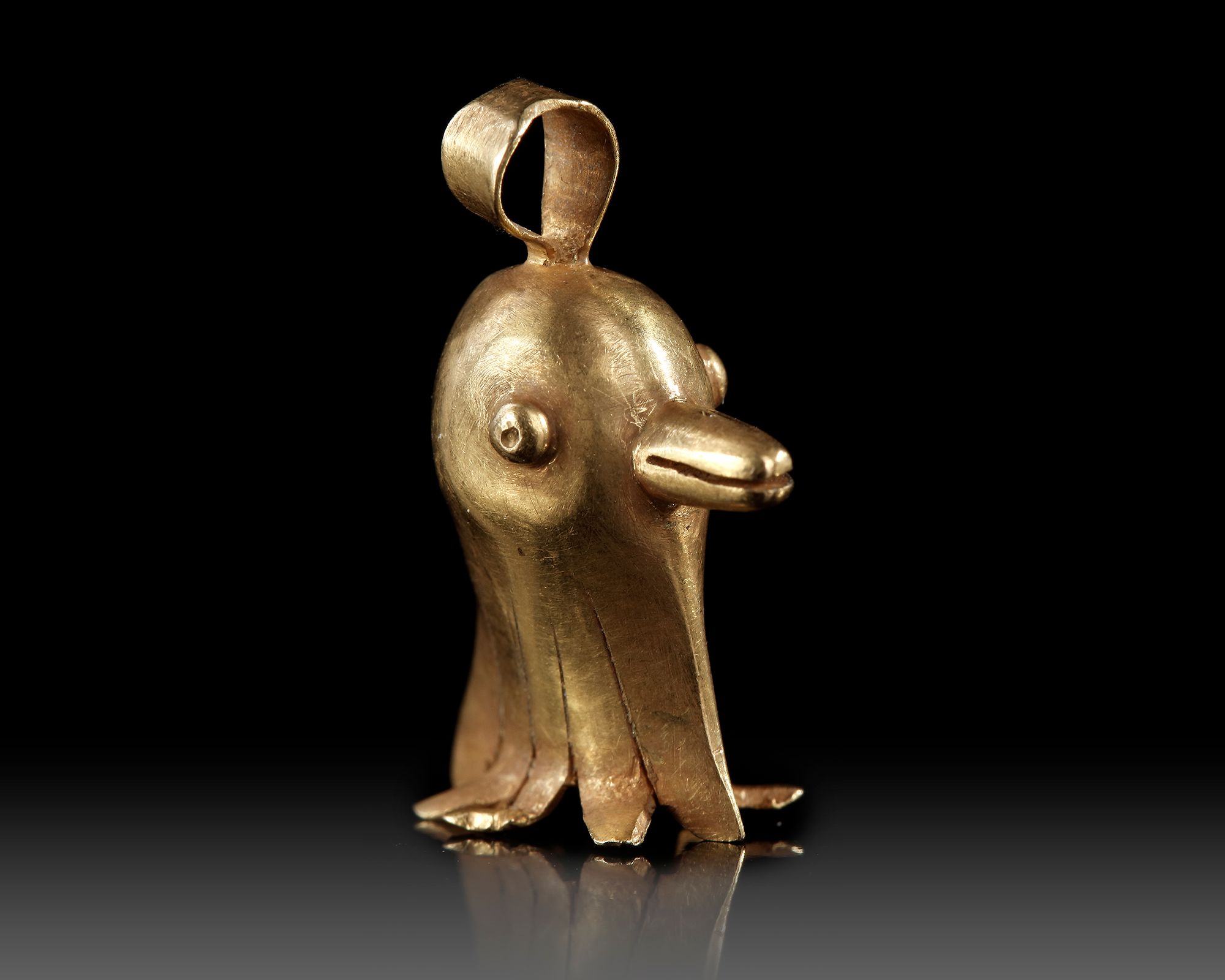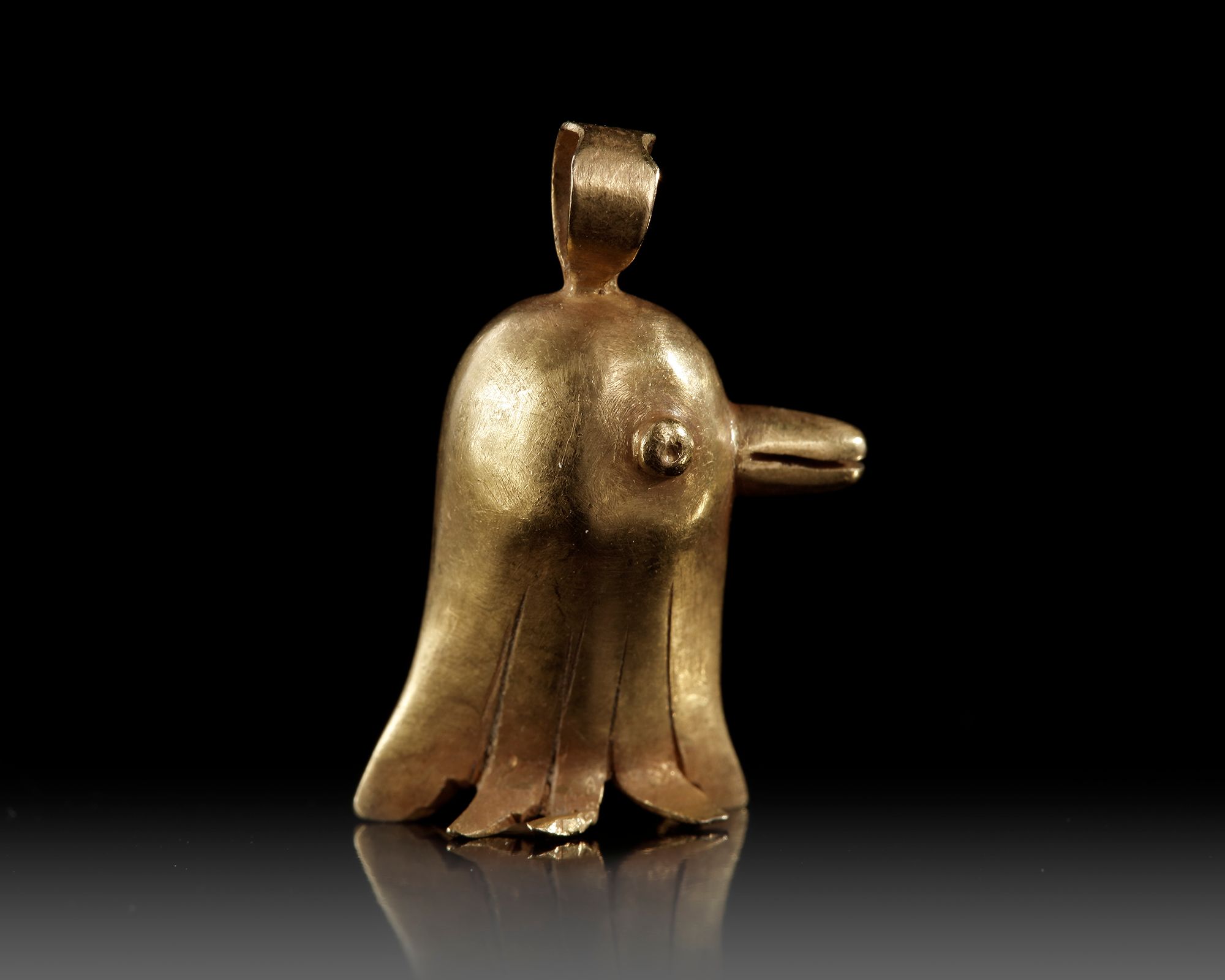 A finely crafted Roman gold pendant shaped as a stylized bird’s head, featuring a rounded form, protruding beak, and expressive eyes. The lower edge is split into decorative flared sections.