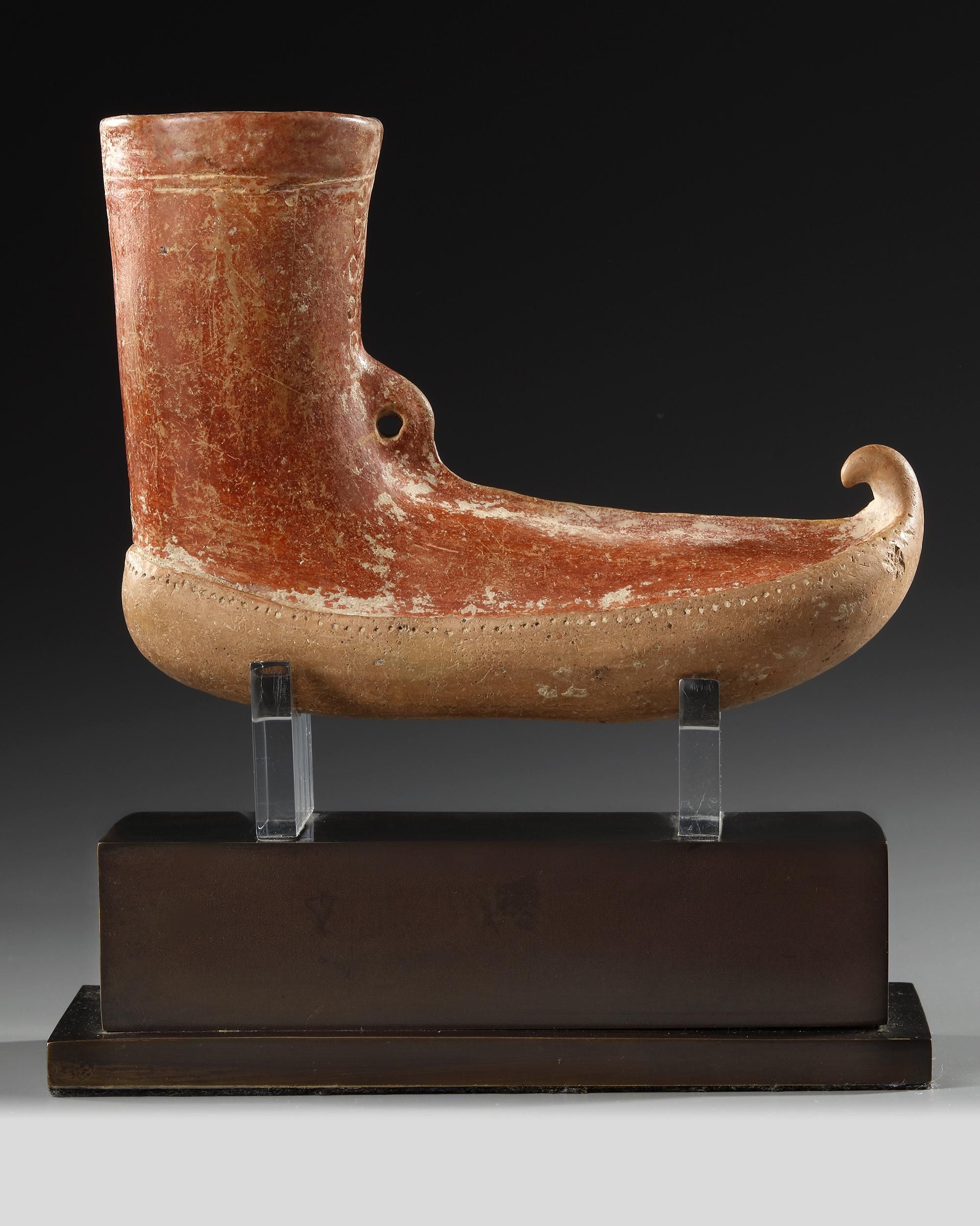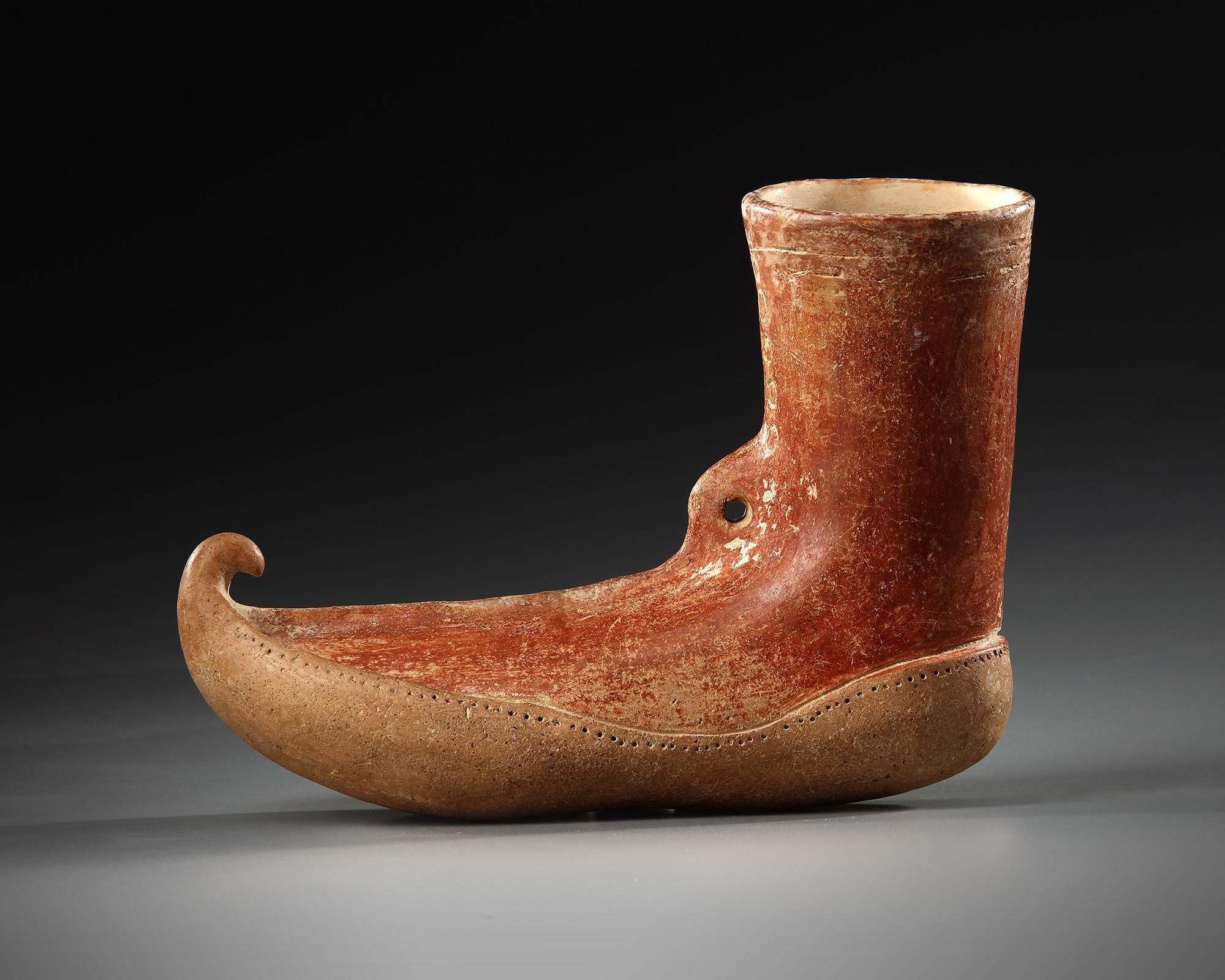 An Amlash pottery Rhyton in the form of an ankle boot, the sole with pointed curled toe cap. Around the edge of the sole there are small holes which indicate the stitches attaching it to the upper part. The collar of the boot which expands gently to the rim is incised with ten circular marks indicating the holes for the laces, these surround the central seam. Below the seam there is a lug for suspending the Rhyton.