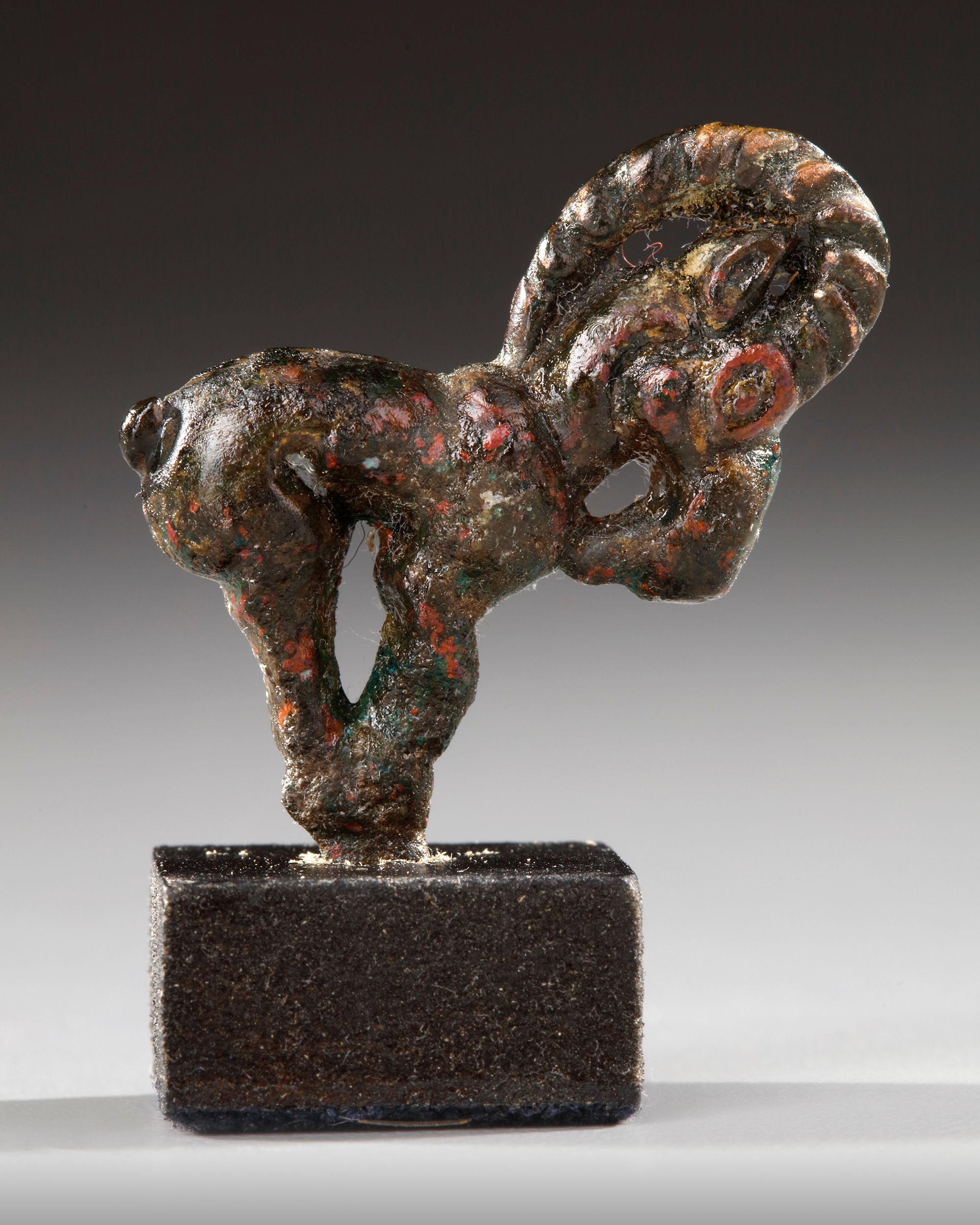 A fine cast bronze openwork composition with feet joined together, head slightly turned downwards, ridged horn pointing backwards.
