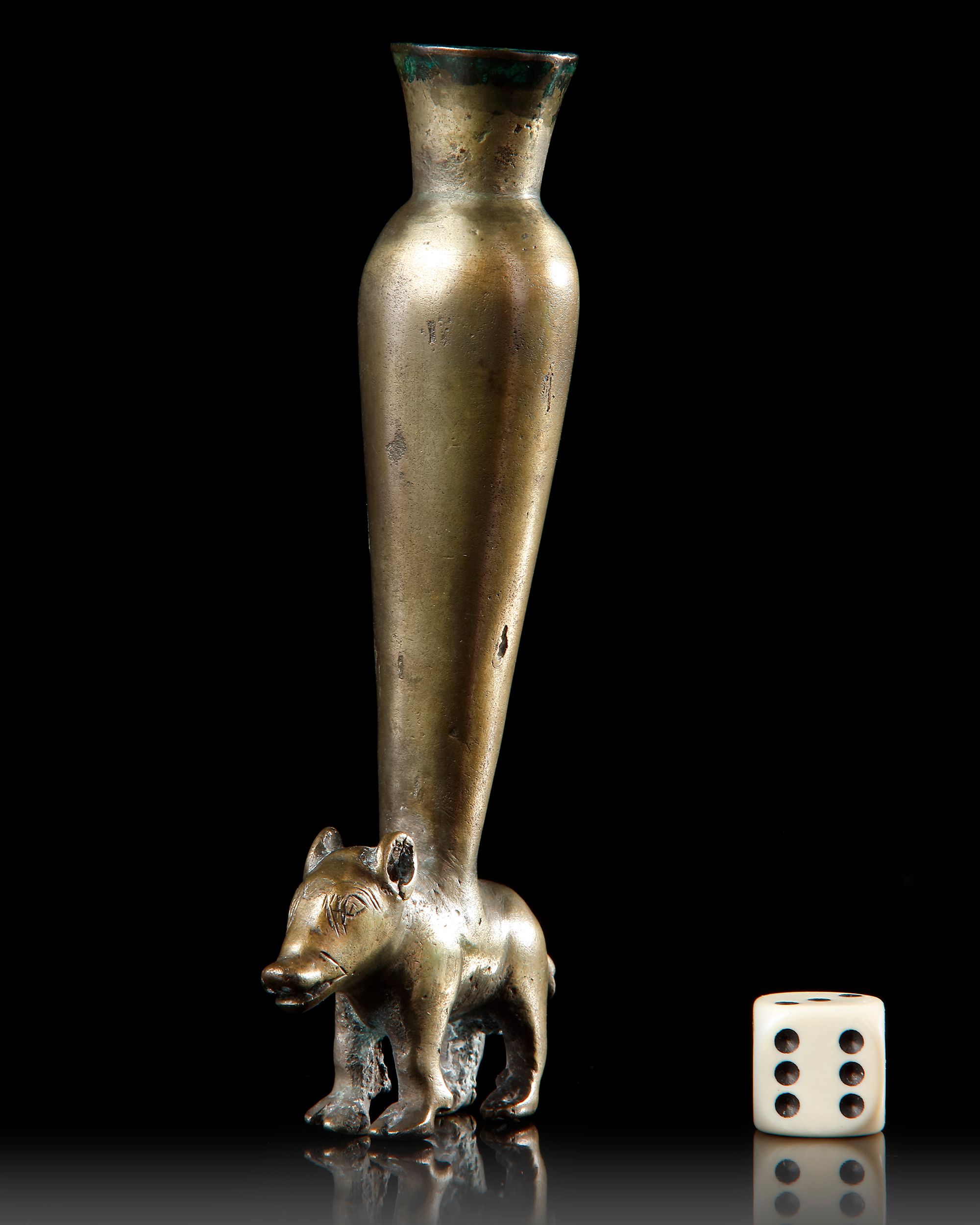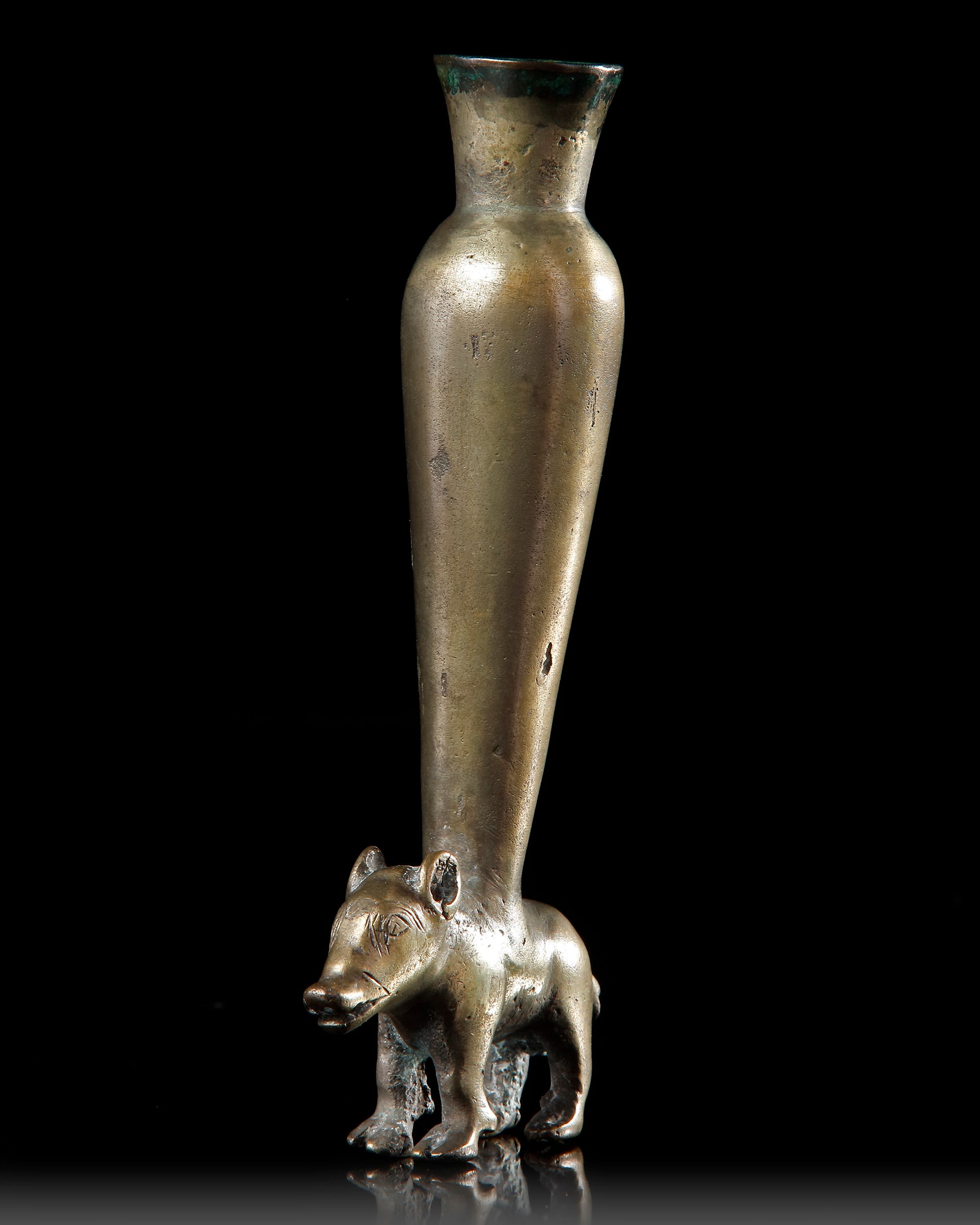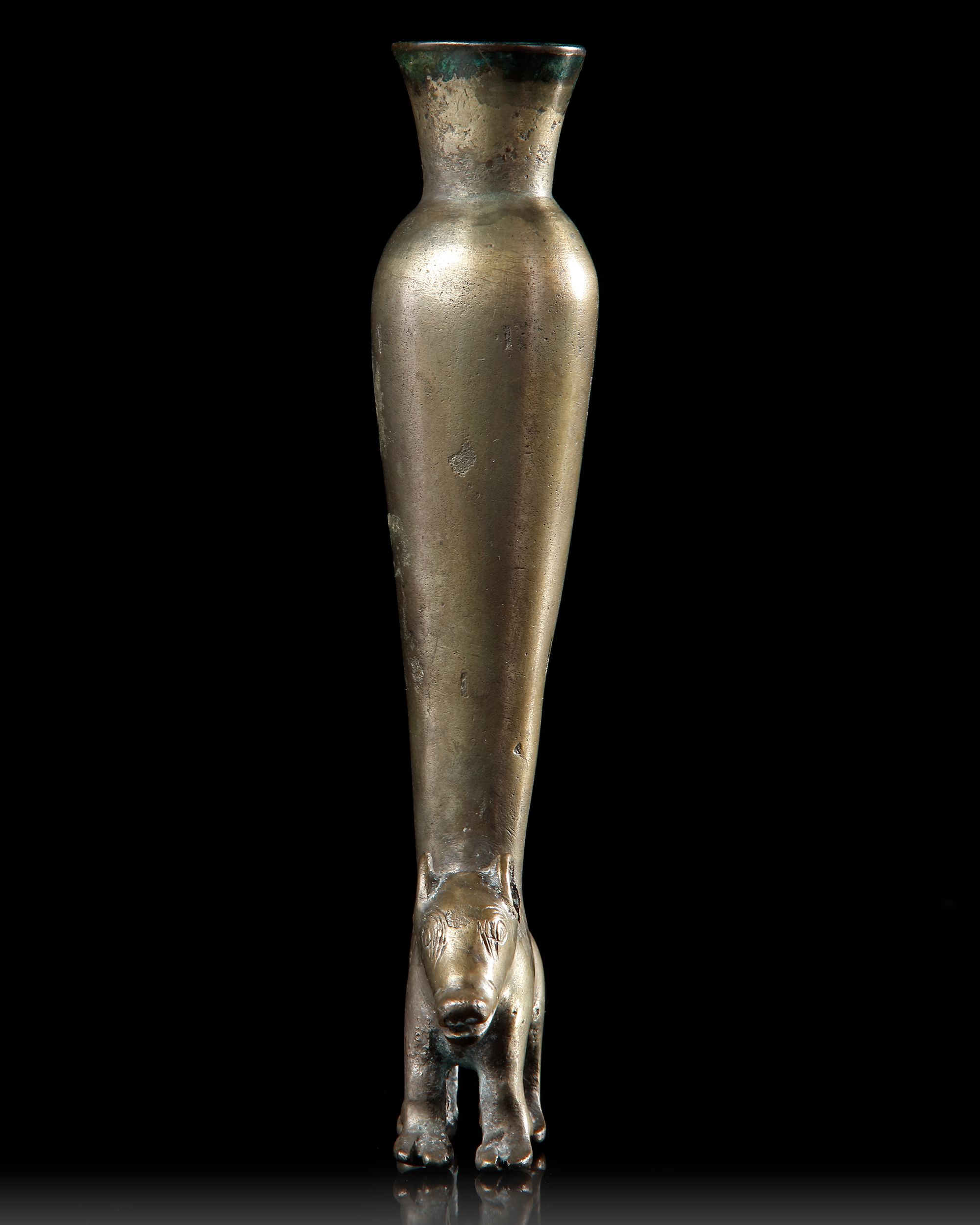 The boar standing foursquare, the details of its face incised, a tall vessel emerging from its back with a rounded shoulder and flaring rim.