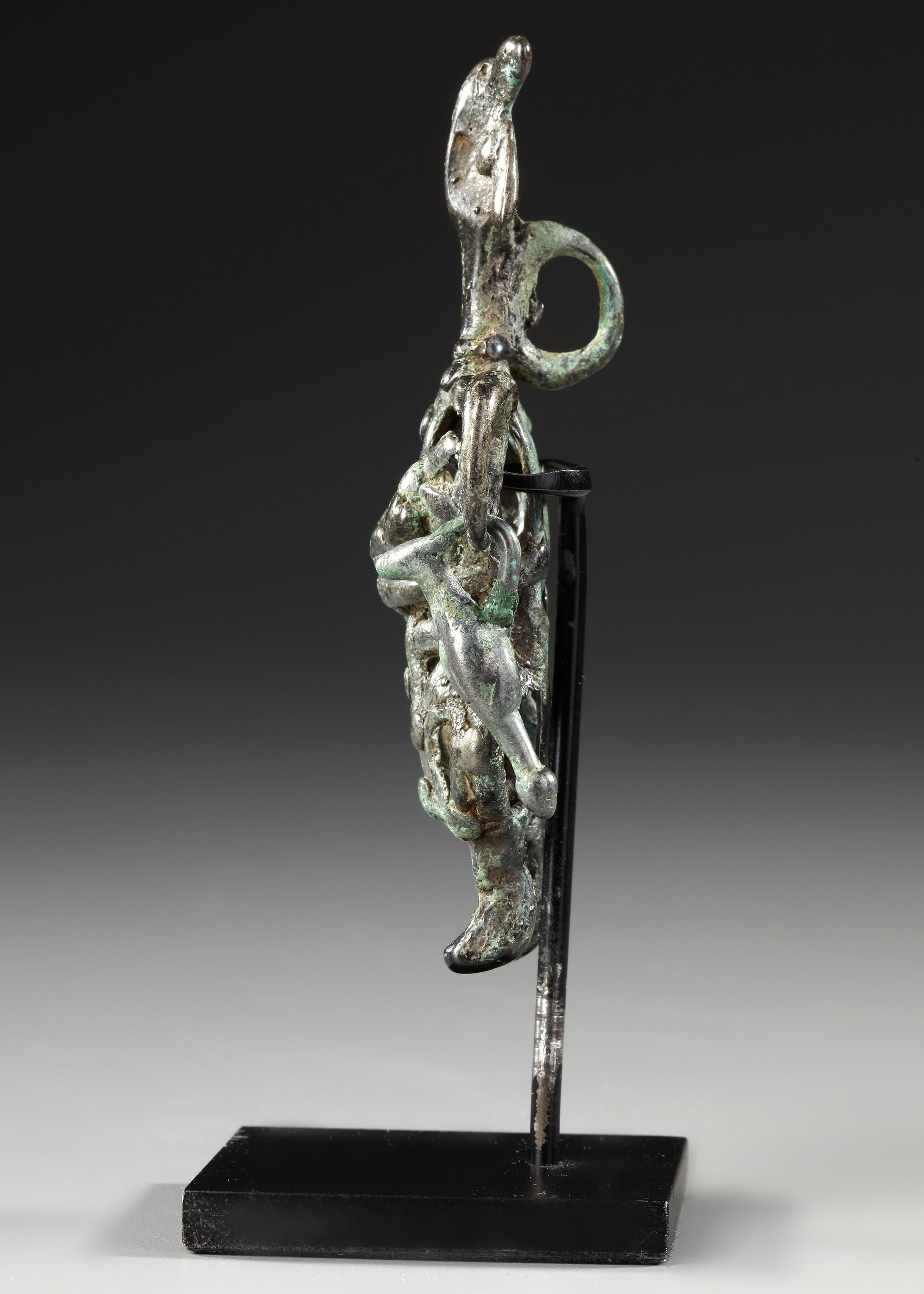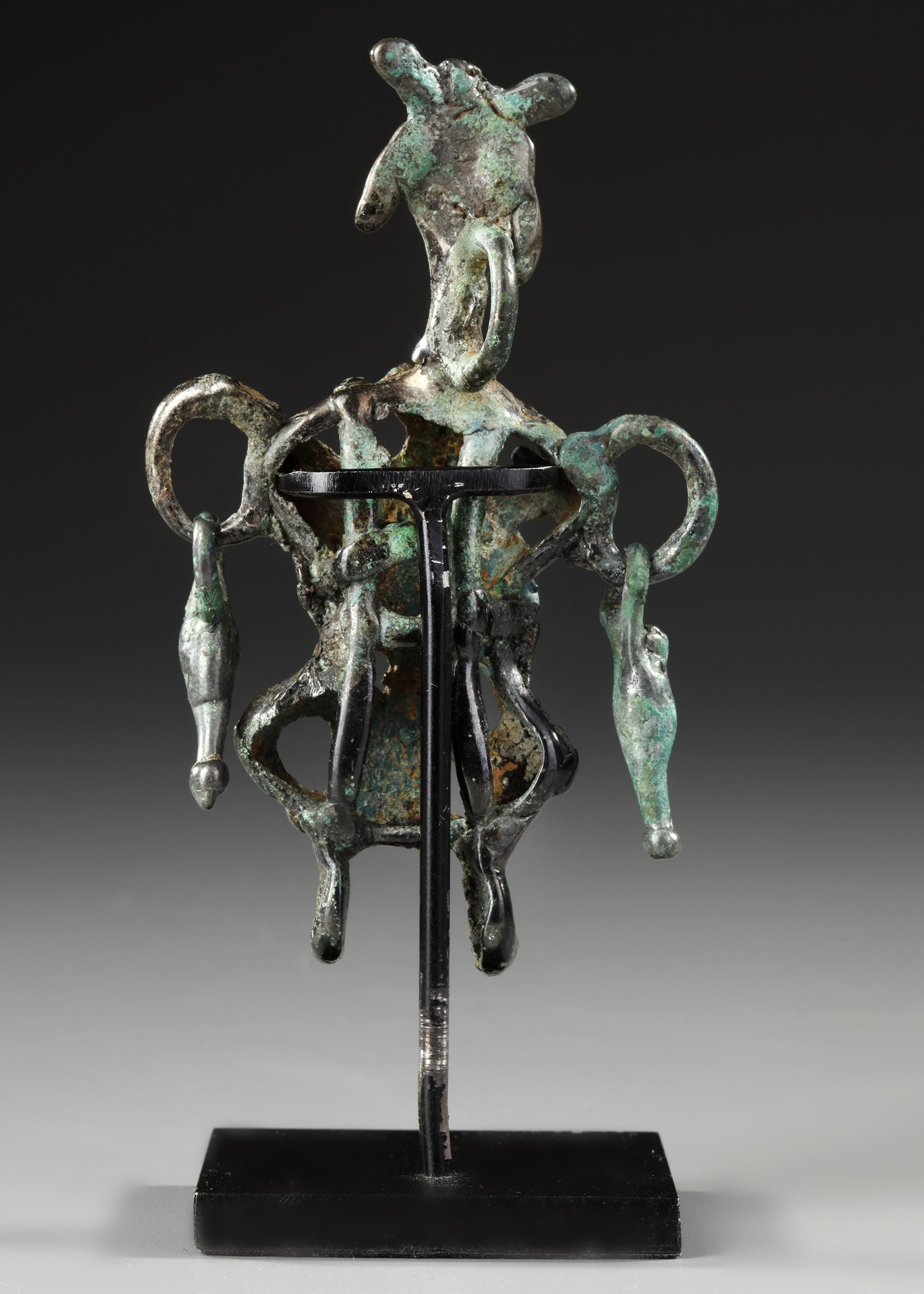 A bronze figure, with a hollow-formed body with loops to the shoulders and attached stub arms, arms folded to the chest, arms to the front holding a baby and loop above.