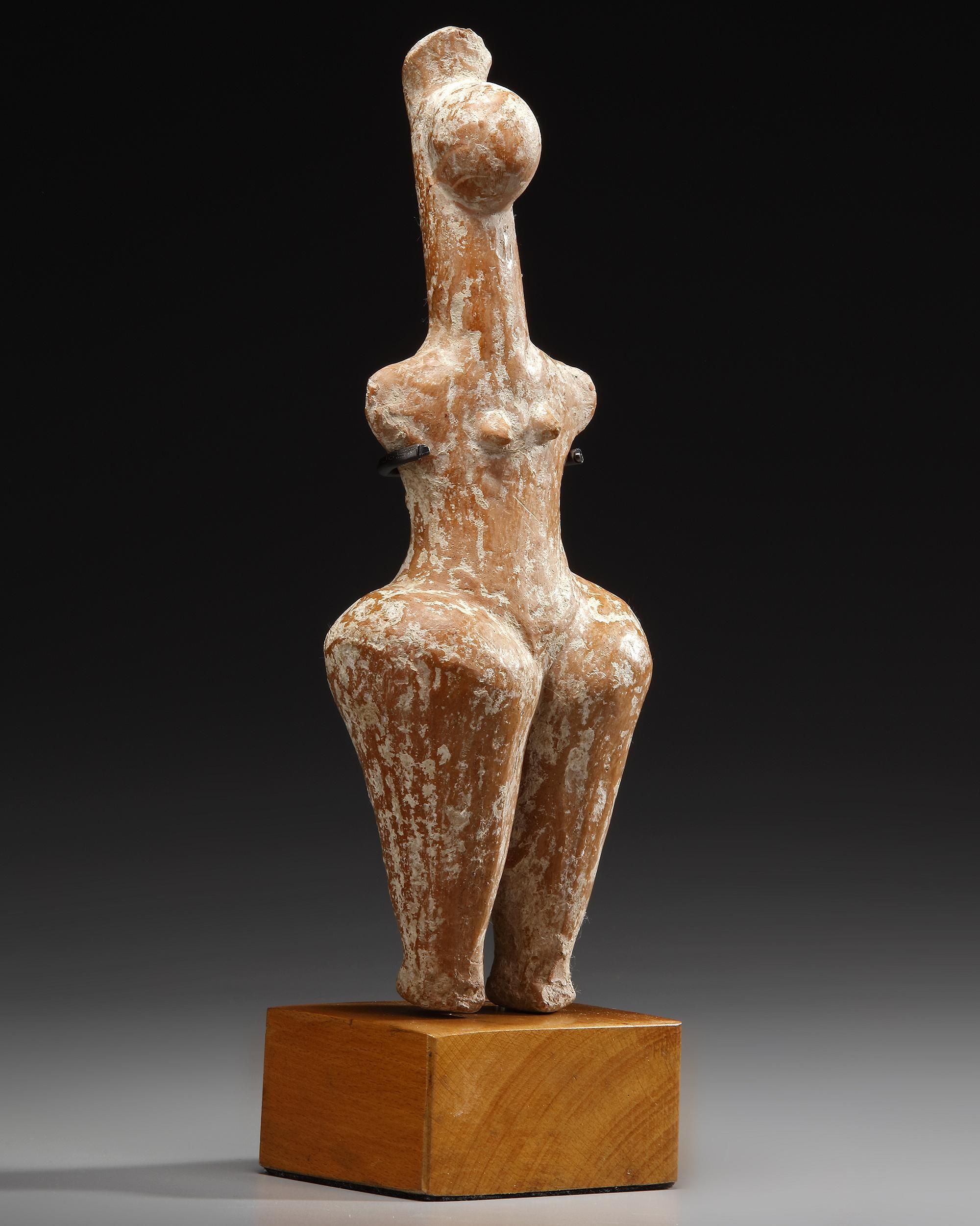 Typical stylised form, the bulbous face surmounted by a low polos headdress, with elongated neck, vestigial arms, small pointed breasts and exaggerated curved hips, the broad thighs tapering to small feet. The highly stylised and exaggerated heavy-hipped female figures of the Amlash and Marlik cultures demonstrate a reverence for female fecundity.