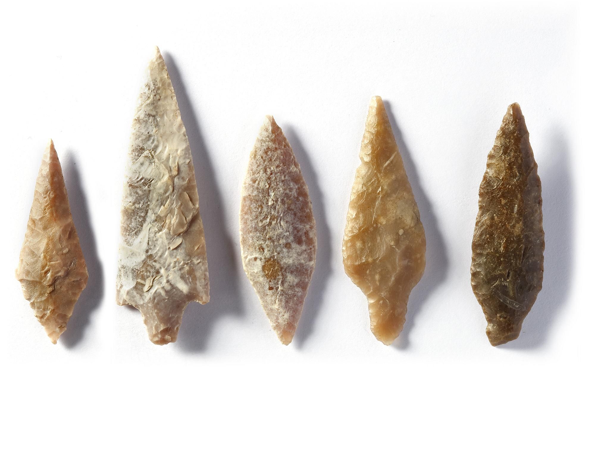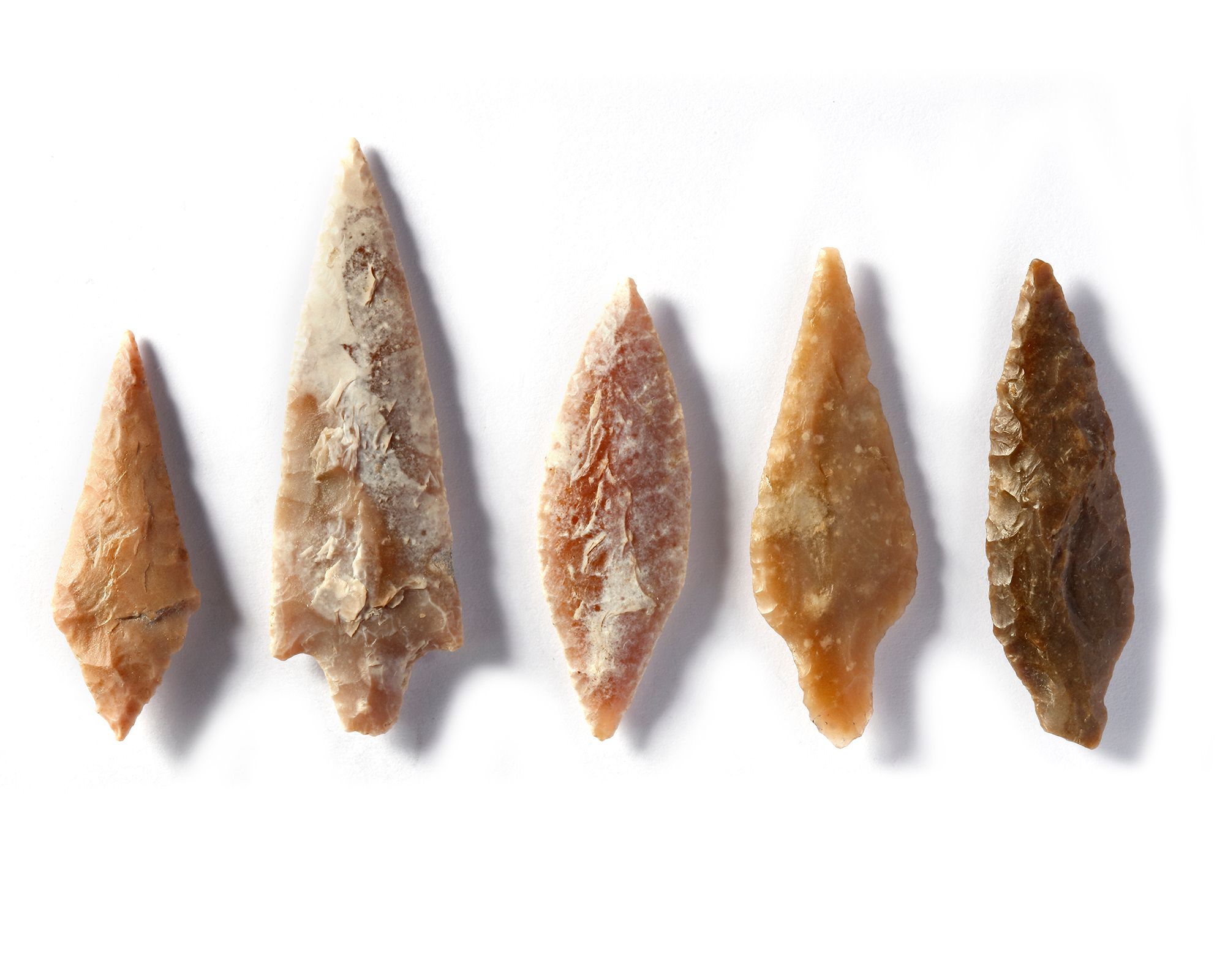 A group of five flint knapped and tanged arrowheads. Largest 5 cm., smallest 3.5 cm. Weight: 10.37 grams.