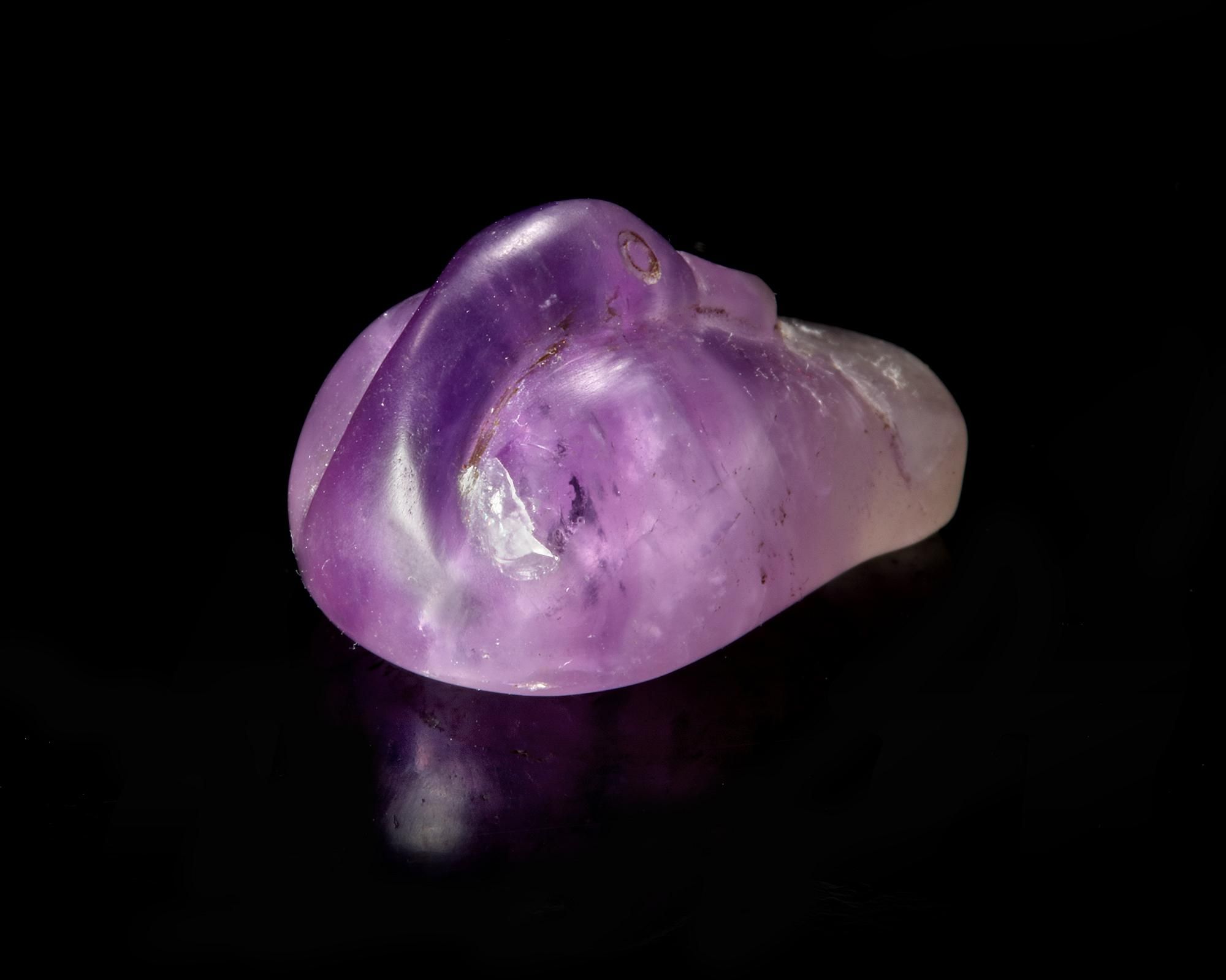 A Mesopotamian amethyst duck weight with head turned back. This is a common shape of weight, "sleeping duck". 19 mm. length. 3 grams.