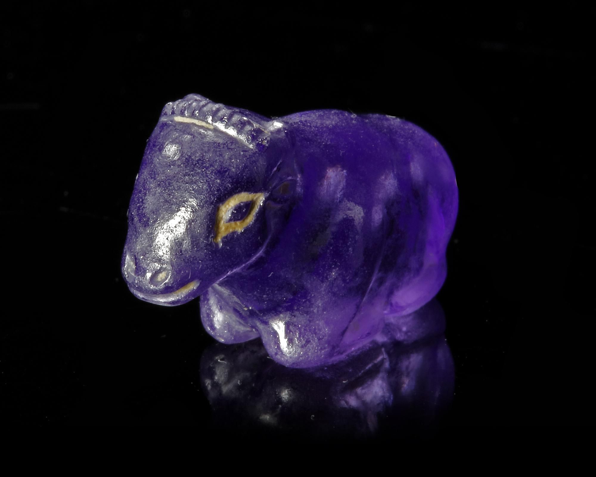 A finely carved amulet of a cow or ox with legs folded beneath the body, head facing forward.