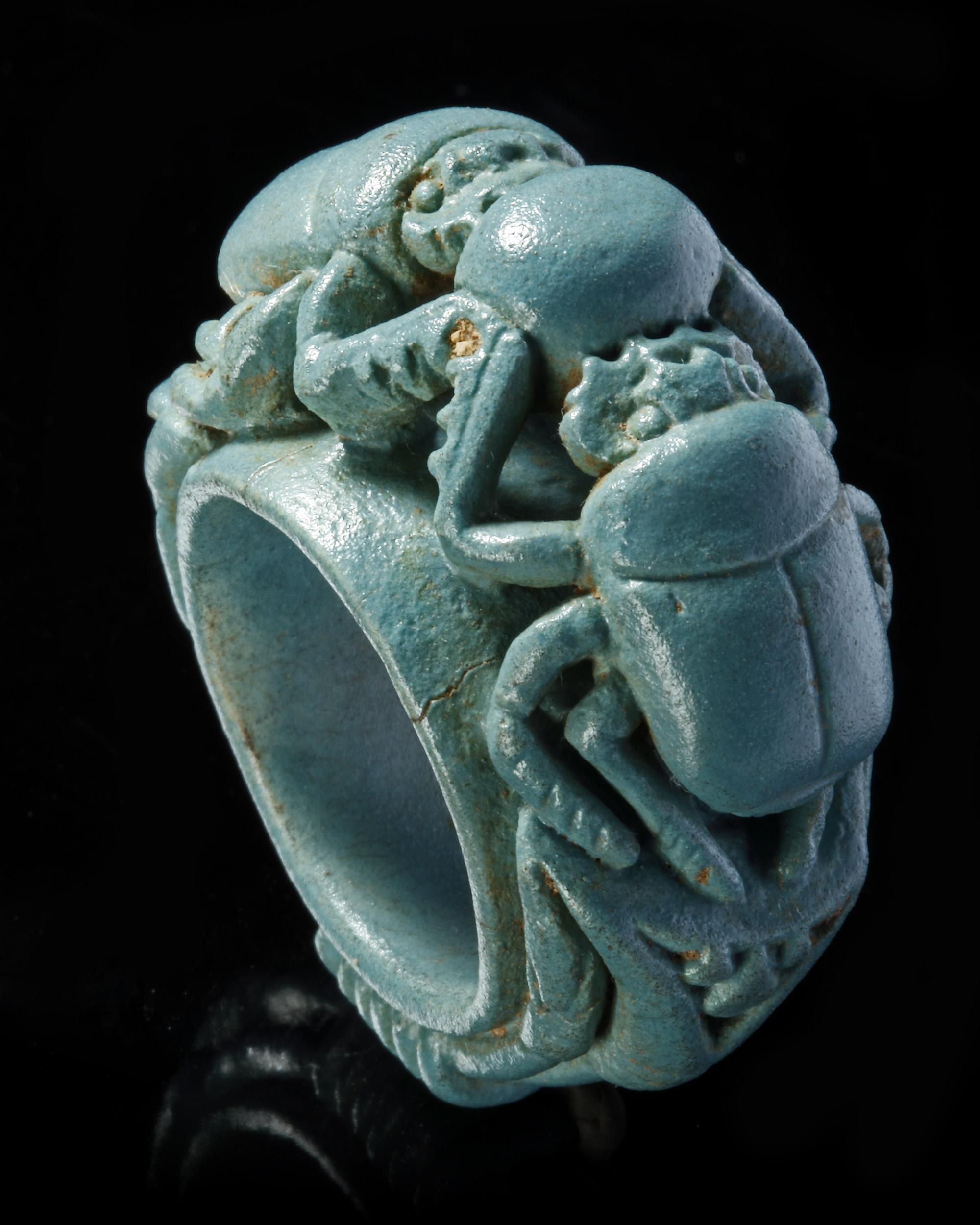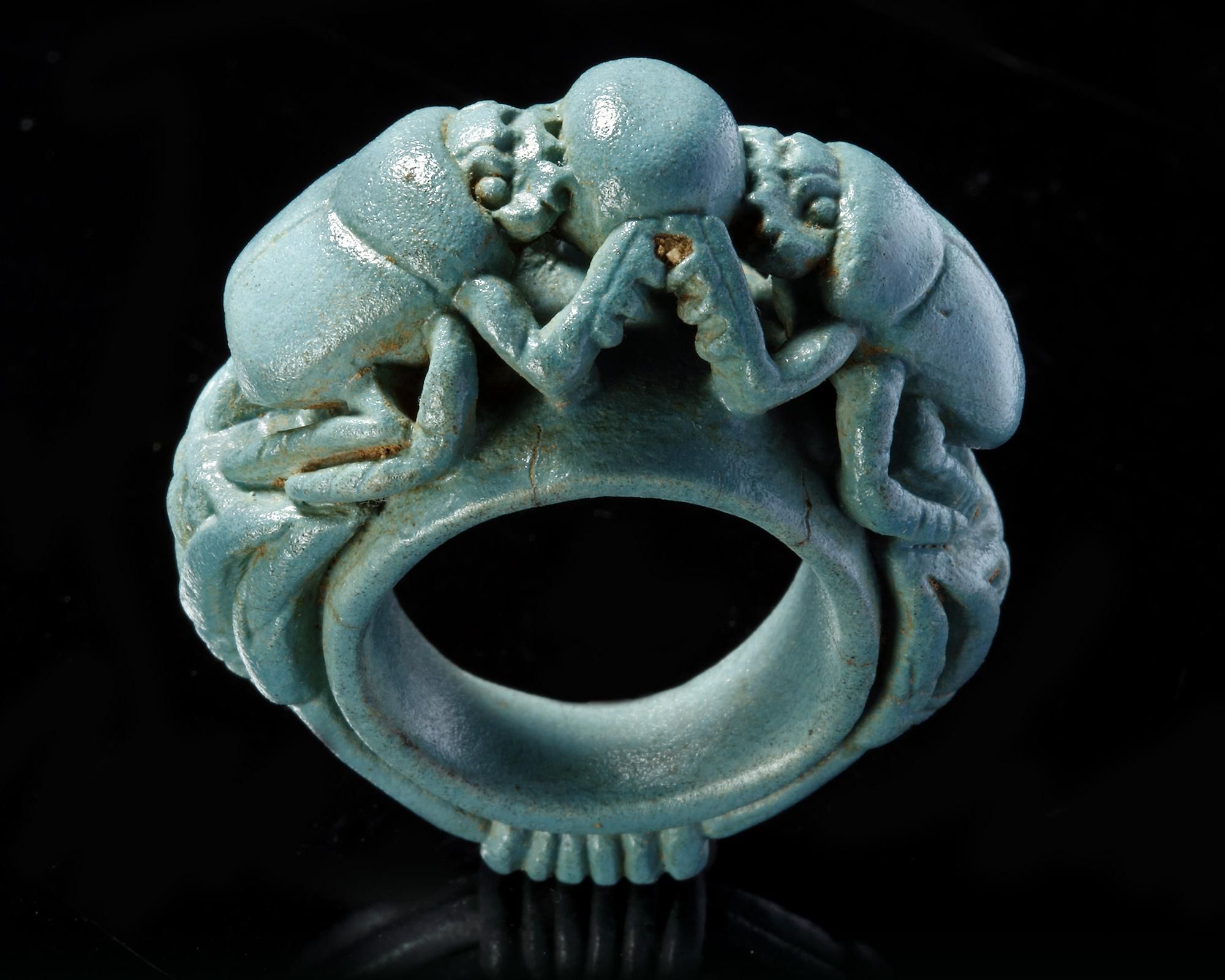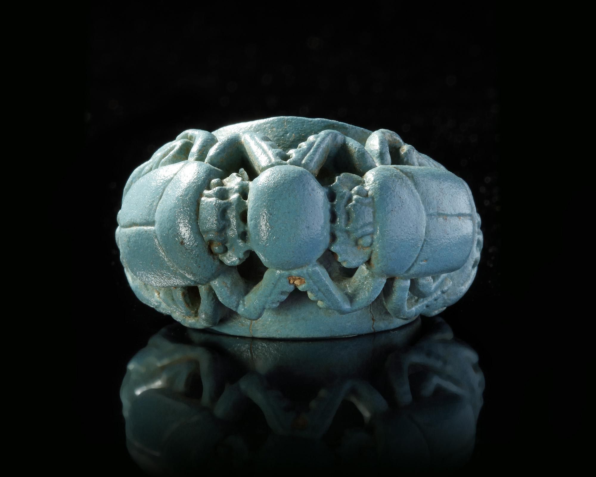 A glazed finger ring with papyrus flowers decorating the lower shank. The bezel is formed as two scarab beetles rolling a dung ball between them. The manufacture of this type of ring was continued till Ptolemiac period.