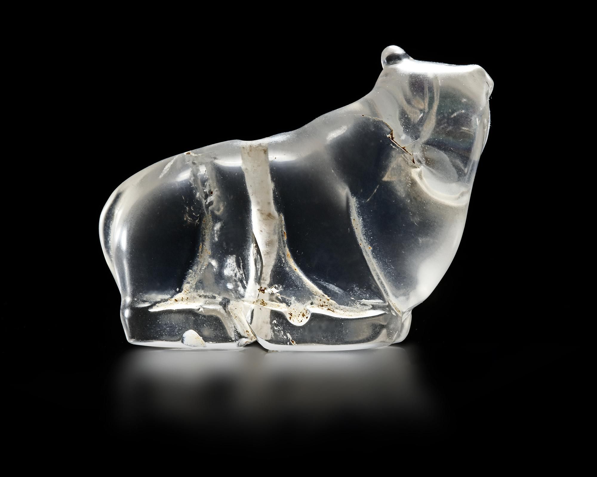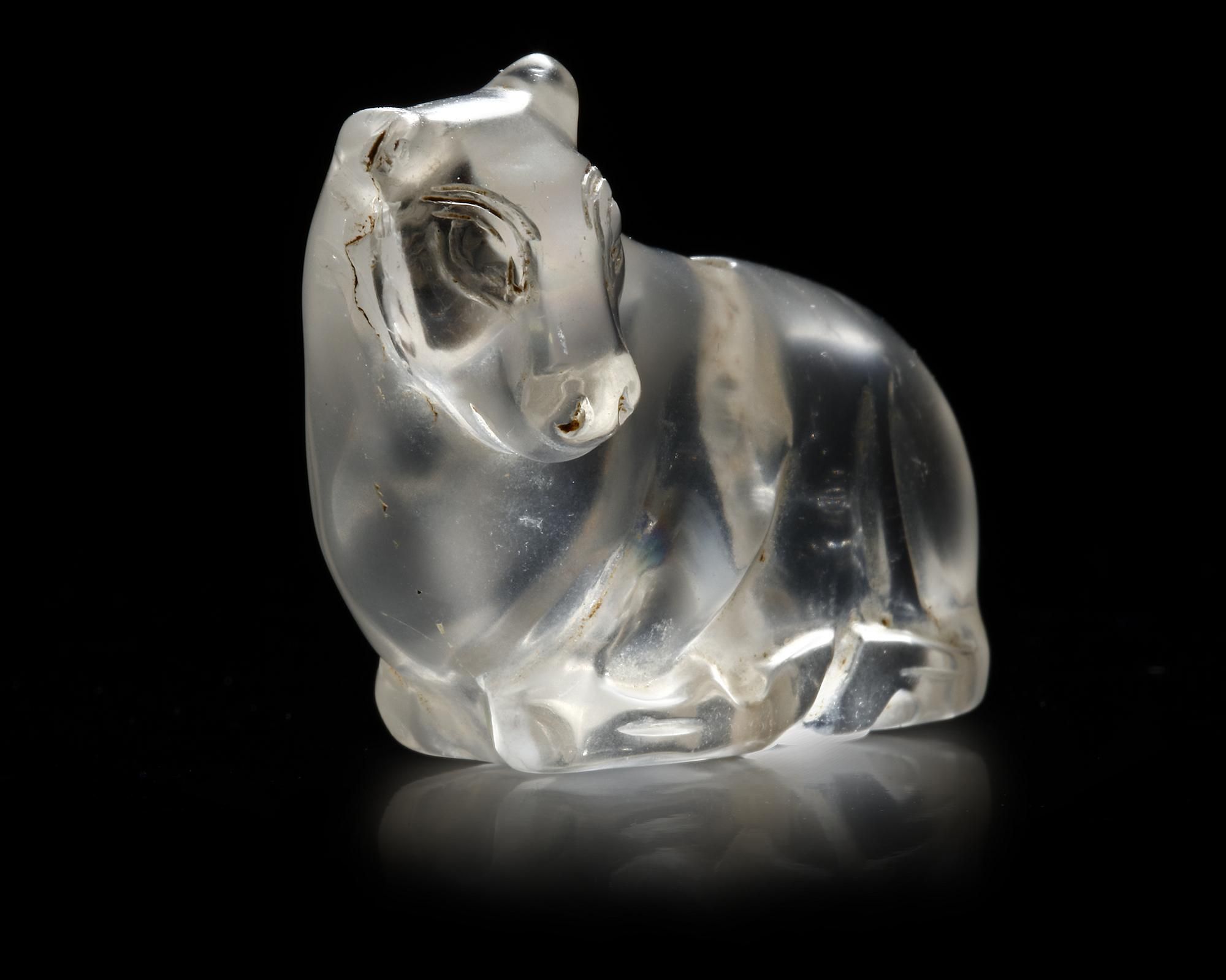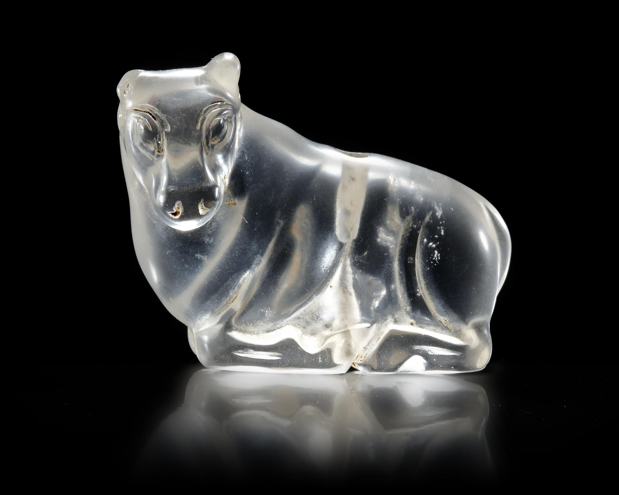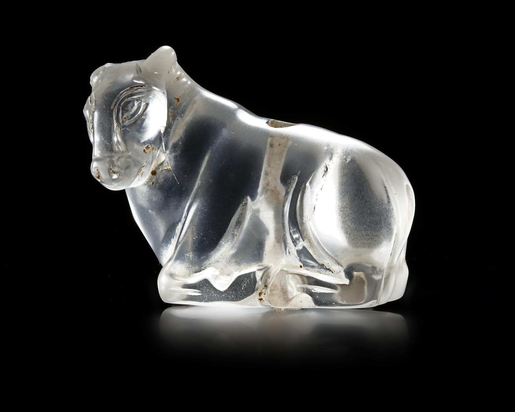A Near Eastern rock crystal bull reclining with its legs folded under the body with head turned left to the viewer. Drilled through from both sides from top to bottom in the middle. Well carved and very realistic.